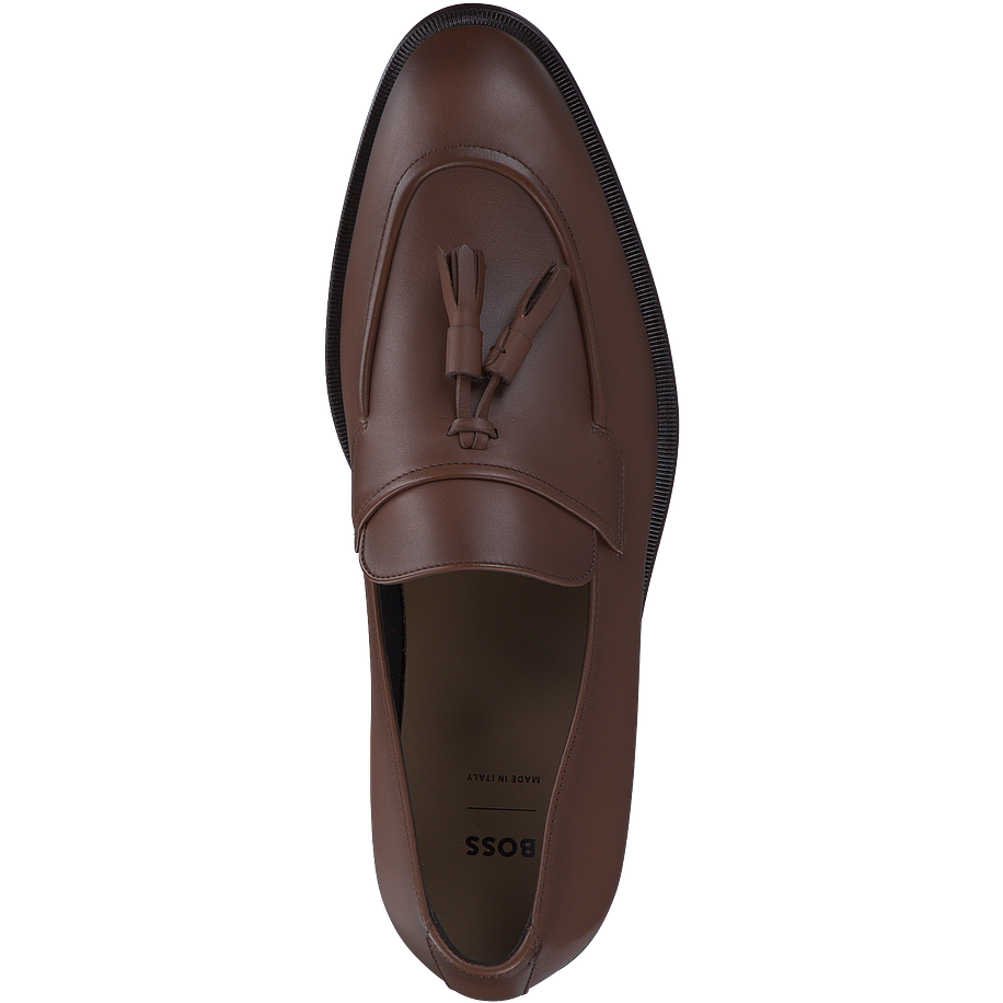 Entdecken Sie den DERREK Slipper von Boss, ein elegantes Schuhwerk für Herren. Dieser braune Slipper ist aus hochwertigem Leder gefertigt, das sowohl für das Obermaterial als auch für das Innenfutter und die Innensohle verwendet wird. Die Sohle besteht aus einer Kombination von Leder und Gummi, die für zusätzliche Haltbarkeit und Komfort sorgt. Mit einer Absatzhöhe von 2 cm bietet dieser Schuh eine dezente Erhöhung, ohne den Komfort zu beeinträchtigen. Ein besonderes Merkmal dieses Modells sind die stilvollen Troddeln, die einen Hauch von Raffinesse hinzufügen.