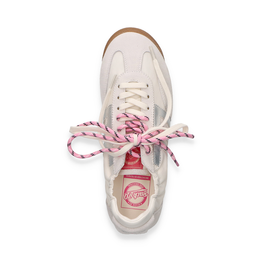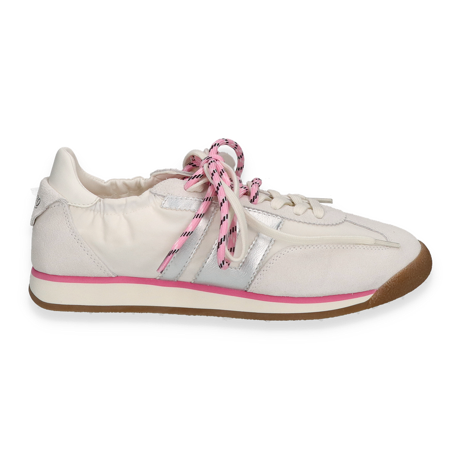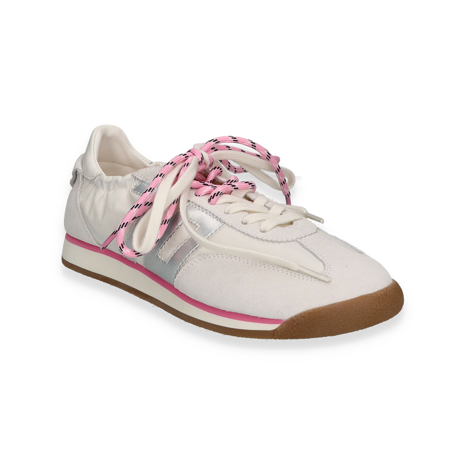 Entdecken Sie den Sneaker ROCKET von Back 70, ein stilvolles und modernes Schuhwerk für Damen. In einer ansprechenden Kombination aus Weiß und Pink präsentiert sich dieser Sneaker mit einem einzigartigen Design. Die auffälligen, rosa-weiß gestreiften Schnürsenkel verleihen dem Schuh einen frischen und dynamischen Look. Die dezente, pinke Linie entlang der Sohle setzt einen modischen Akzent, während die Gummisohle für einen sicheren Halt sorgt.