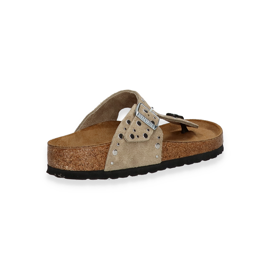 Entdecken Sie die stilvolle Eleganz der Birkenstock GIZEH RIVET BORDER Zehentrenner in einem ansprechenden hellbraunen Farbton. Diese für Damen entworfenen Sandalen vereinen Komfort und modisches Design mit einer auffälligen Nietenverzierung, die jedem Outfit einen Hauch von Raffinesse verleiht. Der verstellbare Riemen sorgt für eine individuelle Passform, während die robuste Gummisohle sicheren Halt bietet.