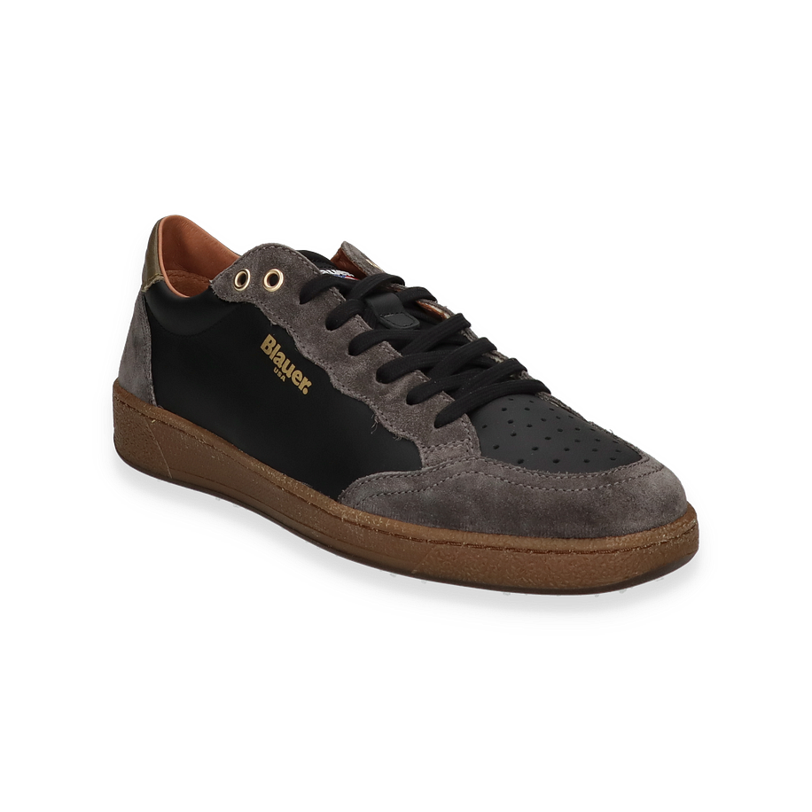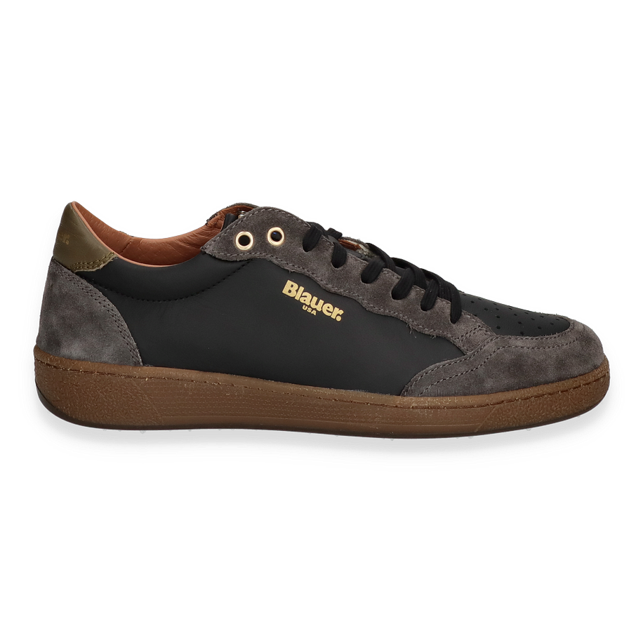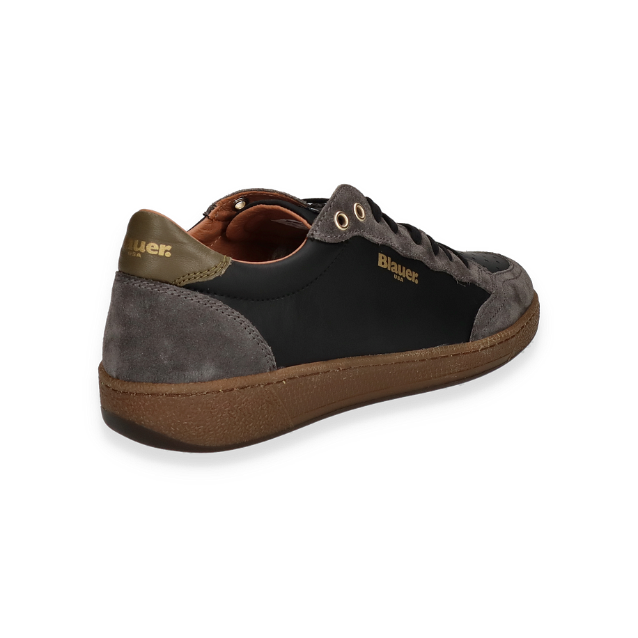 Der Blauer MURRAY Sneaker für Herren präsentiert sich in einer eleganten Kombination aus Schwarz und Dunkelgrau. Das Design besticht durch seine harmonische Verbindung von Leder und Textil, die dem Schuh eine raffinierte Optik verleiht. Die goldenen Akzente und die sorgfältig platzierten Ösen unterstreichen den hochwertigen Look. Der Sneaker bietet eine sportliche Silhouette, die sich ideal für den urbanen Alltag eignet und gleichzeitig Komfort und Stil vereint.