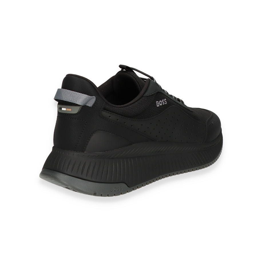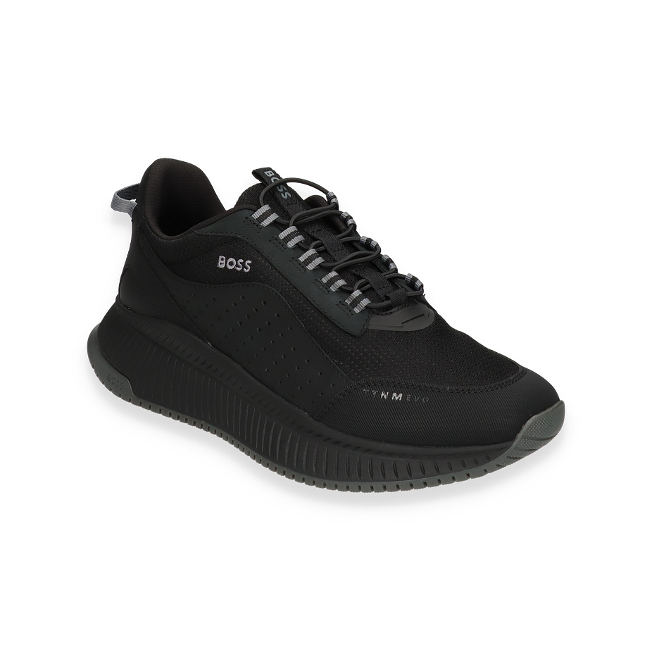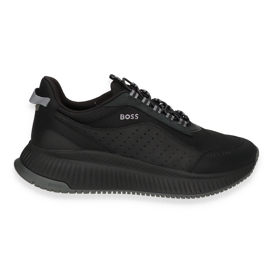 Preis inkl. MwSt.Entdecken Sie den eleganten BOSS Sneaker in klassischem Schwarz, der durch sein modernes Design und die hochwertige Verarbeitung überzeugt. Der Schuh kombiniert Leder und Textil im Obermaterial, was ihm eine raffinierte und zugleich sportliche Optik verleiht. Die dezente BOSS-Logo-Prägung und die durchdachten Details unterstreichen den stilvollen Charakter dieses Sneakers für Herren. Die robuste Gummisohle sorgt für optimalen Halt und ergänzt das zeitlose Design perfekt.