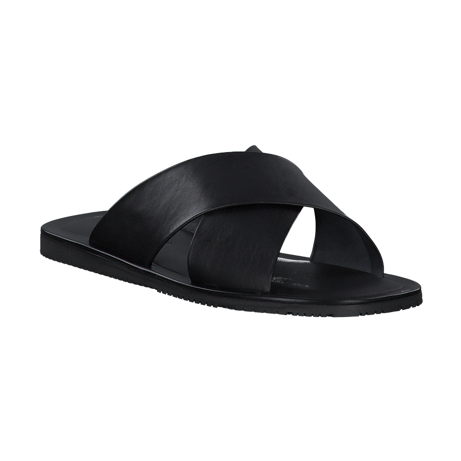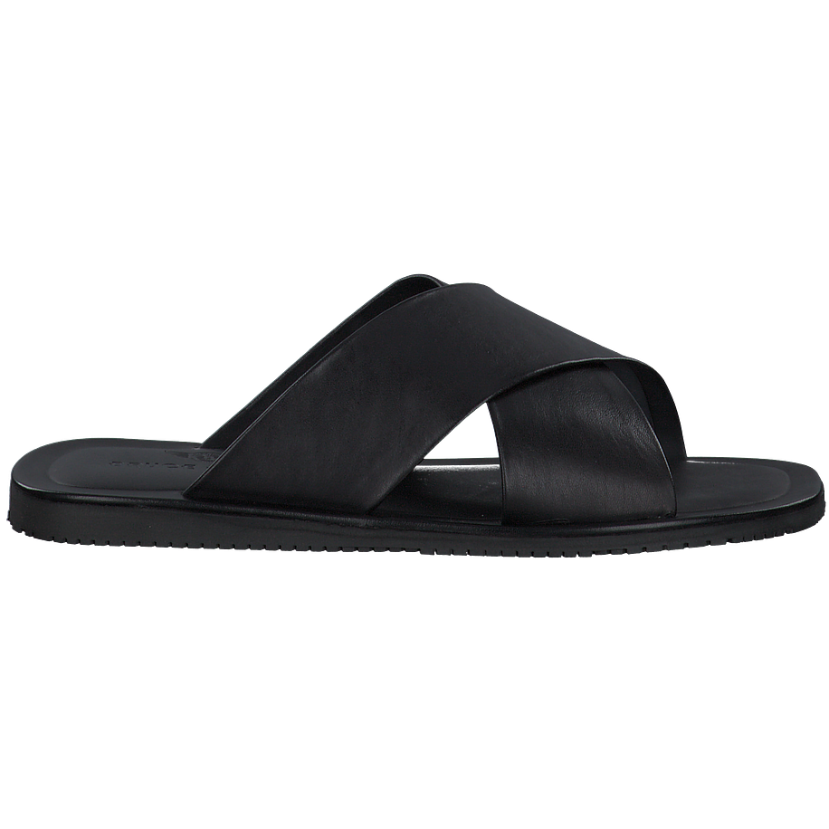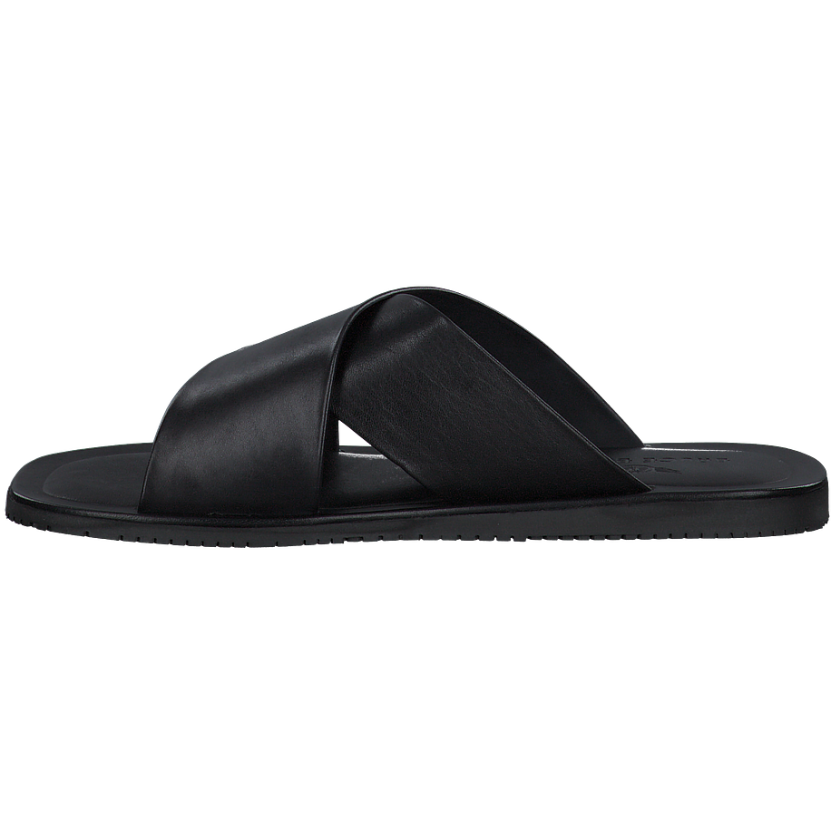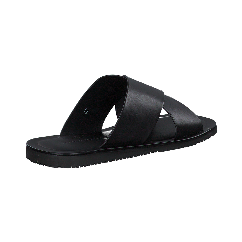 Preis inkl. MwSt.Praktische Herrenschuhe für die warme Jahreszeit - diese tollen Bruce Brown Pantoletten für Herren eignen sich bestens, um Sie im Sommer bequem und modisch durch den Tag zu bringen. Die Herrenschuhe sind aus butterweichem hochwertigem Leder gefertigt, welches in einem klassischen Schwarz daherkommt und so viel Raum für kreative Looks lässt. Die sich überkreuzenden breiten Riemen versprechen einen guten Halt in den Schuhen und sorgen auch optisch für einen modernen Twist. Auf den robusten Gummisohlen können Sie bequem gehen und sind zugleich vor einem Ausrutschen auf glattem Untergrund geschützt.