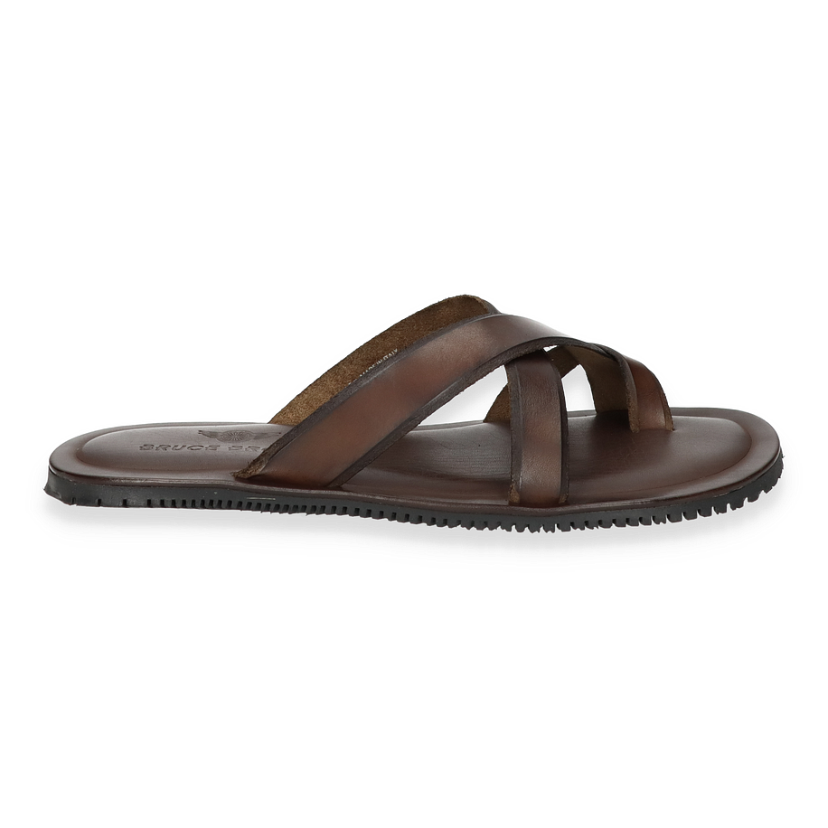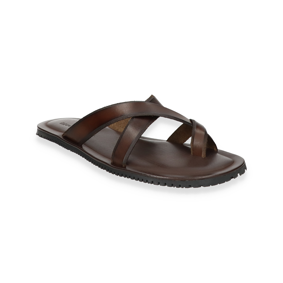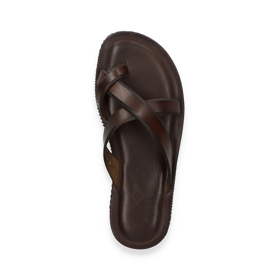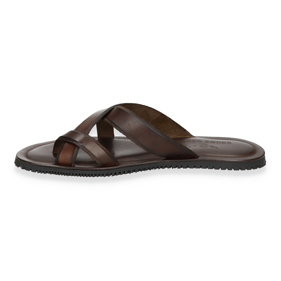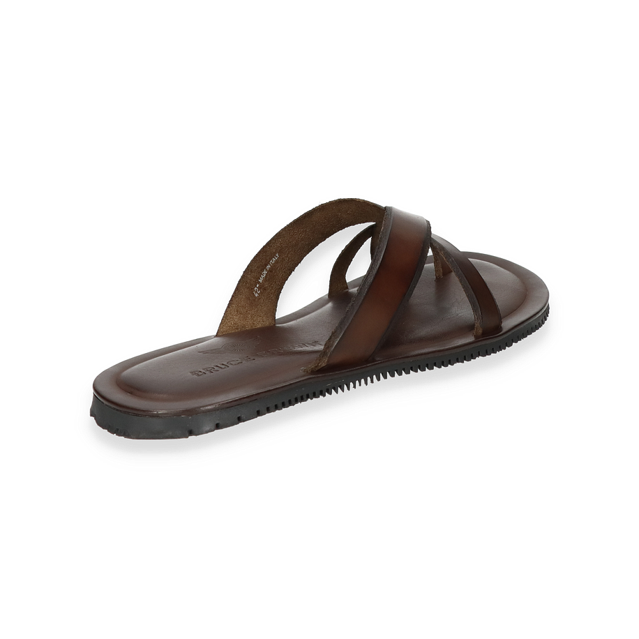 Entdecken Sie die eleganten Pantoletten von Bruce Brown in einem tiefen Dunkelbraun, die durch ihr schlichtes und dennoch raffiniertes Design bestechen. Diese für Herren entworfenen Schuhe bieten einen stilvollen Look, der sich ideal für entspannte Sommerabende oder einen lässigen Tagesausflug eignet. Die überkreuzten Lederriemen verleihen den Pantoletten eine zeitlose Ästhetik und sorgen für einen sicheren Sitz.