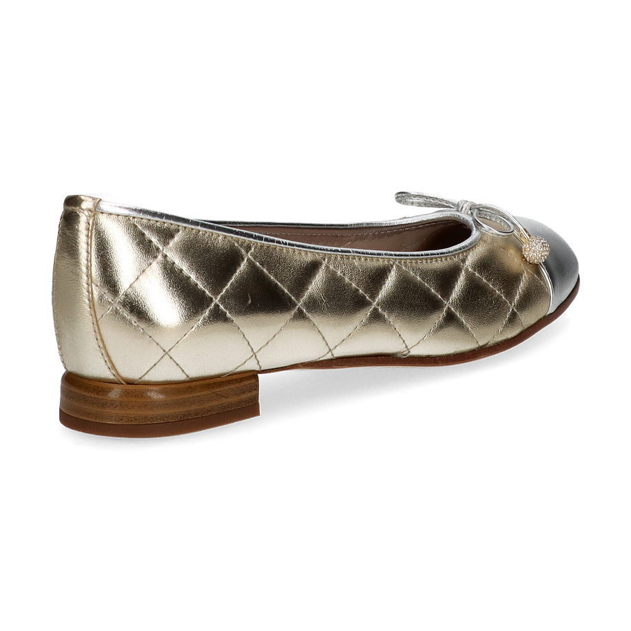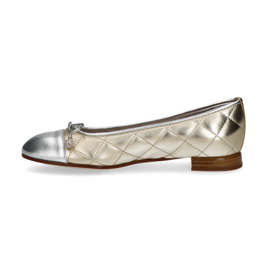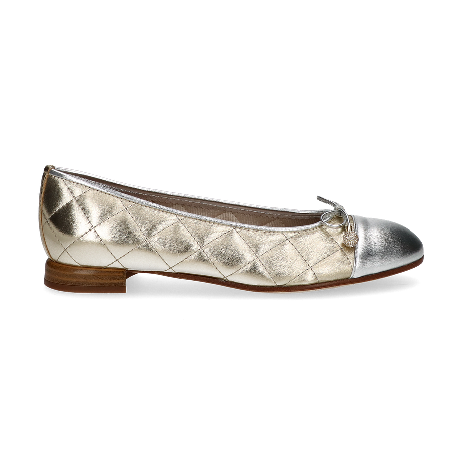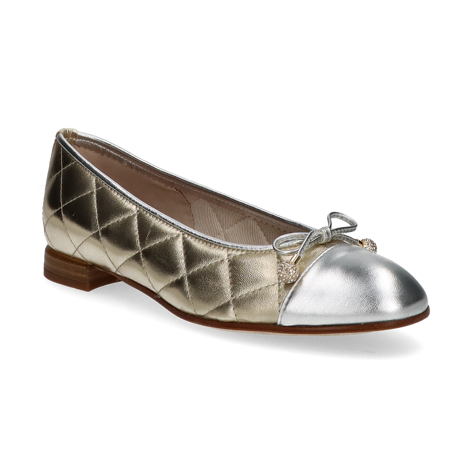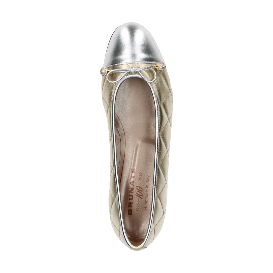 Entdecken Sie die eleganten Ballerinas von Brunate, die mit ihrem raffinierten Design in Gold und Silber bestechen. Diese Schuhe für Damen vereinen stilvolle Eleganz mit einem Hauch von Glamour. Das Obermaterial aus hochwertigem Leder präsentiert sich in einem glänzenden, gesteppten Muster, das durch die kontrastierende silberne Kappe und die zarte Schleife akzentuiert wird. Der flache Absatz von 1,5 cm sorgt für einen komfortablen Auftritt, während die subtile Farbgebung vielseitig kombinierbar ist.