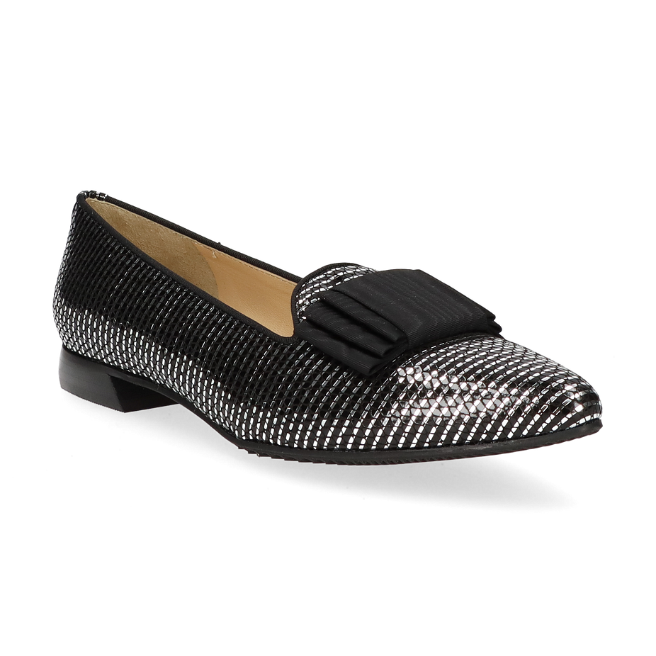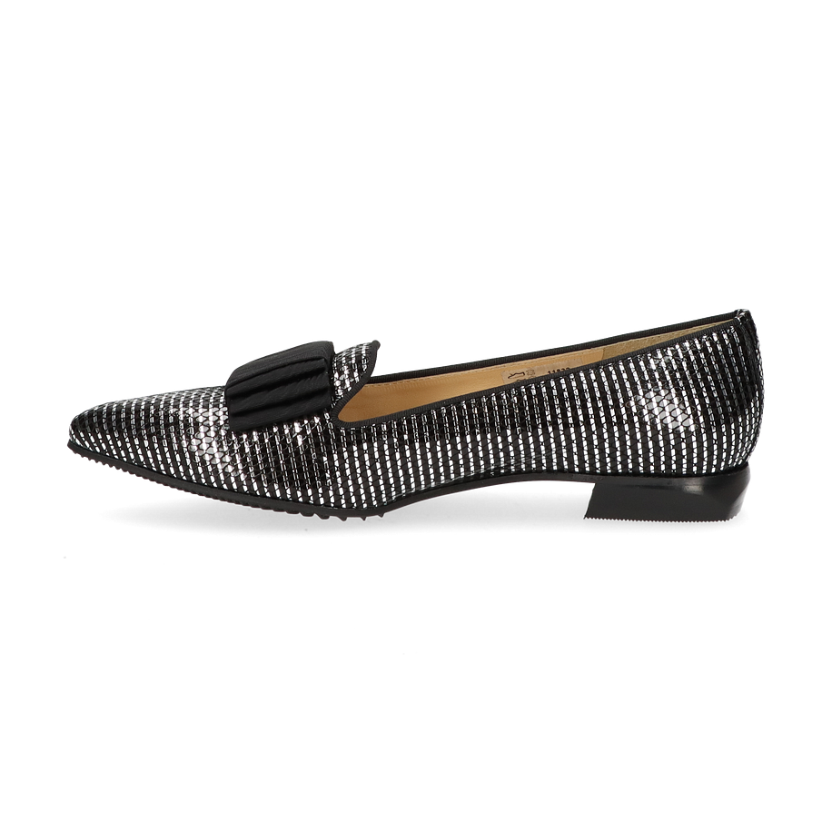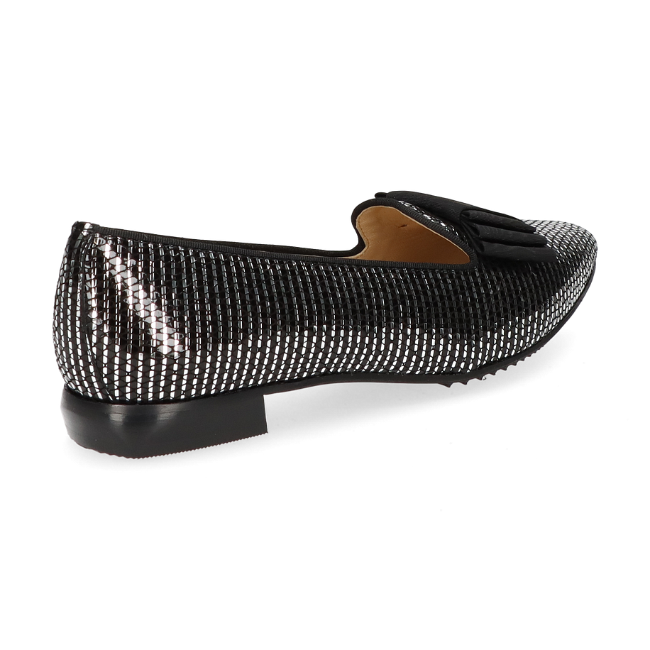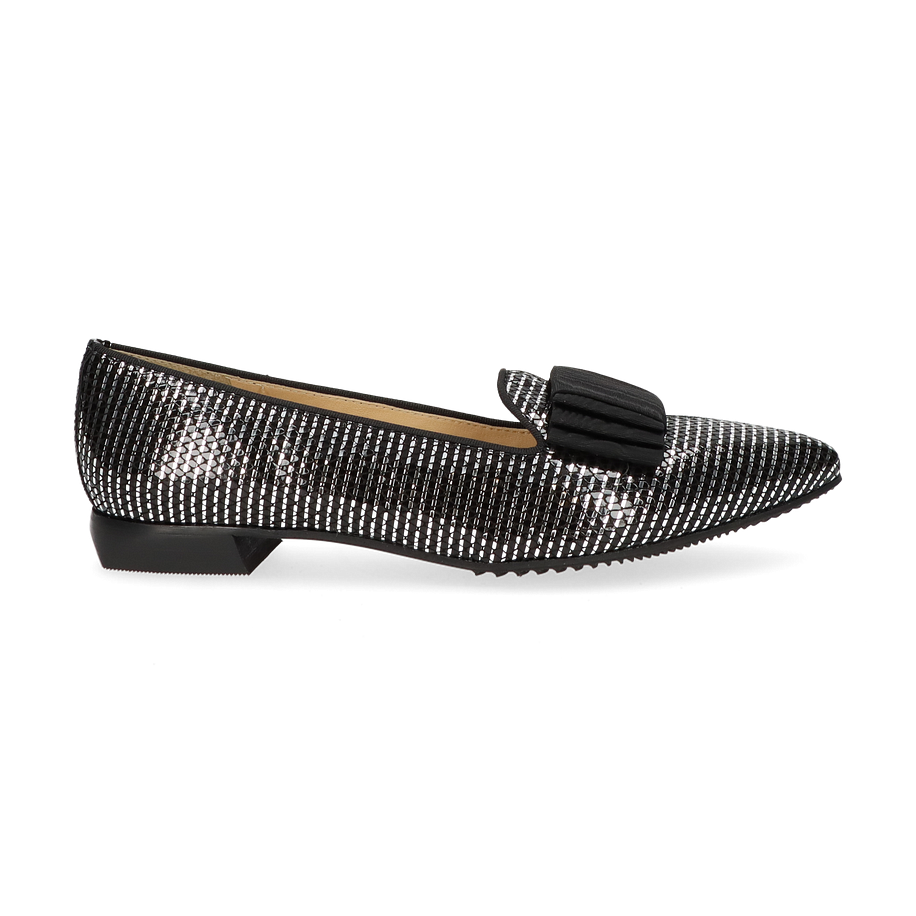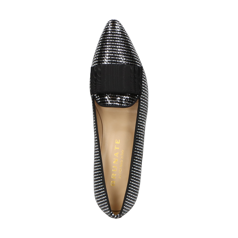 Entdecken Sie den eleganten Slipper von Brunate für Damen, der in einem faszinierenden Silber/Schwarz-Design erstrahlt. Dieser Schuh kombiniert stilvolle Raffinesse mit einem modernen Touch und ist ideal für anspruchsvolle Anlässe. Das Obermaterial aus hochwertigem Leder verleiht dem Schuh einen luxuriösen Glanz, während die dezente Schleifenapplikation auf der Vorderseite einen Hauch von Eleganz hinzufügt. Der flache Absatz von 1,5 cm sorgt für Komfort und einen sicheren Auftritt.