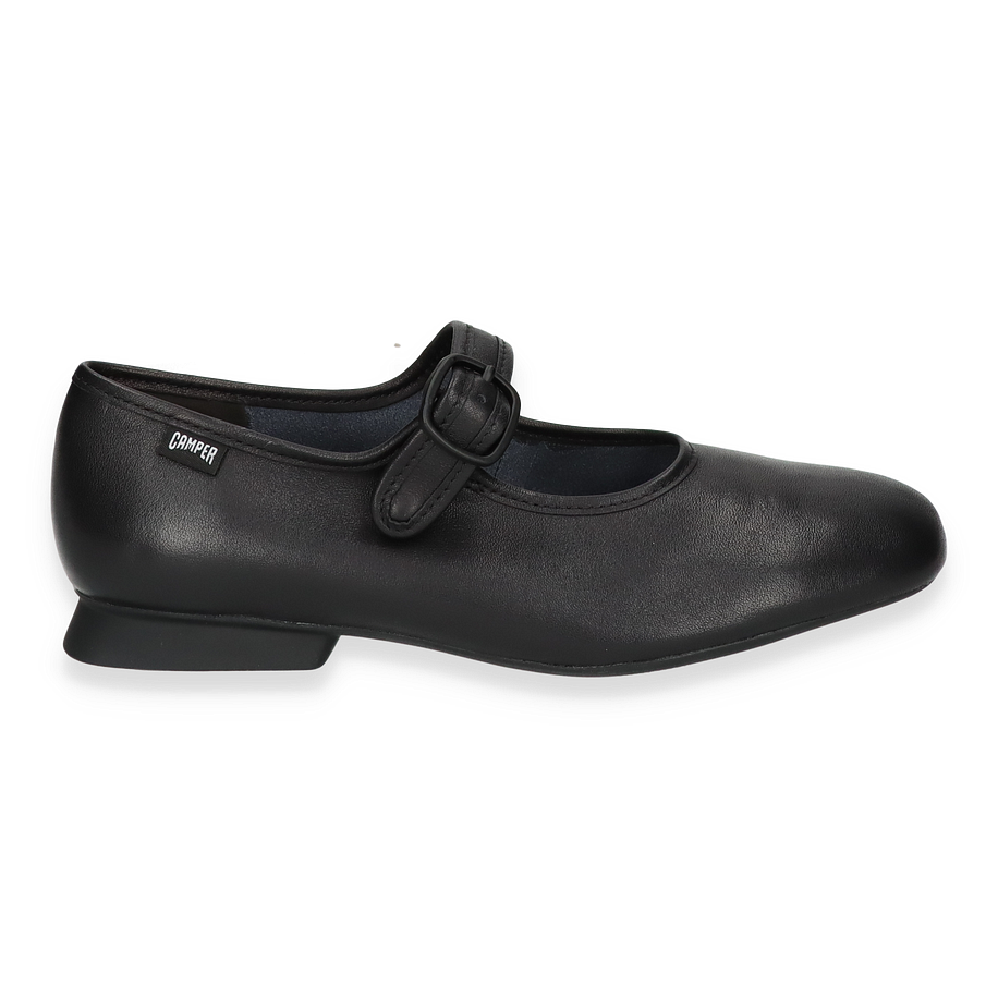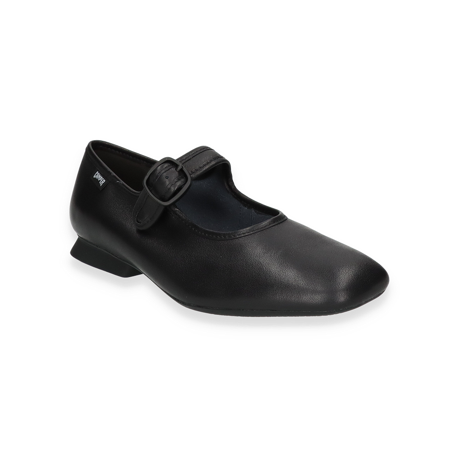 Die CASI MYRA Ballerinas von Camper präsentieren sich in einem eleganten Schwarz und verkörpern zeitlose Eleganz für Damen. Das minimalistische Design mit einem dezenten Riemen und einer Schnalle verleiht dem Schuh eine klassische Note, während die hochwertige Verarbeitung aus Leder einen luxuriösen Touch bietet. Der flache Absatz von 1,5 cm sorgt für optimalen Tragekomfort und macht diese Ballerinas zu einem vielseitigen Begleiter für verschiedene Anlässe.