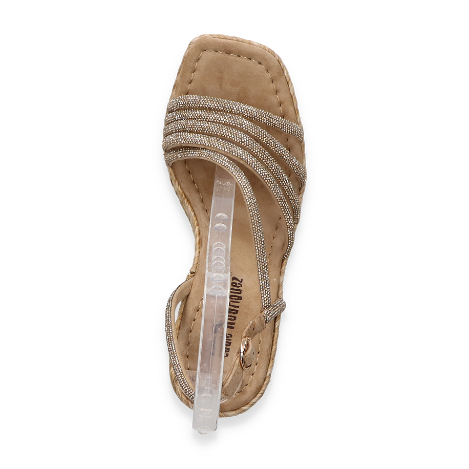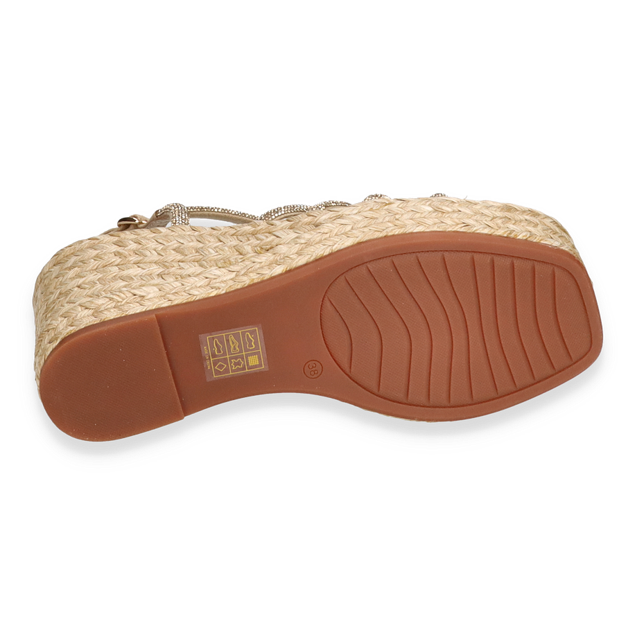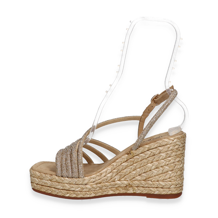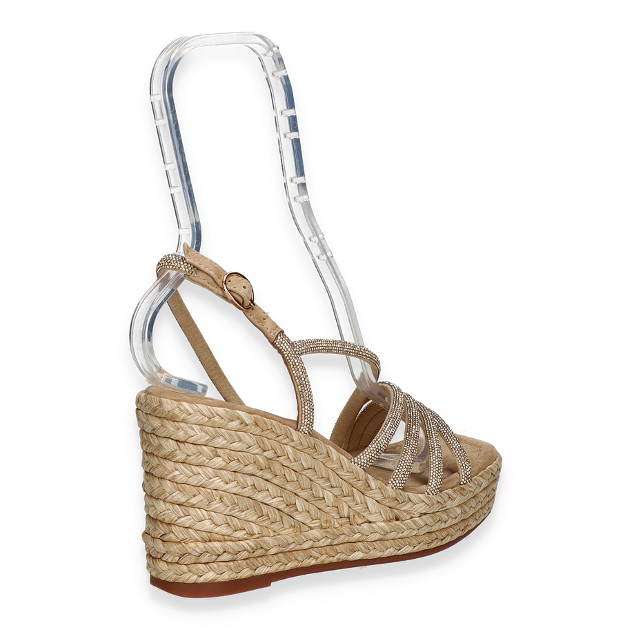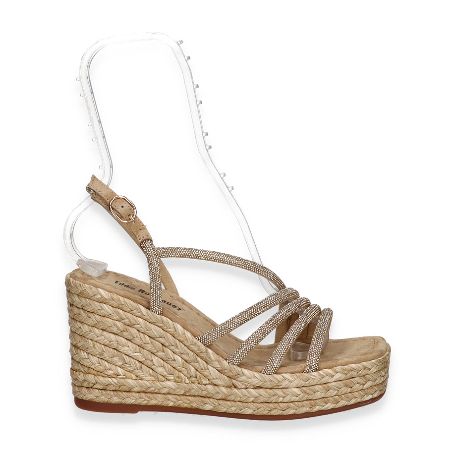 Preis inkl. MwSt.Entdecken Sie die eleganten Sandaletten von Eddie Rodriguez, die mit ihrem stilvollen Design in Beige beeindrucken. Diese für Damen entworfenen Sandalen zeichnen sich durch ihre kunstvoll geflochtene Plateau-Sohle aus, die einen Hauch von Raffinesse und sommerlicher Leichtigkeit verleiht. Die zarten Riemen aus Textilmaterial umschmeicheln den Fuß und sorgen für einen sicheren Halt, während der 9,5 cm hohe Keilabsatz Ihre Silhouette elegant verlängert.
