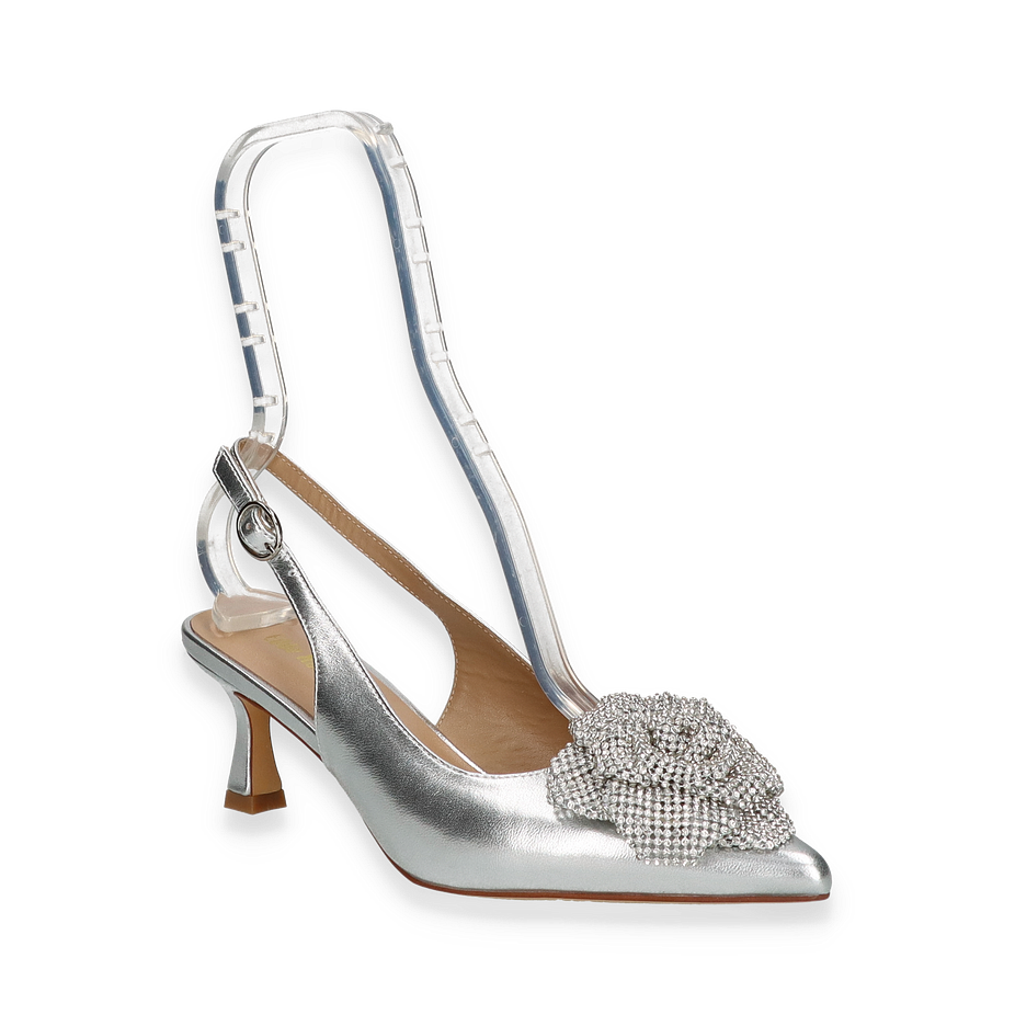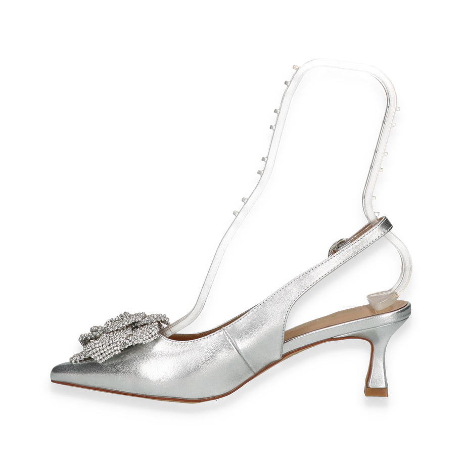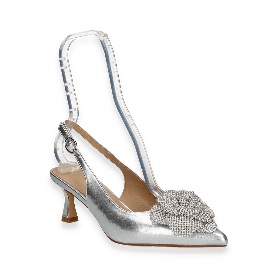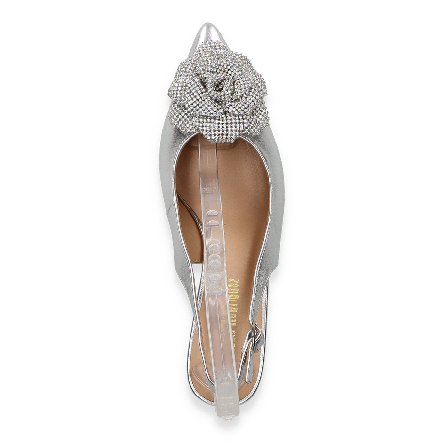 Preis inkl. MwSt.Diese eleganten Slingpumps für Damen vereinen Stil und Raffinesse auf eindrucksvolle Weise. Das silberne Metallic-Finish verleiht dem Schuh einen glamourösen Touch, während der funkelnde, mit Strasssteinen besetzte Blumenapplikation auf der Vorderseite einen luxuriösen Akzent setzt. Der schmale Absatz sorgt für eine feminine Silhouette und bietet gleichzeitig einen stabilen Halt. Der offene Fersenbereich mit verstellbarem Riemen garantiert eine perfekte Passform und unterstreicht das modische Design.
