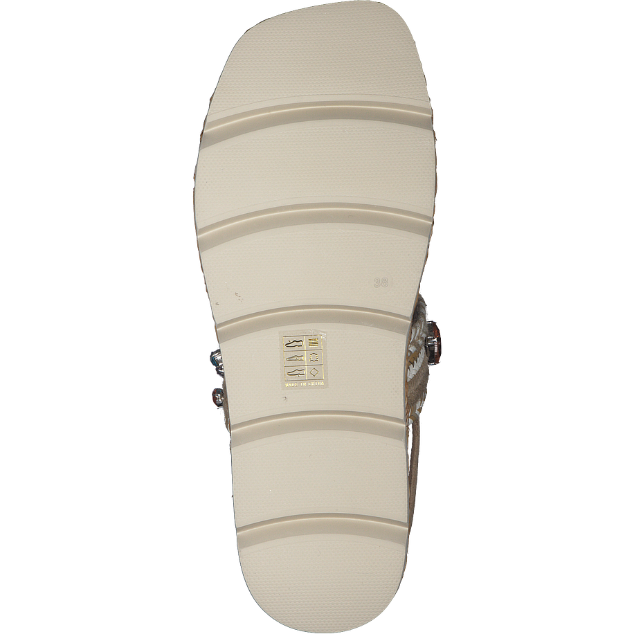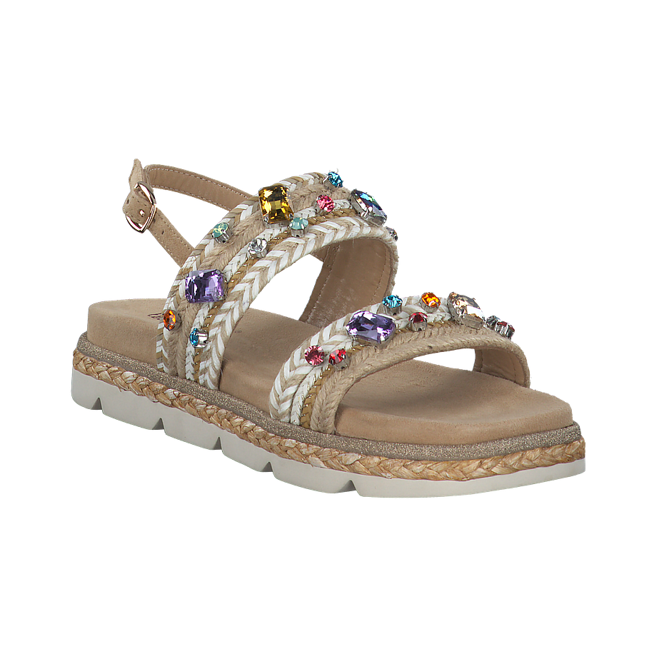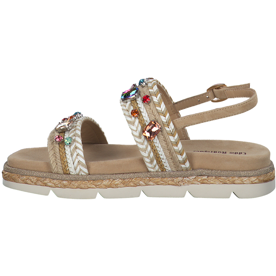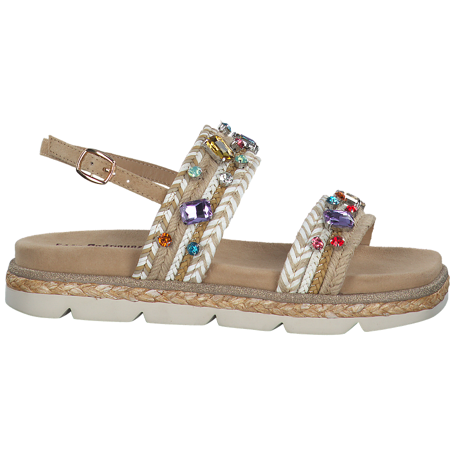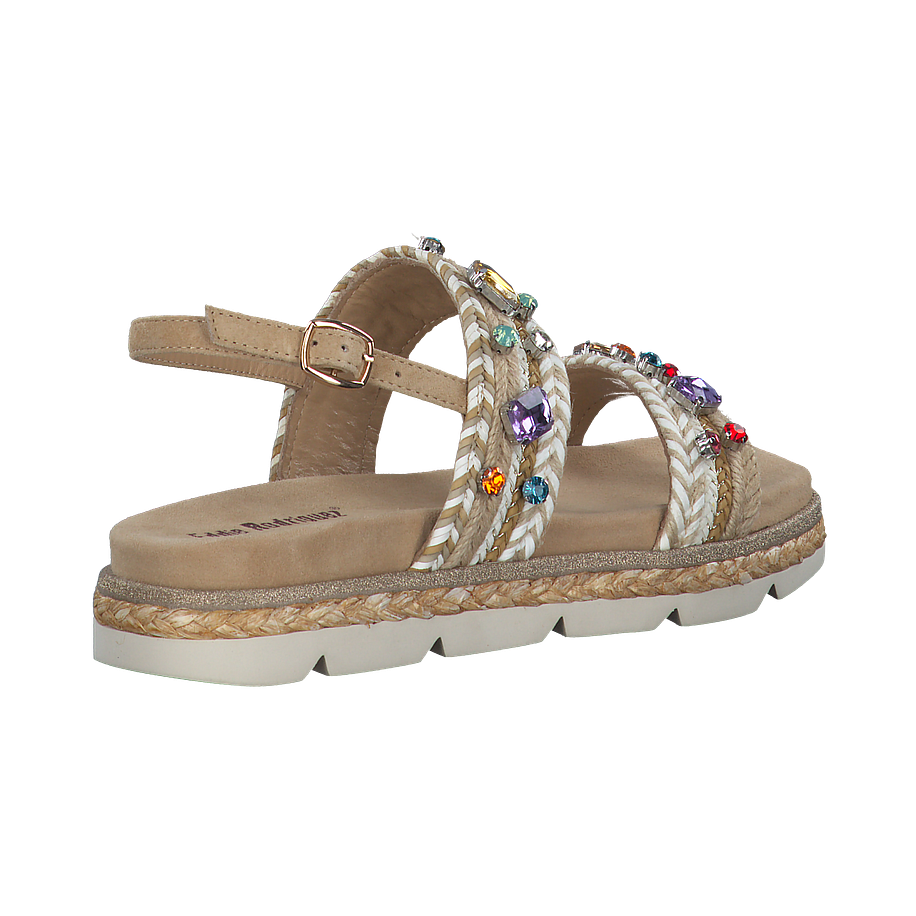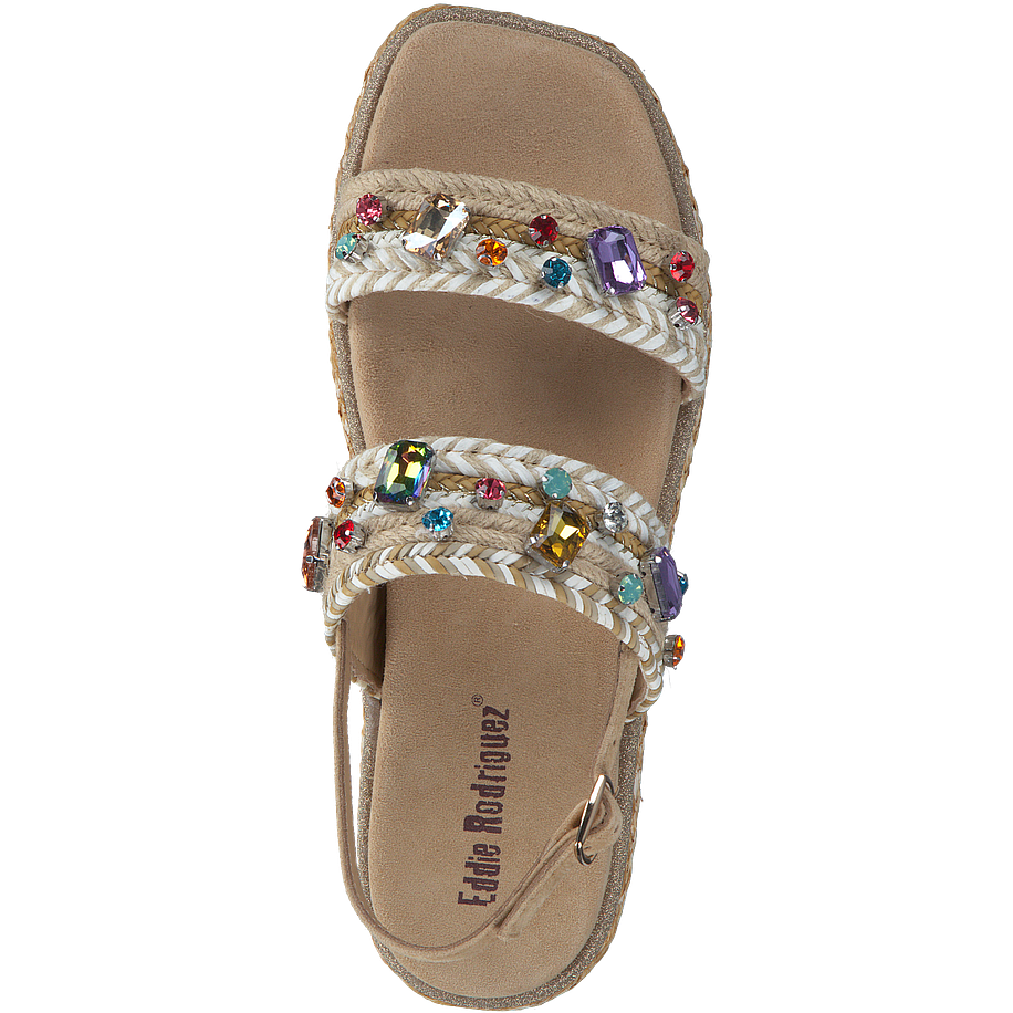 Außergewöhnliche Schuhe mit atemberaubendem Wow-Effekt! Diese tollen Eddie Rodriguez Sandalen für Damen wirken zunächst sehr elegant und clean, da die hochwertigen Materialien, aus welchen die Schuhe gefertigt wurden, in einem sanften Beige daherkommen und so viele gelungene Outfitkombinatinen im Alltag versprechen. Bei näherer Betrachtung fallen allerdings die zahlreichen Verzierungen auf, wie etwa die bunten schimmernden Schmucksteine auf den Riemchen oder die golden glitzernde Absetzung über der Sohle. Diese machen die beigen Eddie Rodriguez Sandalen zu absolut luxuriösen und femininen Begleitern in der Freizeit.