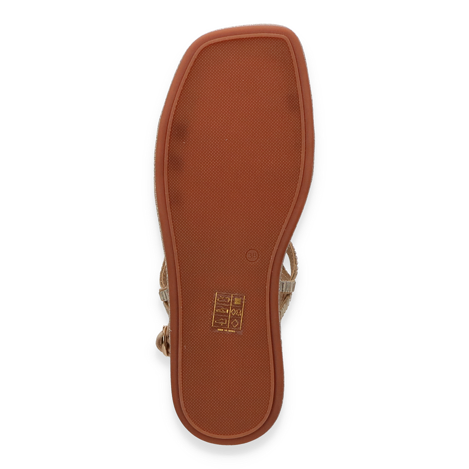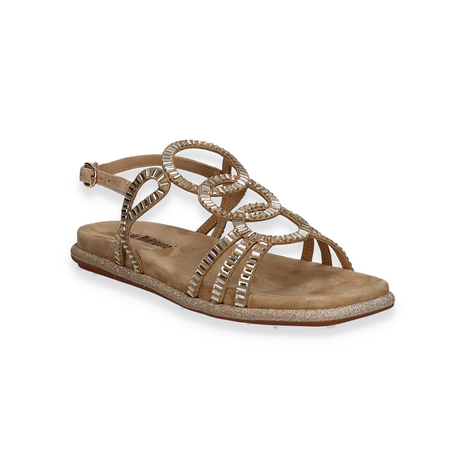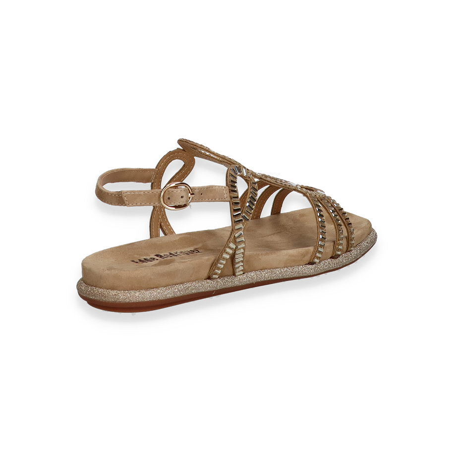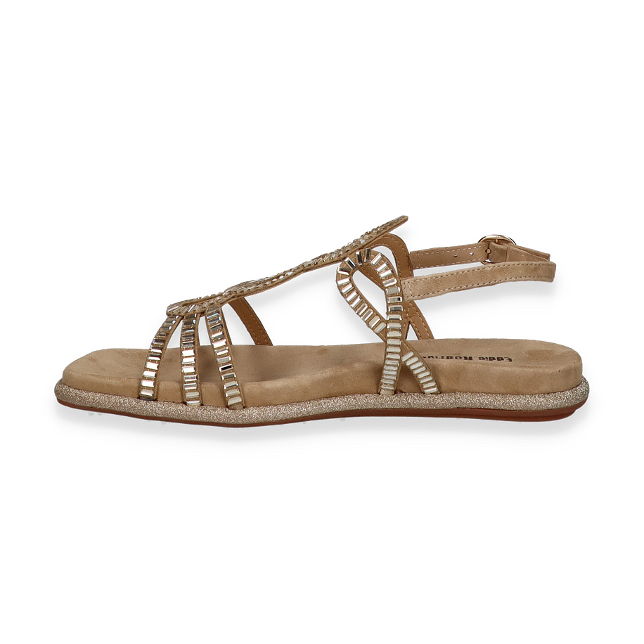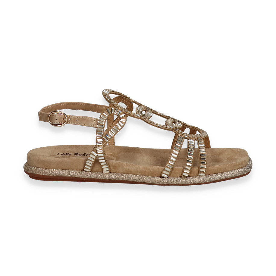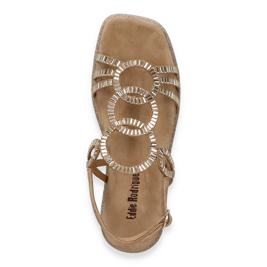 Die Eddie Rodriguez Sandalen für Damen präsentieren sich in einem eleganten Beige und sind mit funkelnden, kreisförmigen Verzierungen versehen, die jedem Outfit einen Hauch von Glamour verleihen. Der offene Zehenbereich und die filigranen Riemen sorgen für eine luftige und stilvolle Optik, ideal für warme Tage. Der verstellbare Knöchelriemen bietet zusätzlichen Halt und Komfort, während die glitzernde Sohle einen dezenten Schimmer hinzufügt.