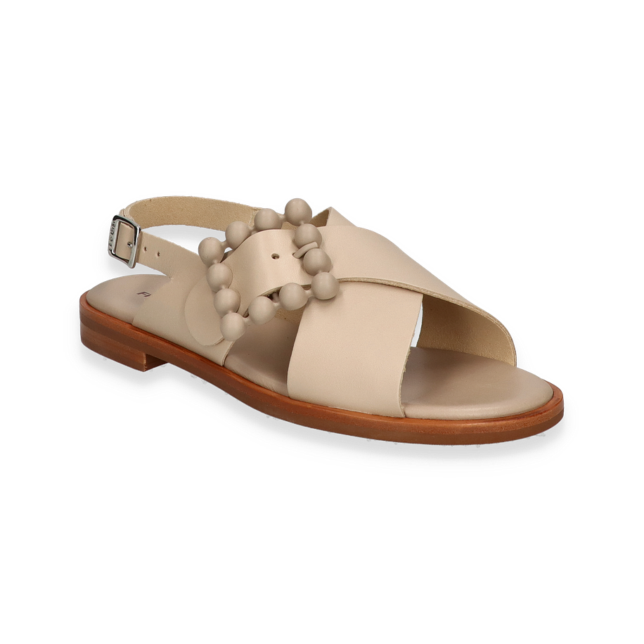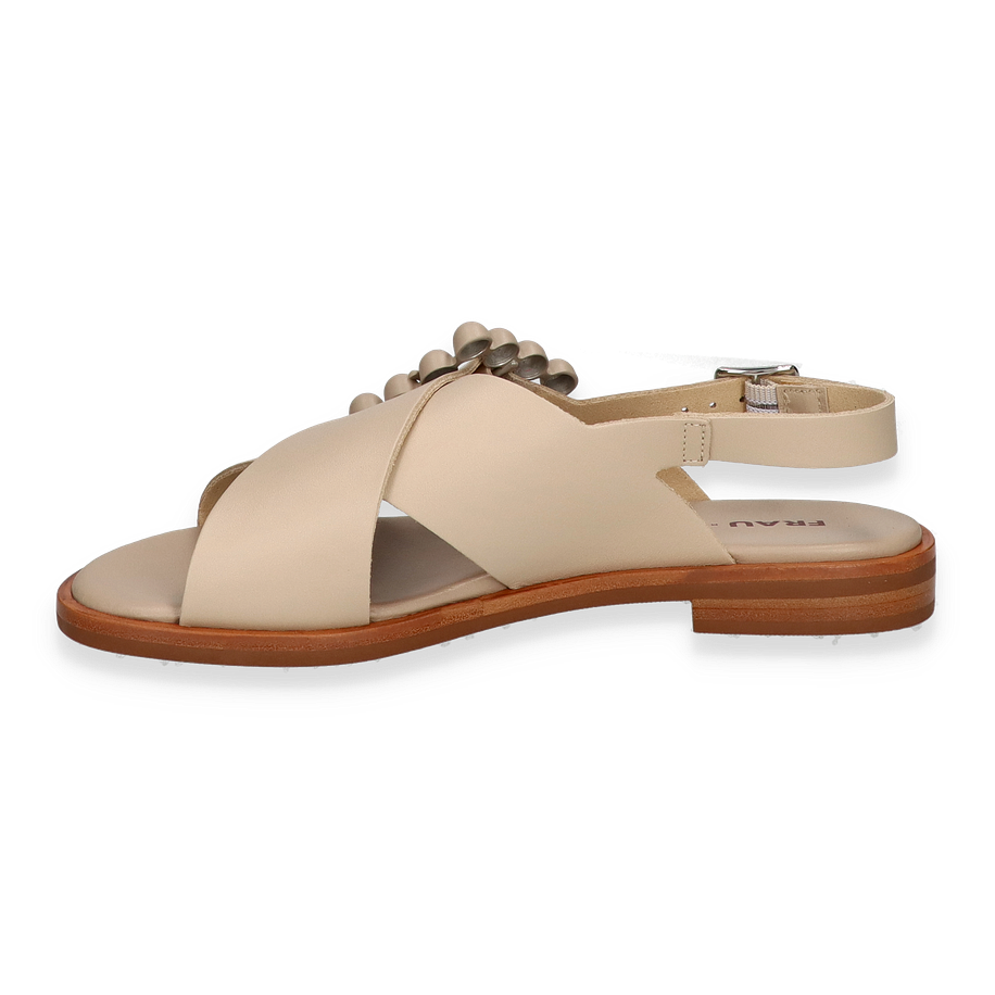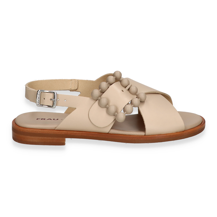 Entdecken Sie die eleganten Sandalen von FRAU in einem zarten Beige-Ton, perfekt für Damen, die Stil und Komfort schätzen. Diese Sandaletten zeichnen sich durch ihr raffiniertes Design mit überkreuzten Lederbändern und dekorativen Kugeldetails aus, die jedem Outfit einen Hauch von Raffinesse verleihen. Der verstellbare Riemen sorgt für optimalen Halt und eine individuelle Passform, während die flache Sohle einen lässigen, aber dennoch eleganten Look bietet.