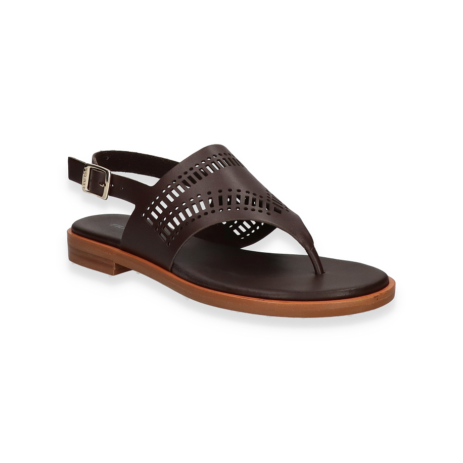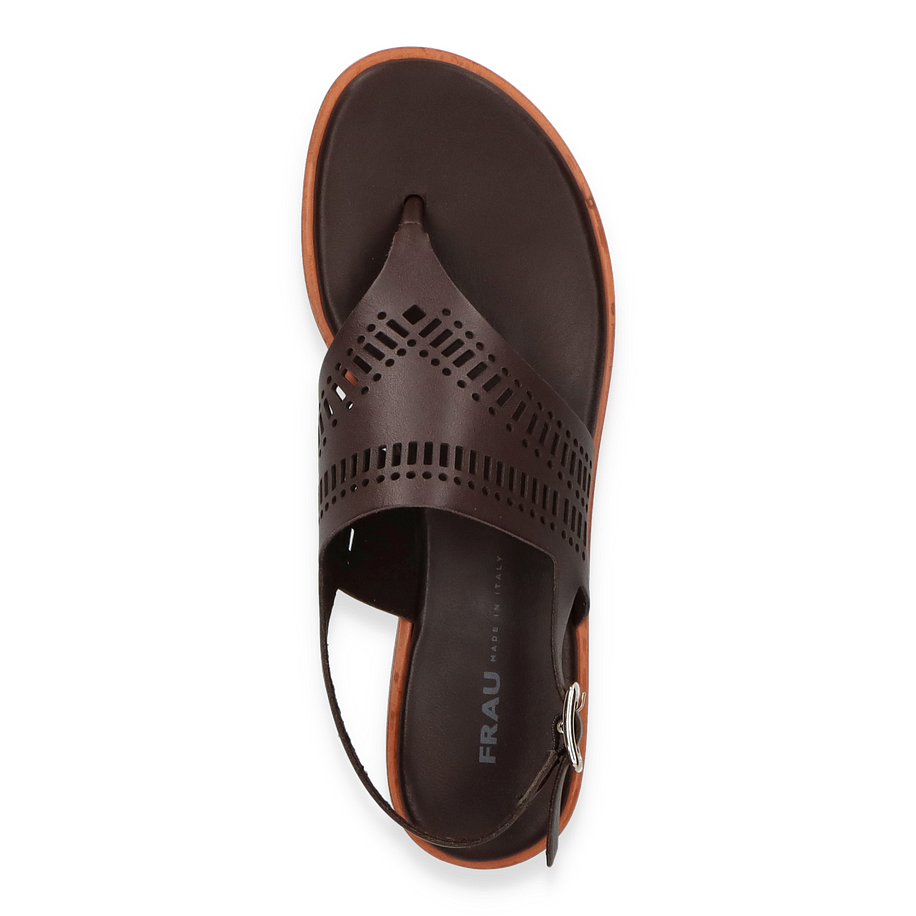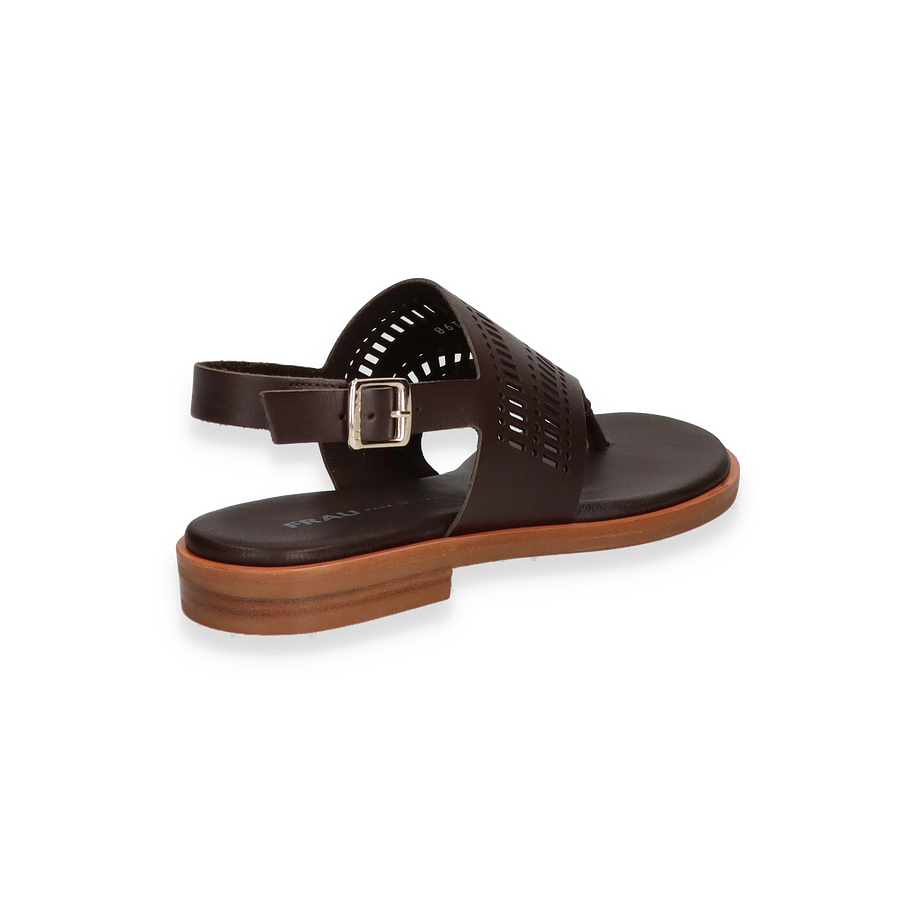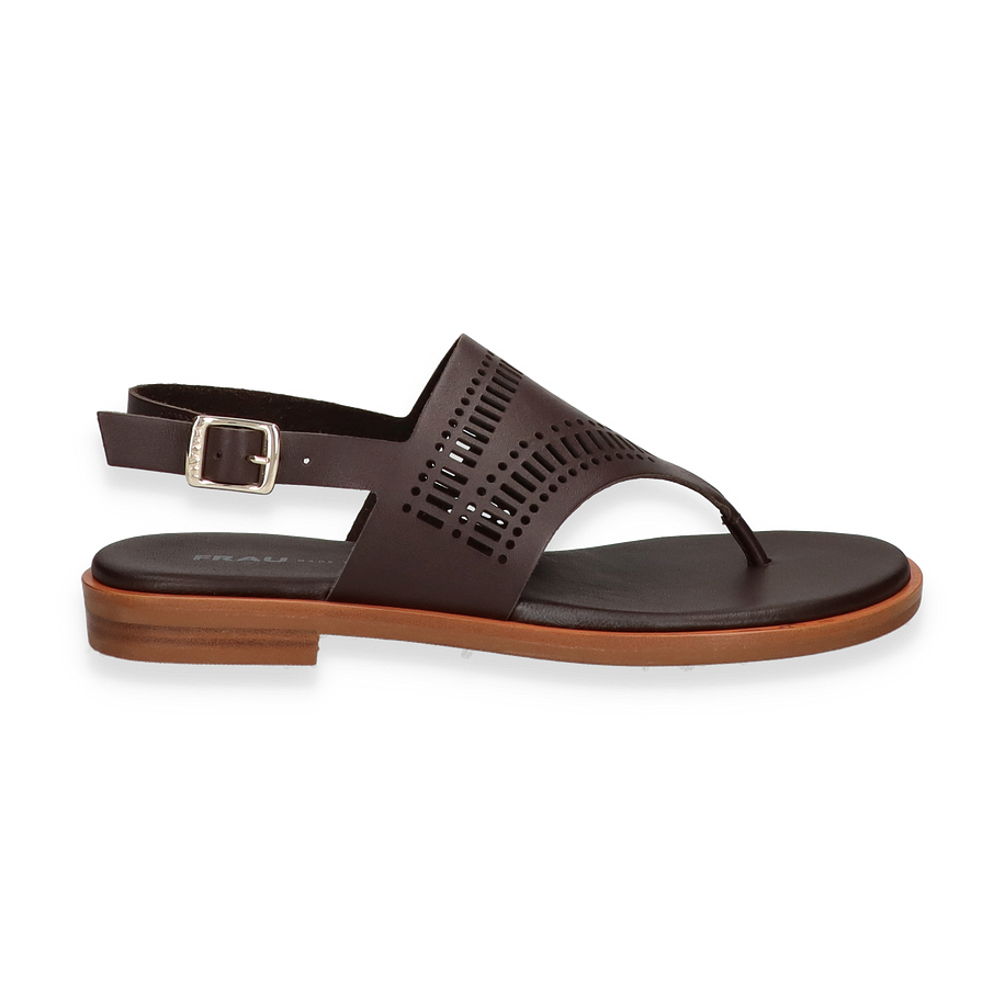 Entdecken Sie die stilvollen Zehentrenner für Damen von FRAU in elegantem Dunkelbraun. Diese Sandalen zeichnen sich durch ihr raffiniertes Design aus, das durch die kunstvoll gestalteten Aussparungen im Lederobermaterial hervorgehoben wird. Der dezente 2 cm Absatz verleiht der Sandale eine subtile Erhöhung, während der verstellbare Riemen für eine individuelle Passform sorgt. Perfekt für warme Tage, kombiniert dieses Modell Komfort mit einem Hauch von Eleganz.
