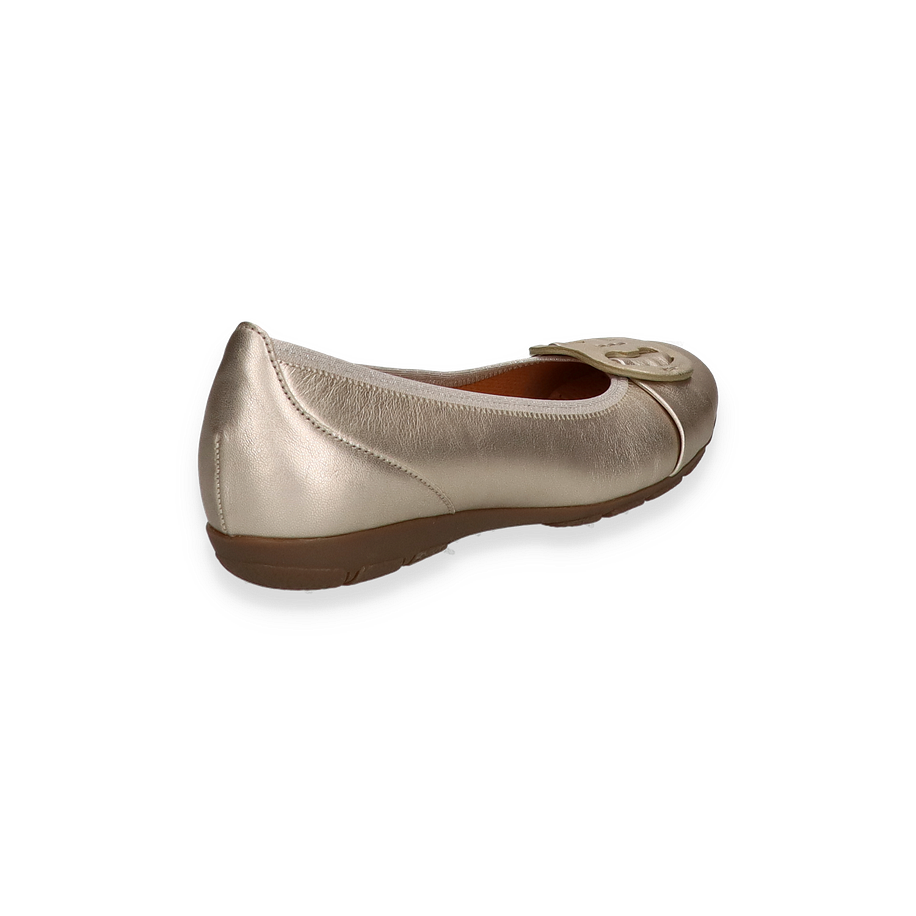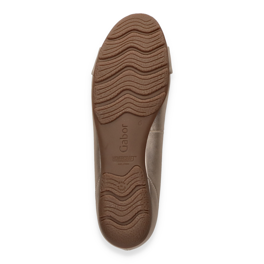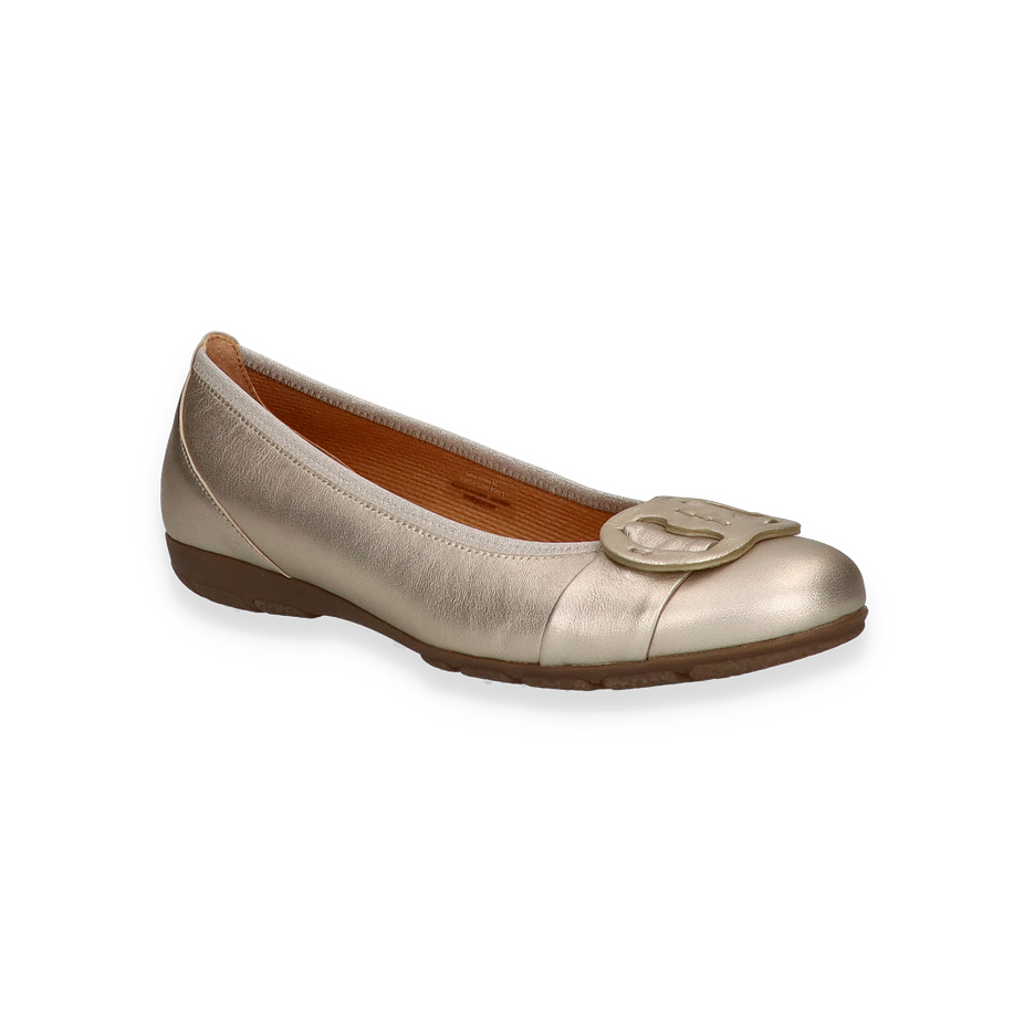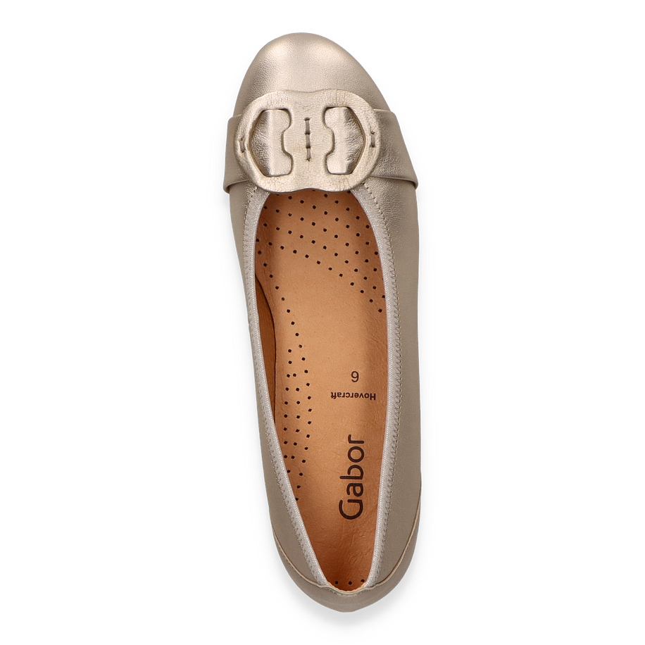 Entdecken Sie die eleganten Ballerinas von Gabor, perfekt für Damen, die Stil und Komfort schätzen. Diese Schuhe bestechen durch ihr goldfarbenes Obermaterial aus hochwertigem Leder, das einen Hauch von Luxus verleiht. Die Innensohle aus Leder und das Futter aus Leder und Textil sorgen für ein angenehmes Tragegefühl. Mit einer Absatzhöhe von 2 cm bieten diese Ballerinas eine subtile Erhöhung, ohne dabei den Komfort zu beeinträchtigen. Die robuste Gummisohle gewährleistet Langlebigkeit und Rutschfestigkeit. Ein besonderes Highlight ist die Zierschnalle, die das elegante Design abrundet.