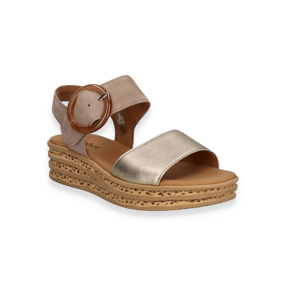Preis inkl. MwSt.Entdecken Sie die eleganten Sandalen von Gabor in einem stilvollen Braun/Bronze-Farbton. Diese Sandaletten für Damen zeichnen sich durch ein modernes Design mit einem markanten Riemen und einer auffälligen Schnalle aus, die sowohl Komfort als auch Stil bieten. Der 5 cm hohe Absatz sorgt für eine feminine Silhouette, während die sorgfältig gestaltete Sohle für Stabilität und Halt sorgt. Perfekt für sommerliche Anlässe, vereinen diese Sandalen modische Ästhetik mit funktionalem Design.
