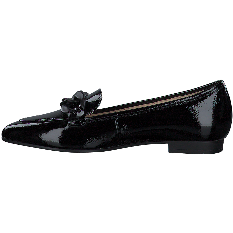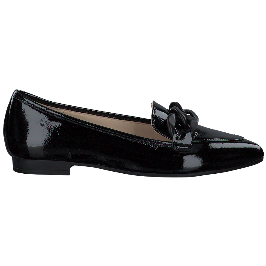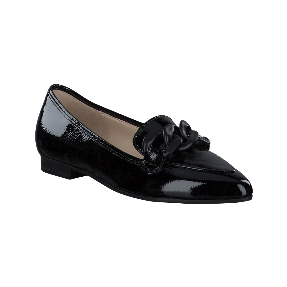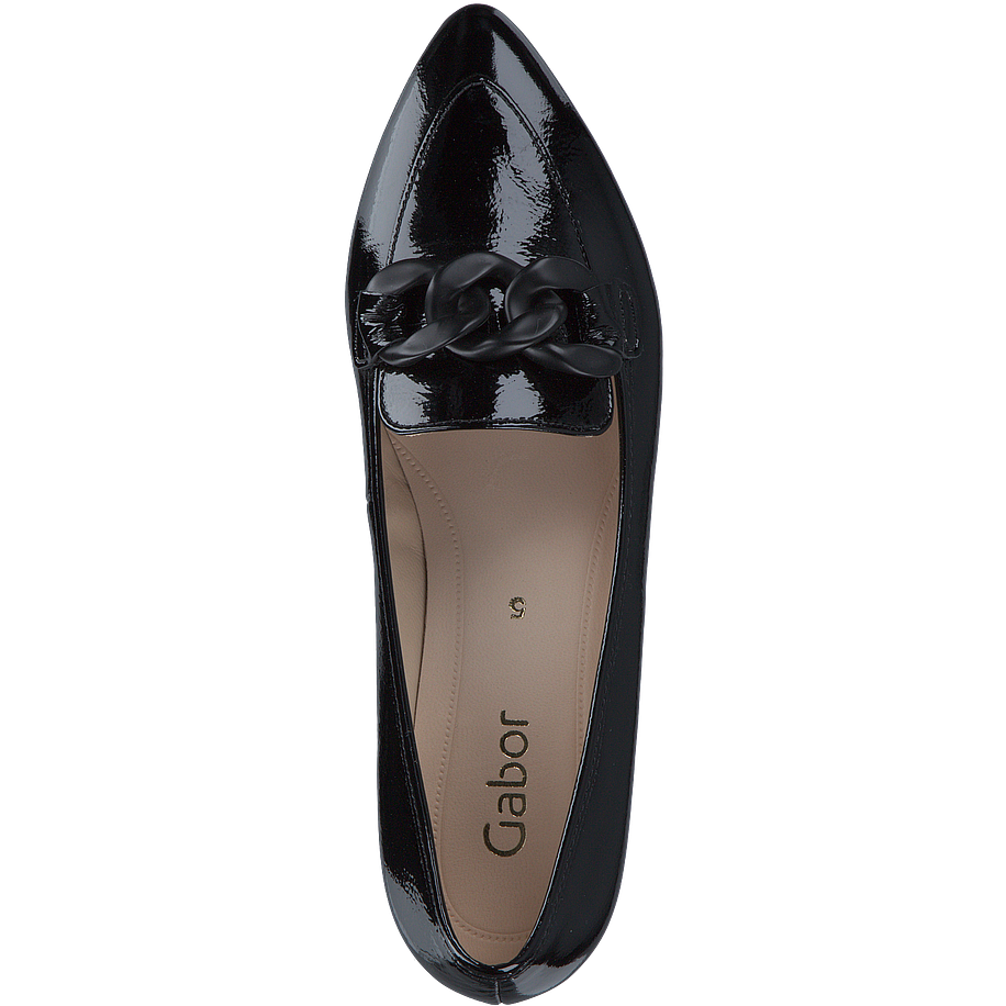 Preis inkl. MwSt.Möchten Sie Ihren smarten Bürolooks einen modernen Charme verleihen? Mit diesen tollen Gabor Slippern für Damen wird dies zum Kinderspiel! Die schicken Slipper sind aus hochwertigem schwarzem Leder gefertigt, welches dank eines Lackfinishes für einen aufregenden Hingucker sorgt. Die gedeckte Farbgebung bietet tolle Kombinationsmöglichkeiten im Alltag und macht die Schuhe zu wahren Multitalenten. Für einen besonderen Eyecatcher sind die schwarzen Gabor Slipper mit groben Kettenverzierungen am Spann besetzt, welche in einer mattschwarzen Optik gefertigt sind und so einen feinen Kontrast zum glänzenden Leder bieten.