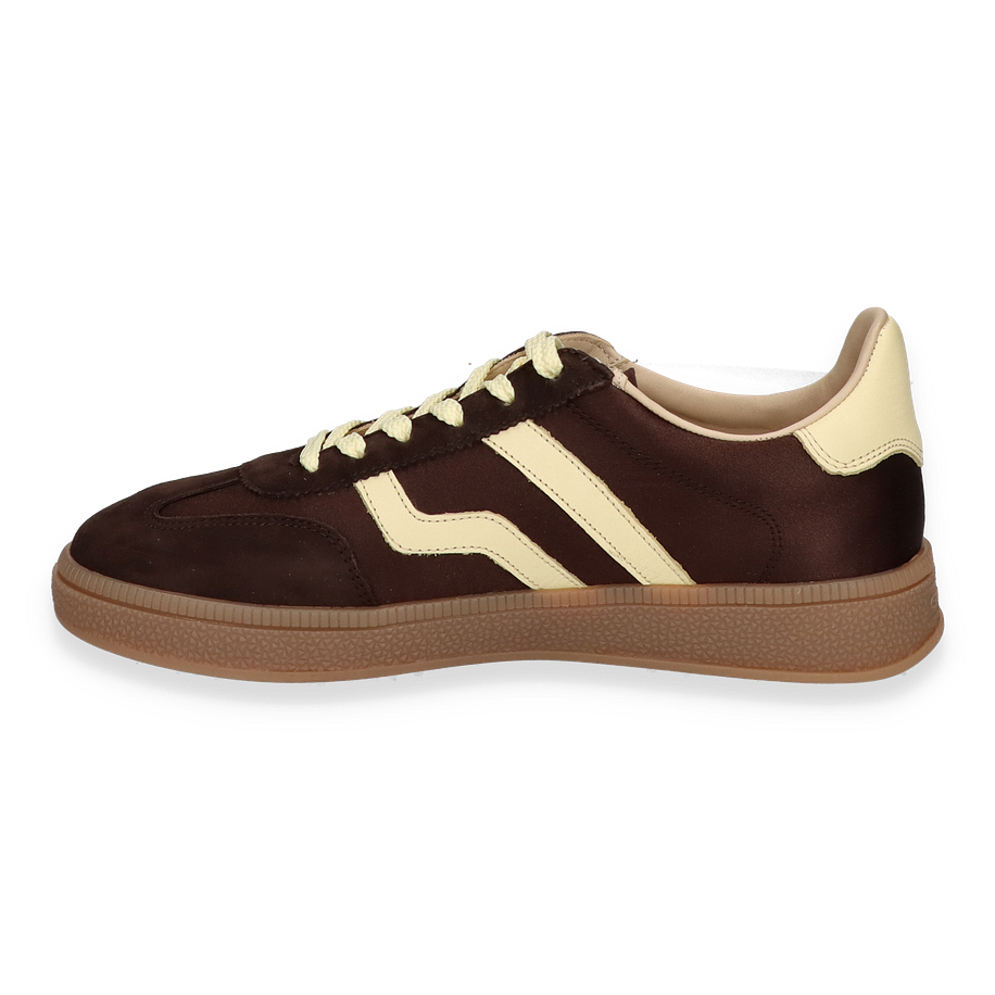 Der Gant Sneaker CUZIMA für Damen präsentiert sich in einem eleganten Dunkelbraun, das durch kontrastierende helle Akzente stilvoll ergänzt wird. Die Kombination aus Leder und Textil im Obermaterial verleiht dem Schuh eine luxuriöse Anmutung, während die sorgfältig platzierten Details und das dezente Branding einen Hauch von Raffinesse hinzufügen. Die harmonische Farbgebung und das zeitlose Design machen diesen Sneaker zu einem vielseitigen Begleiter für verschiedenste Anlässe.