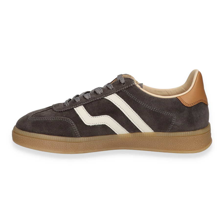 Preis inkl. MwSt.Entdecken Sie den eleganten Sneaker für Damen, der durch sein stilvolles Design besticht. Das Obermaterial aus hochwertigem Wildleder in einem tiefen Grauton wird durch kontrastierende weiße Streifen akzentuiert, die dem Schuh eine dynamische Note verleihen. Die braunen Akzente an der Ferse sorgen für einen harmonischen Farbausgleich und unterstreichen den klassischen Look. Die sorgfältige Verarbeitung und die Liebe zum Detail machen diesen Sneaker zu einem zeitlosen Begleiter für verschiedenste Anlässe.