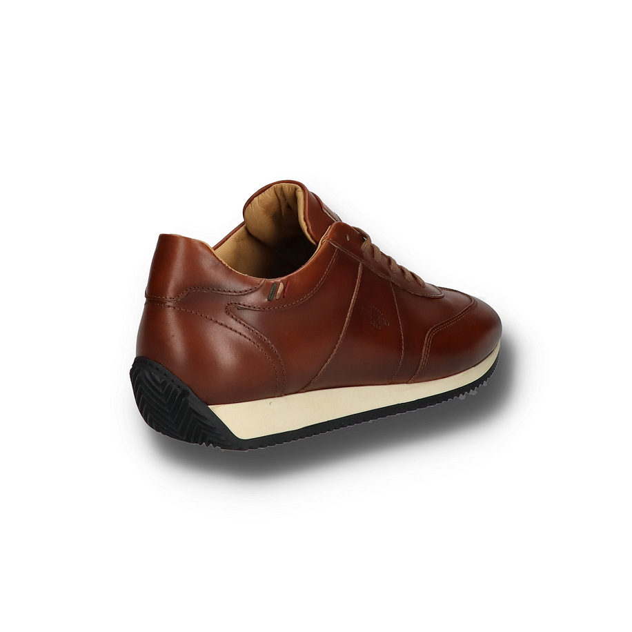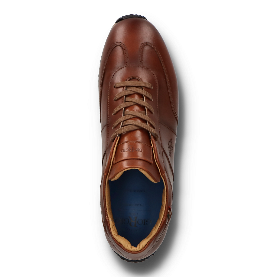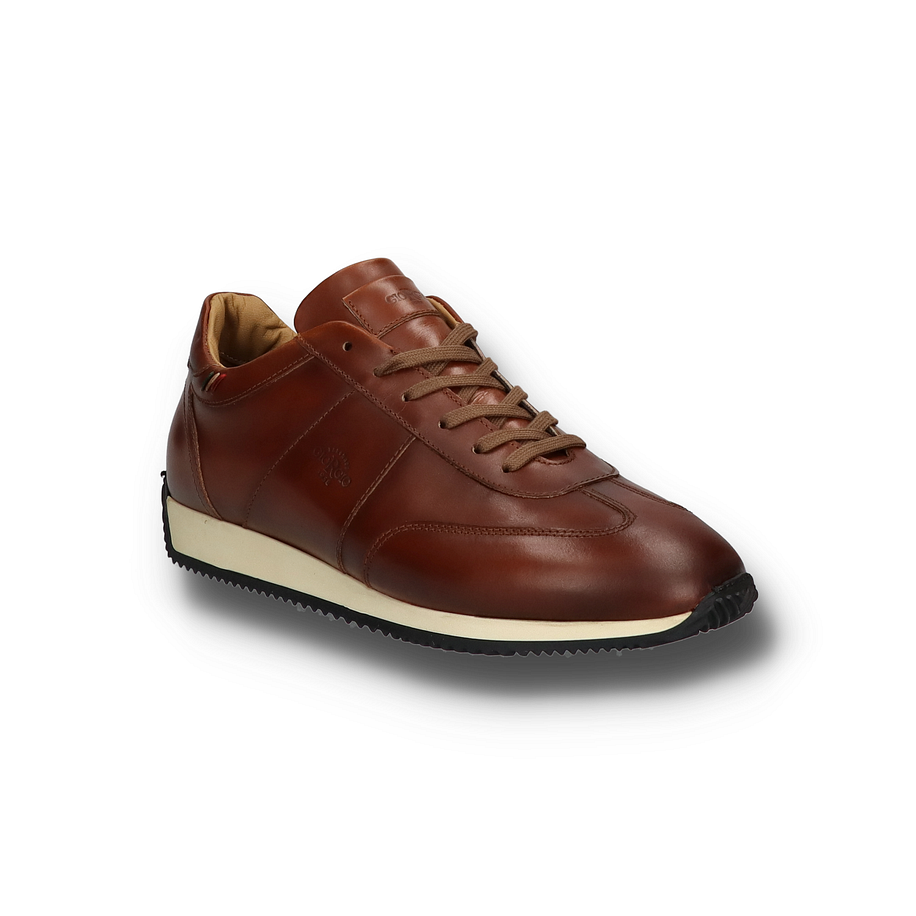 Der Giorgio 1958 Sneaker für Herren besticht durch sein elegantes Design und die hochwertige Verarbeitung. Das braune Leder-Obermaterial verleiht dem Schuh ein klassisches und zugleich modernes Aussehen, das sich perfekt für verschiedene Anlässe eignet. Die feinen Nähte und das dezente Logo auf der Seite unterstreichen die exzellente Handwerkskunst und die Liebe zum Detail. Die Schnürung sorgt für eine optimale Passform und einen sicheren Halt. Dieser Sneaker bietet nicht nur Stil, sondern auch hohen Tragekomfort. Das Innenmaterial, die Innensohle sowie das Obermaterial bestehen aus weichem Leder, das für ein angenehmes Fußklima sorgt. Die Gummisohle bietet eine Rutschfestigkeit. Ein besonderes Highlight ist das Wechselfußbett, das individuell angepasst werden kann und zusätzlichen Komfort bietet. Mit einer Absatzhöhe von 2,5 cm ist dieser Sneaker die ideale Wahl für stilbewusste Herren.