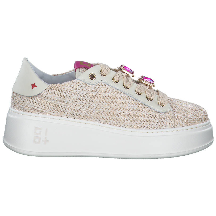 Entdecken Sie den Sneaker von Giove, ein eleganter Schuh für Damen, der Komfort und Stil vereint. Dieser beige Schuh verfügt über eine Absatzhöhe von 5 cm, die eine angenehme Höhe bietet, ohne den Komfort zu beeinträchtigen. Das Obermaterial besteht aus einer hochwertigen Leder-Textil-Kombination, während das Innenfutter und die Innensohle aus Leder für ein luxuriöses Tragegefühl sorgen. Die robuste Gummisohle bietet hervorragende Traktion und Langlebigkeit. Besondere Details sind die Schmuckapplikationen am Schnürsenkel, die diesem Sneaker einen einzigartigen Touch verleihen.