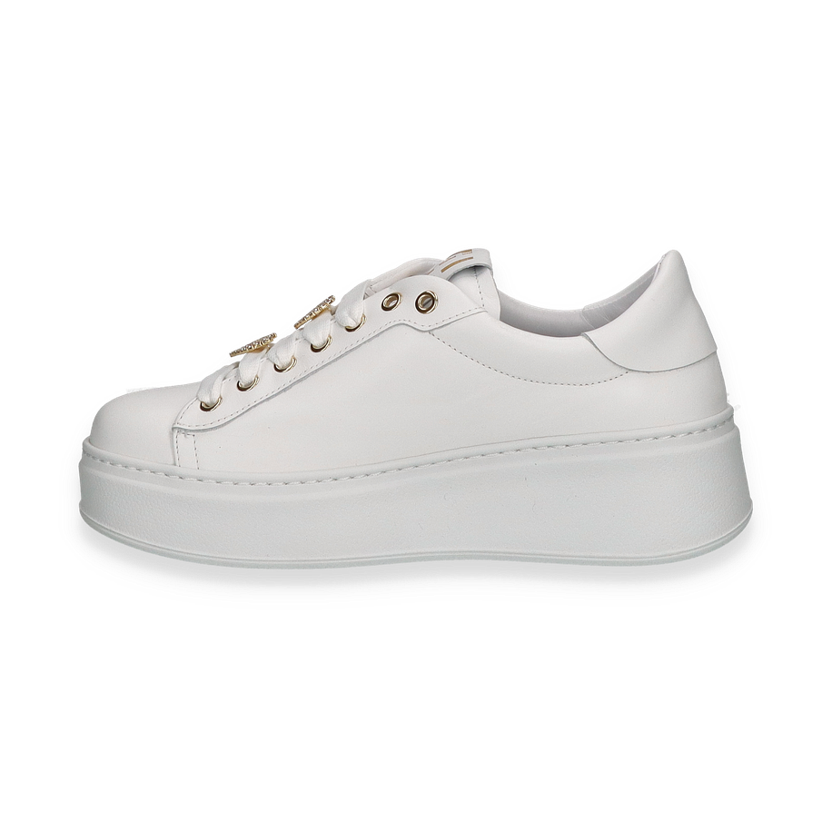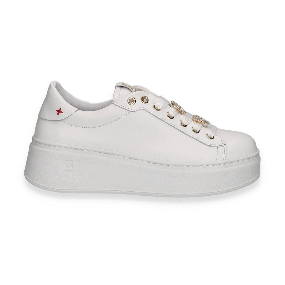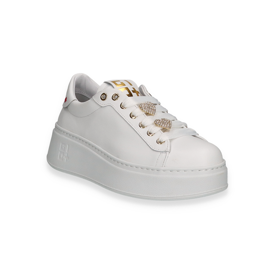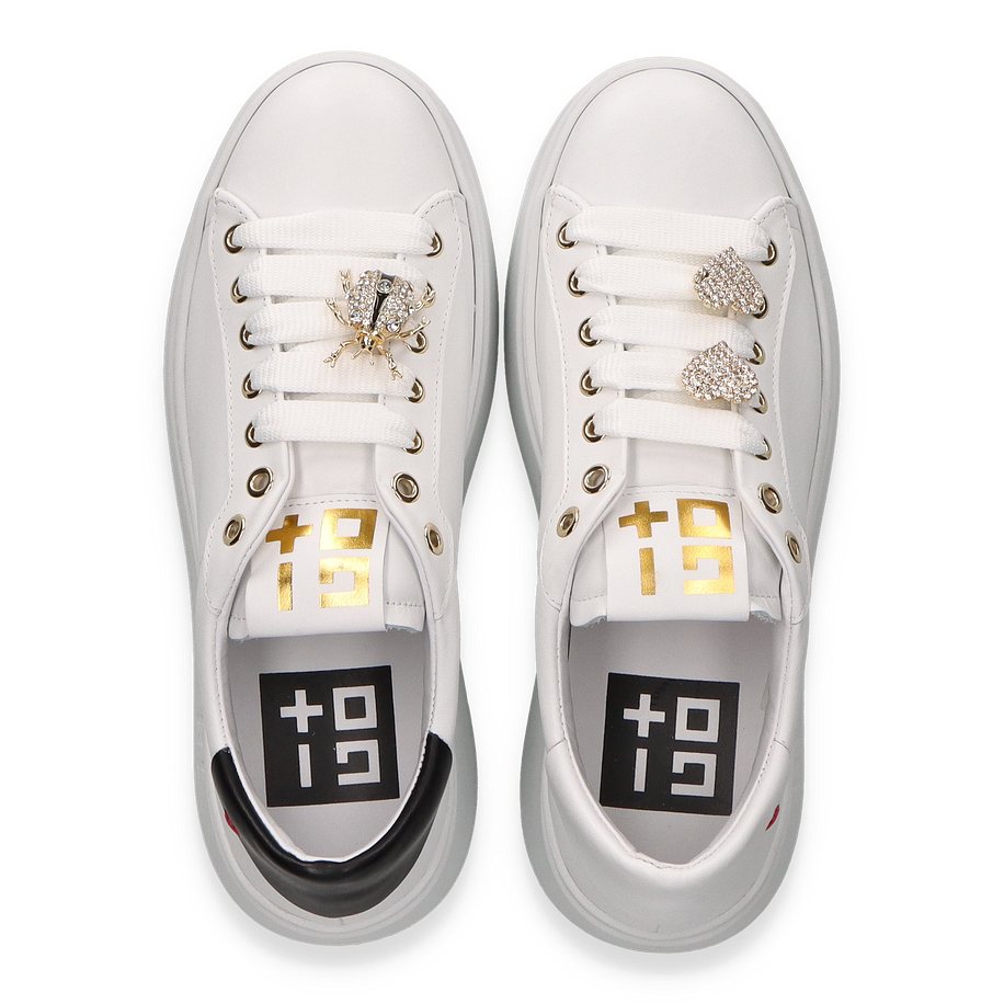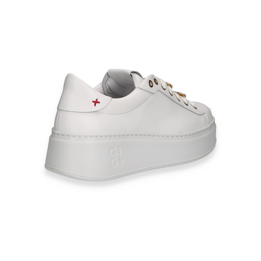Entdecken Sie den eleganten Sneaker von GIOVE in strahlendem Weiß, der durch seine stilvolle und moderne Ästhetik besticht. Die goldenen Details an den Ösen und die funkelnden Verzierungen auf den Schnürsenkeln verleihen diesem Schuh einen Hauch von Luxus. Die klare Linienführung und die dezente Logo-Prägung an der Seite unterstreichen das edle Design, während die erhöhte Sohle für einen modischen Akzent sorgt. Dieser Sneaker ist die perfekte Wahl für Damen, die Stil und Komfort gleichermaßen schätzen.