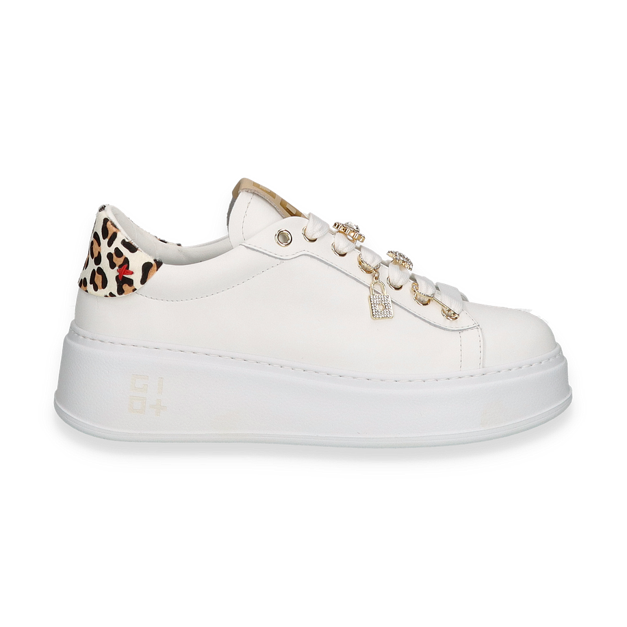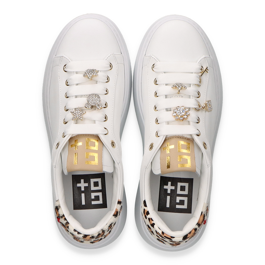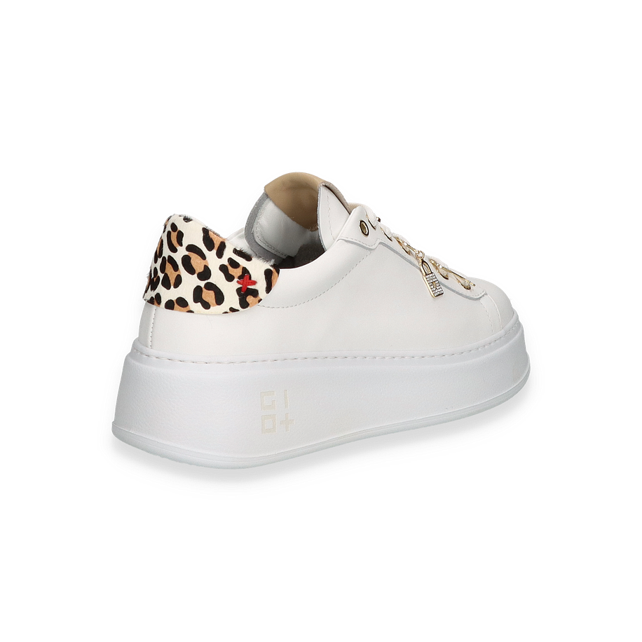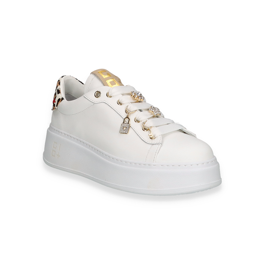 Entdecken Sie den eleganten Sneaker von Giove in strahlendem Weiß, der durch seine luxuriösen Details besticht. Die goldenen Akzente und funkelnden Verzierungen auf den Schnürsenkeln verleihen diesem Schuh eine besondere Note. Der modische Leopardenprint an der Ferse sorgt für einen stilvollen Kontrast und macht diesen Sneaker zu einem echten Hingucker für Damen. Die klare Linienführung und das hochwertige Design passen perfekt zu einem anspruchsvollen, urbanen Look.