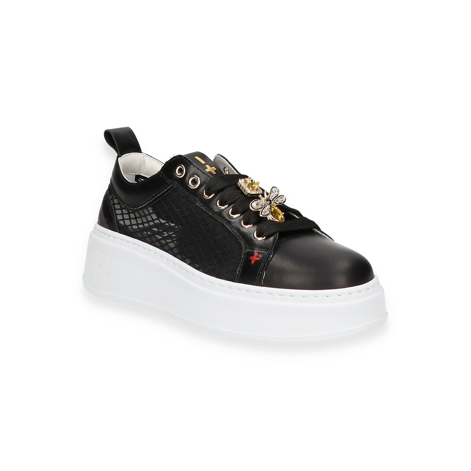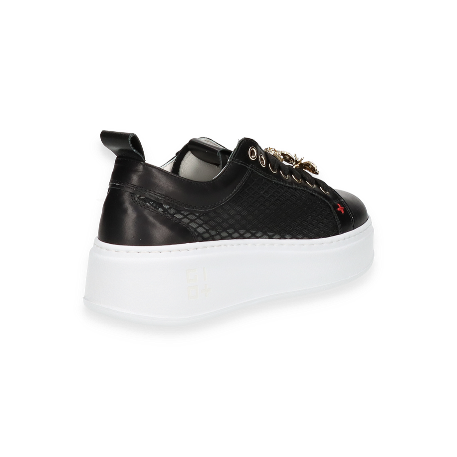 Entdecken Sie den stilvollen Sneaker von Giove für Damen in elegantem Schwarz. Dieses Modell besticht durch seine einzigartige Kombination aus Leder und sonstigem Material im Obermaterial, das durch raffinierte Details wie goldene Verzierungen und ein modernes Design hervorsticht. Die markante weiße Sohle verleiht dem Schuh nicht nur eine trendige Optik, sondern sorgt auch für einen angenehmen Tragekomfort. Der Sneaker ist die perfekte Wahl für modebewusste Frauen, die Wert auf Qualität und Stil legen.