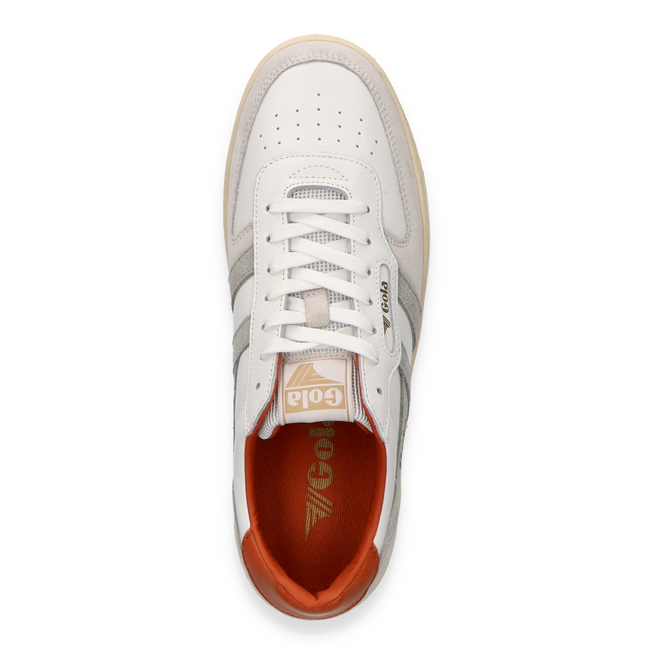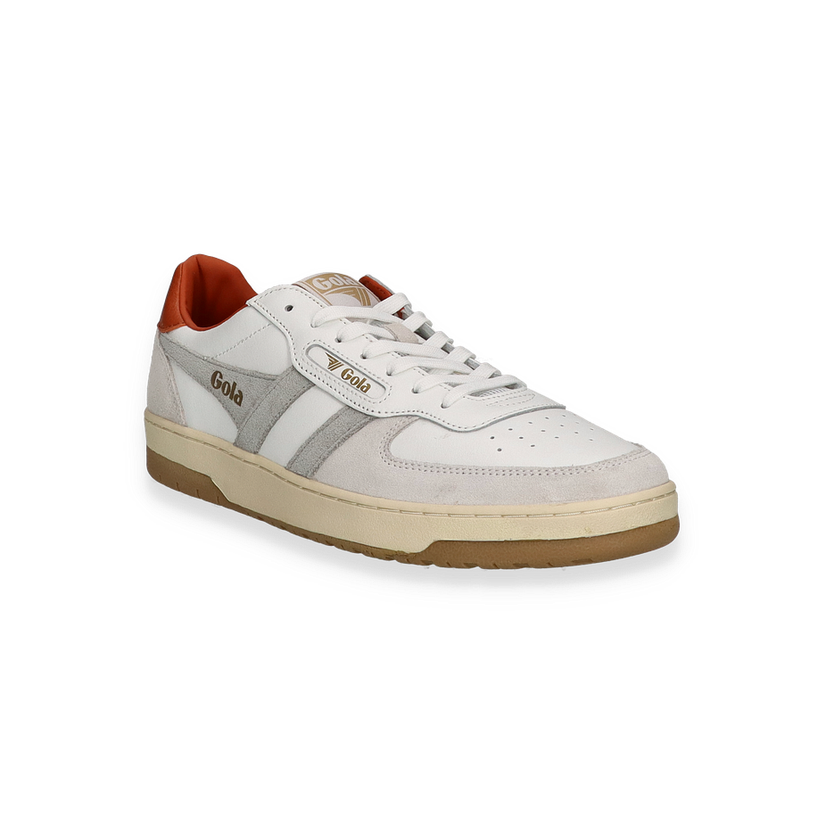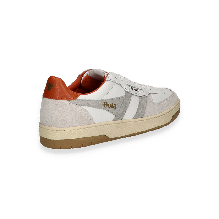 Der Gola HAWK Sneaker für Herren präsentiert sich in einem eleganten Weiß, das durch subtile graue Akzente und ein kontrastierendes, orangefarbenes Detail an der Ferse ergänzt wird. Die klassische Silhouette und das zeitlose Design machen diesen Schuh zu einem vielseitigen Begleiter für verschiedene Anlässe. Die sorgfältige Verarbeitung und die hochwertige Materialwahl unterstreichen den anspruchsvollen Stil dieses Sneakers.
