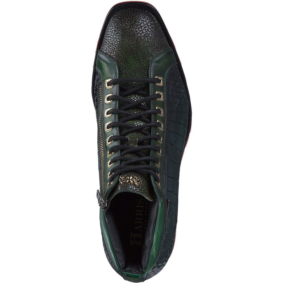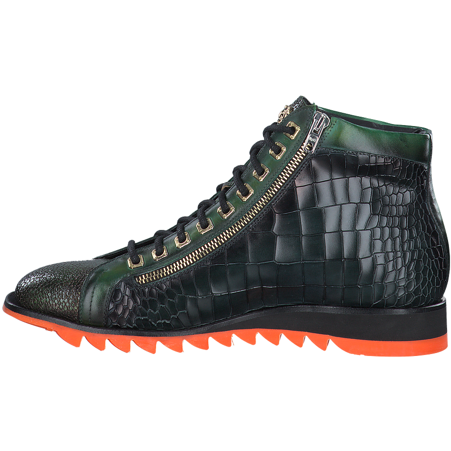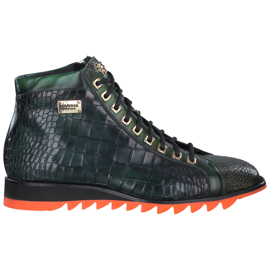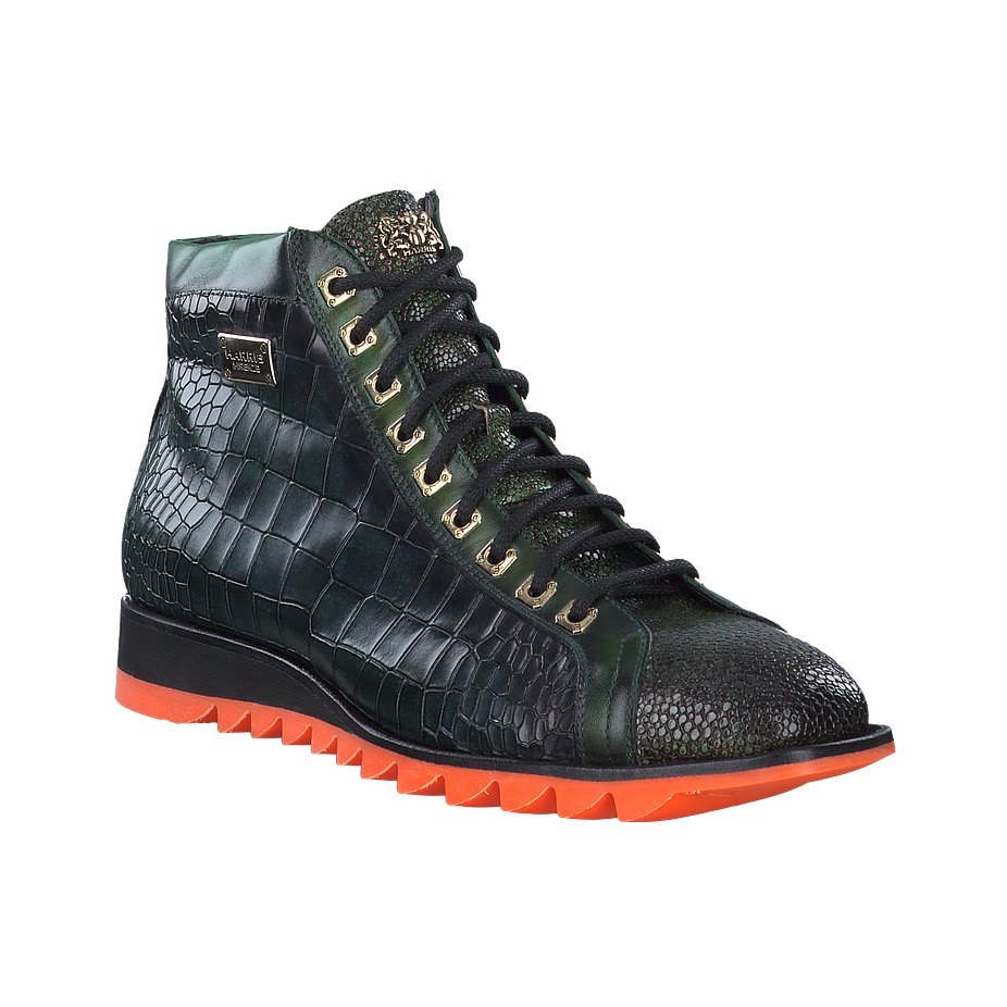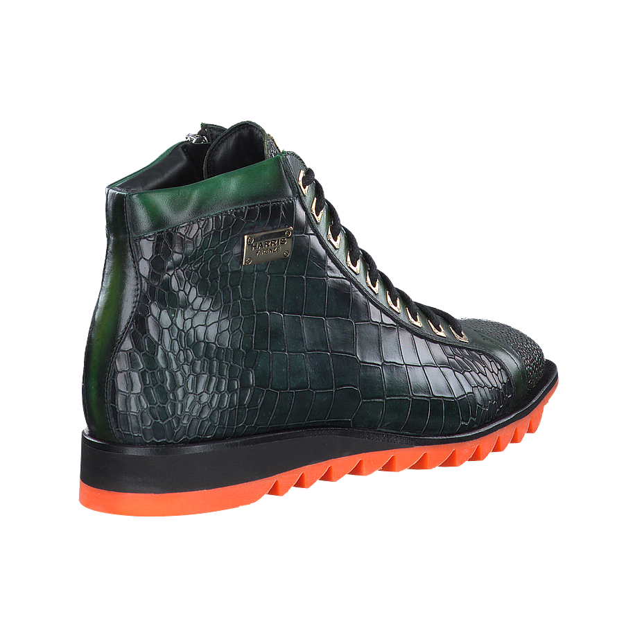 Wenn Sie auf der Suche nach einzigartigen und stilvollen Schuhen für besonders coole Looks sind, könnten diese aufregenden Harris Schnürboots für Herren genau das Richtige für Sie sein. Die aus hochwertigem dunkelgrünem Leder in Krokooptik gefertigten Herrenschuhe sorgen für einen ausgefallenen Hingucker in jedem Outfit und bieten dabei noch einen angenehmen Tragekomfort bei jedem Schritt. Die robusten Gummisohlen sind zudem mit orangefarbenen Akzenten verziert, welche für einen tollen Kontrast zum grünen Leder sorgen.