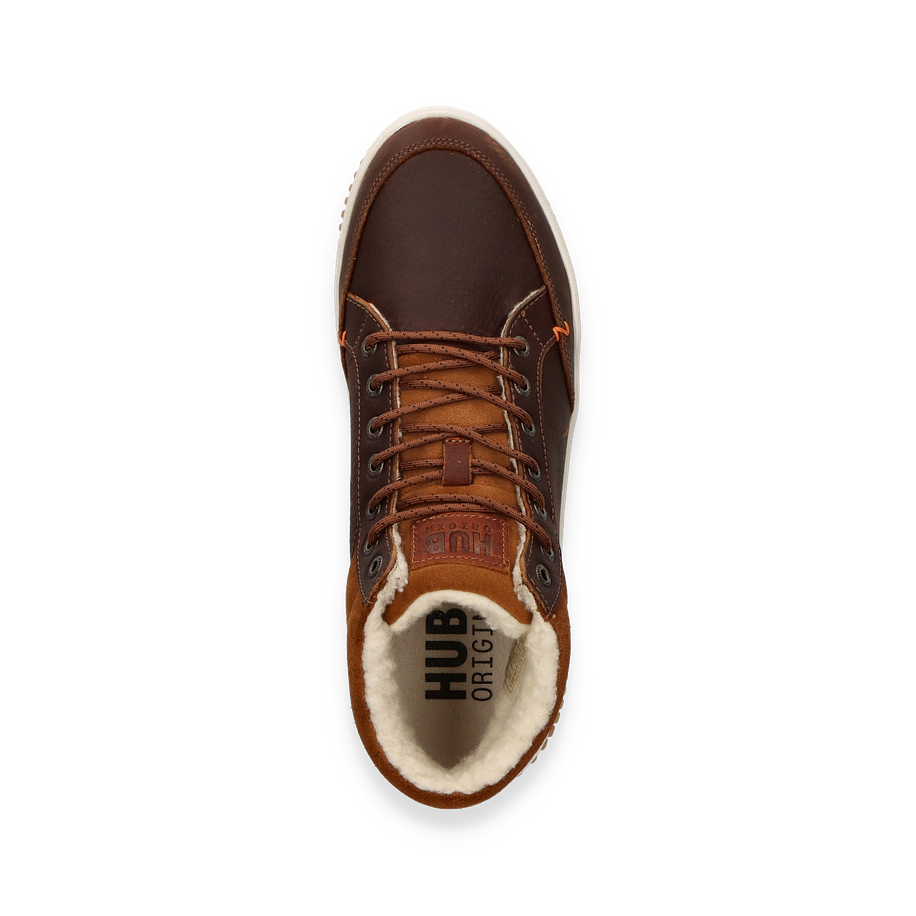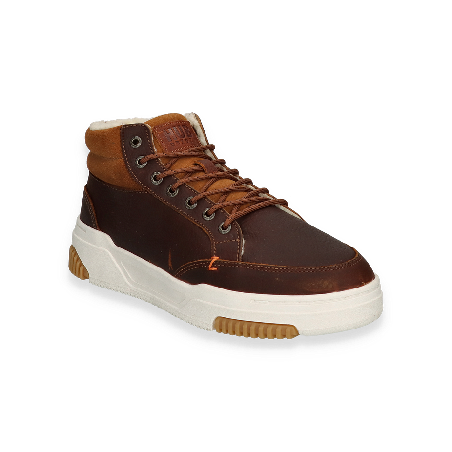 Die HUB Schnürboots "MARK" für Herren präsentieren sich in einem eleganten Mittelbraun, das durch die Kombination aus hochwertigem Leder und Textilfutter besticht. Der robuste Look wird durch die markante Schnürung und die kontrastierende weiße Gummisohle unterstrichen. Diese Boots sind ideal für stilbewusste Herren, die Wert auf Komfort und Design legen. Der warme Innenfutter sorgt für angenehme Wärme an kühleren Tagen, während die sorgfältig gearbeiteten Details das Gesamtbild abrunden.