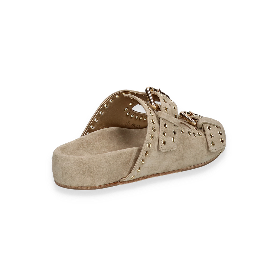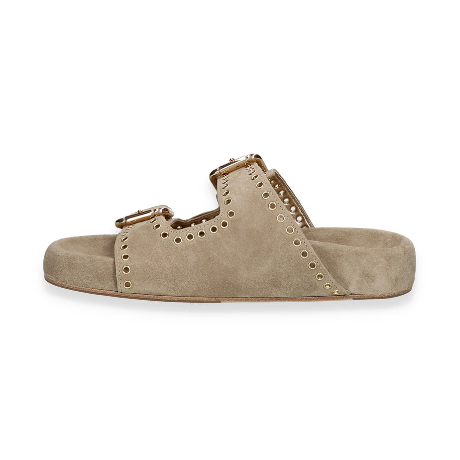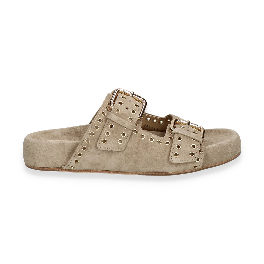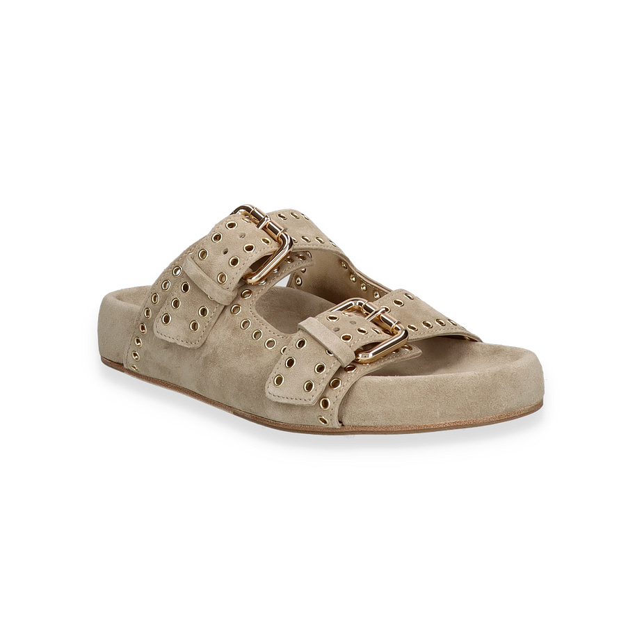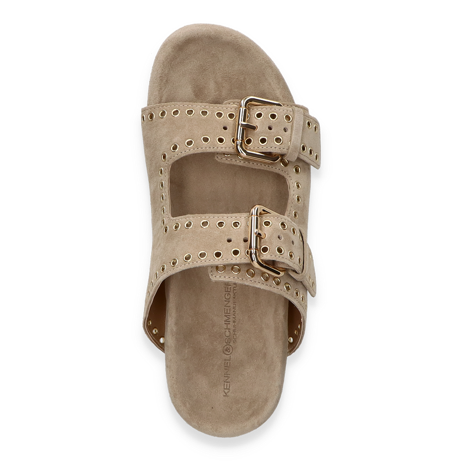Entdecken Sie die eleganten Pantoletten von Kennel & Schmenger, die für Damen entworfen wurden. Diese stilvollen Schuhe in einem sanften Beige-Ton bestechen durch ihr modernes Design mit auffälligen goldfarbenen Schnallen und dekorativen Ösen. Die hochwertige Verarbeitung des Leders sorgt für einen luxuriösen Look, während die flache Sohle und der 3,5 cm hohe Absatz optimalen Tragekomfort bieten. Perfekt für einen entspannten, aber dennoch anspruchsvollen Auftritt.