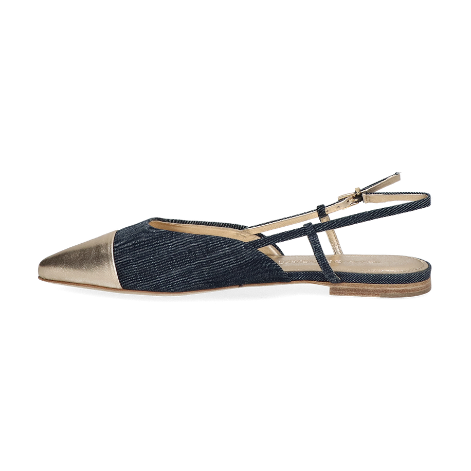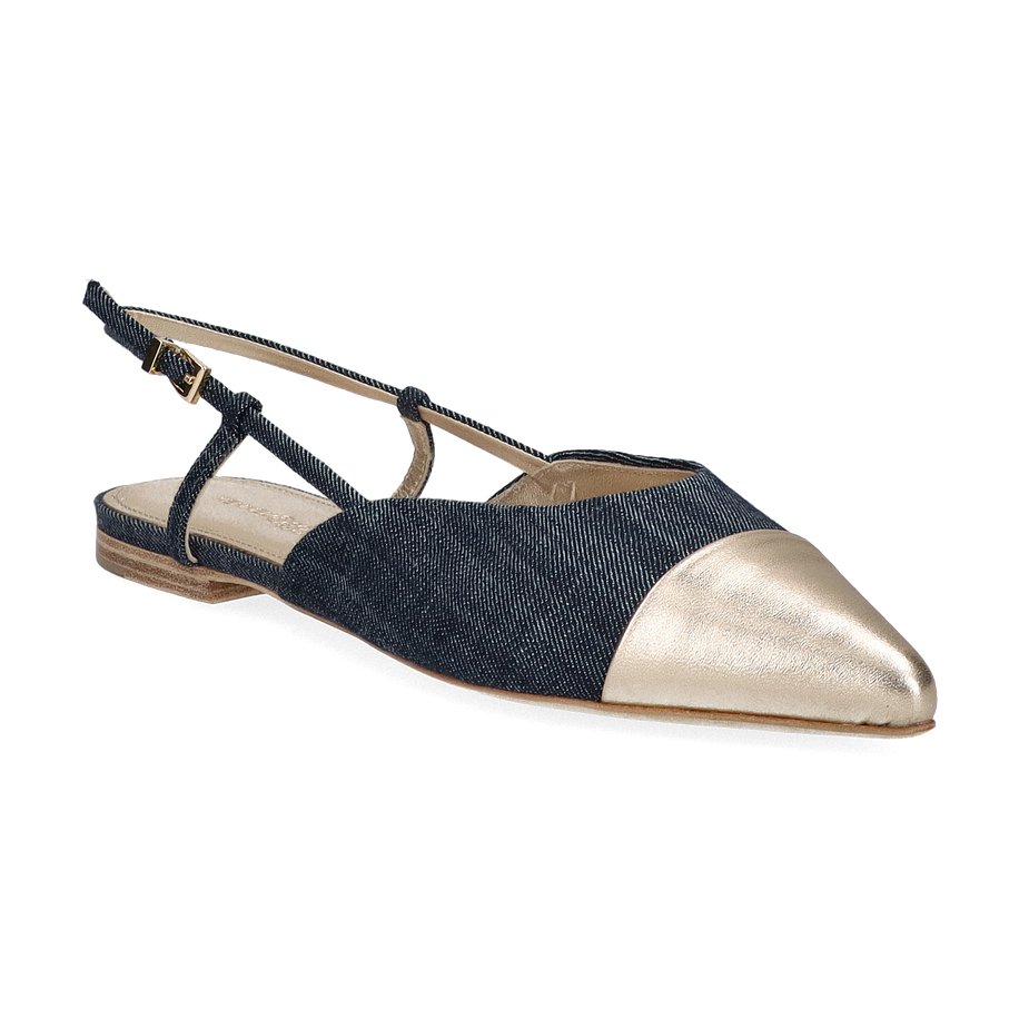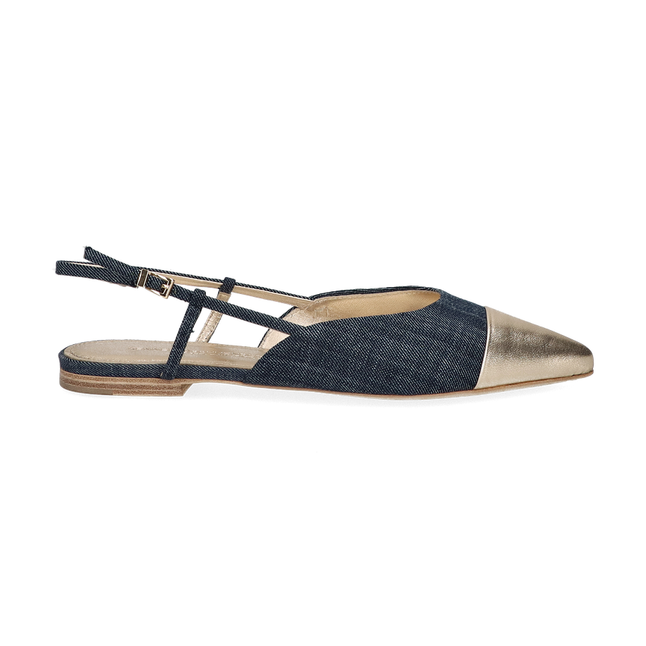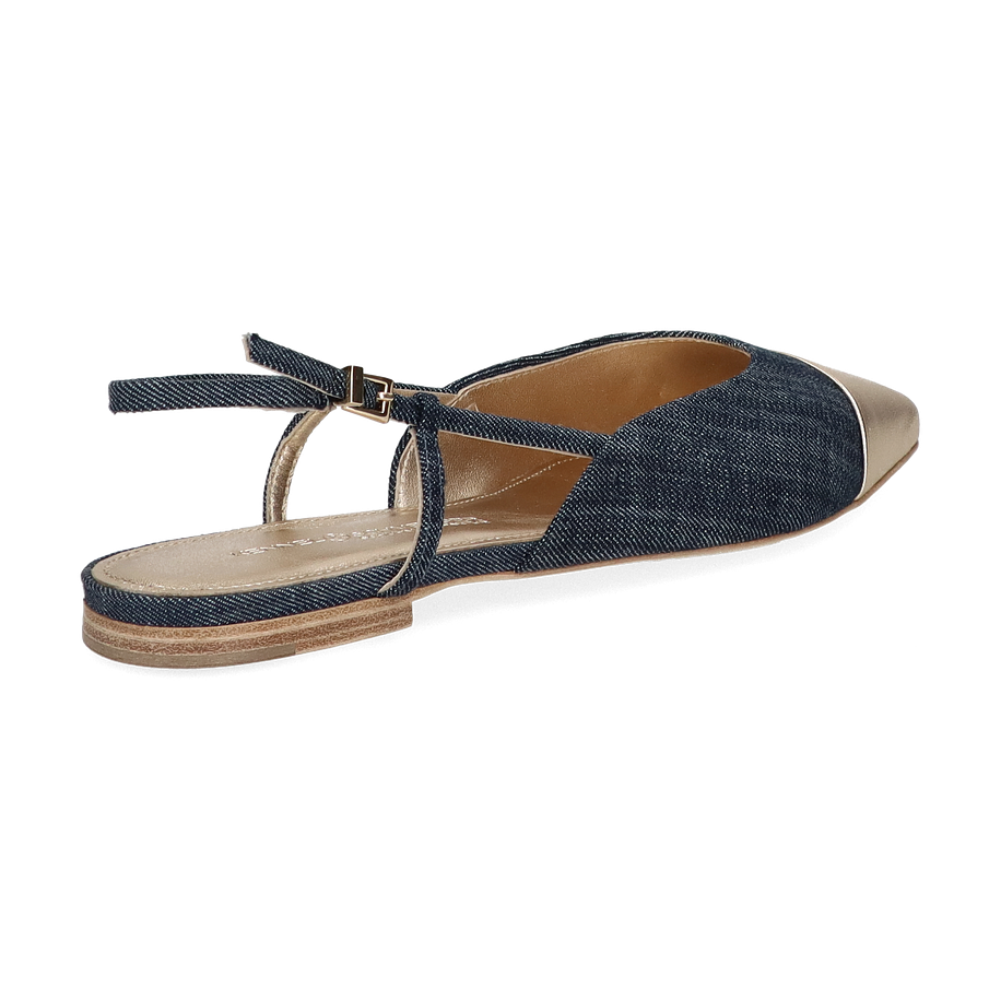 Die eleganten Slingpumps von Kennel & Schmenger vereinen Stil und Komfort in einem einzigartigen Design für Damen. Diese Schuhe präsentieren sich in einer ansprechenden Kombination aus Blau und Gold, die jedem Outfit einen Hauch von Raffinesse verleiht. Der spitz zulaufende Zehenbereich in glänzendem Gold setzt einen edlen Akzent, während das blaue Textilmaterial einen modernen Kontrast bietet. Der schmale Fersenriemen mit verstellbarer Schnalle sorgt für einen sicheren Sitz und unterstreicht die feminine Silhouette.