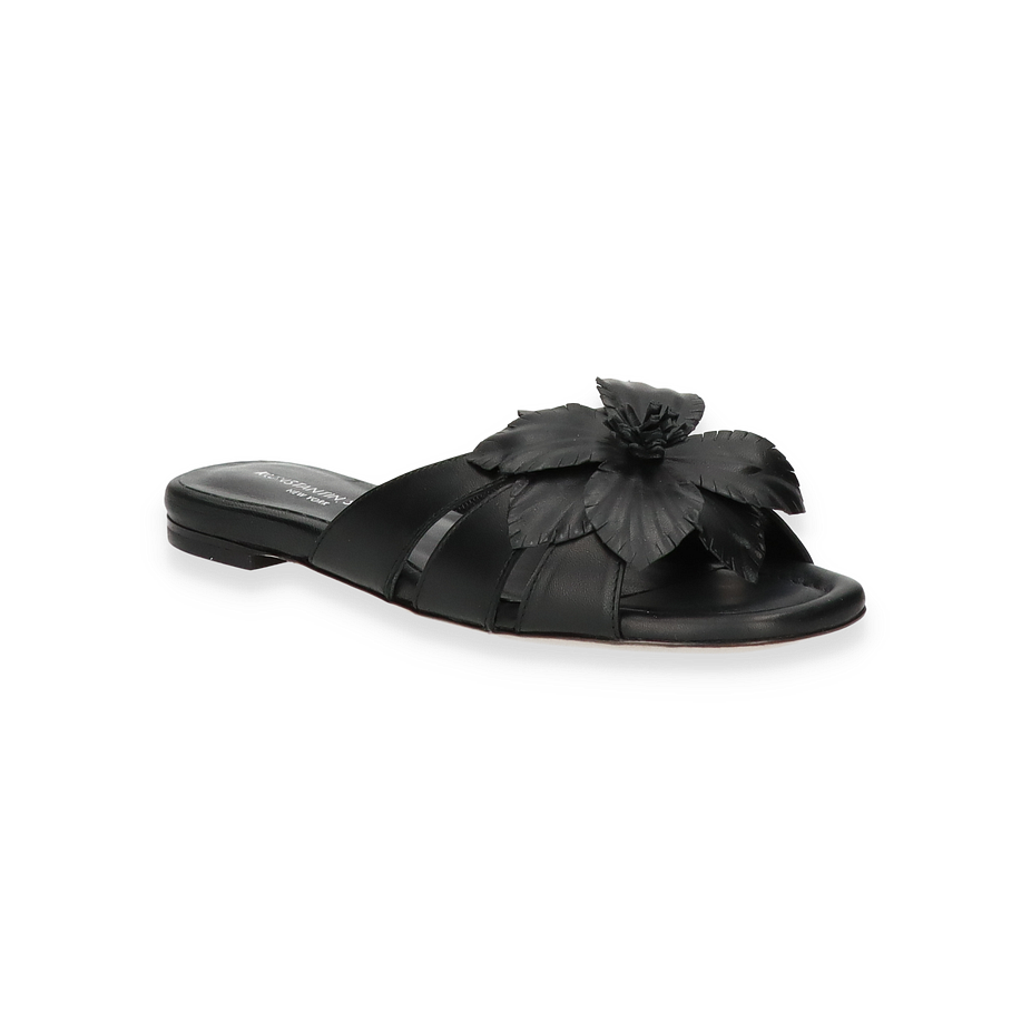 Entdecken Sie die eleganten Pantoletten von Konstantin Starke, die durch ihr raffiniertes Design und hochwertige Verarbeitung bestechen. Diese schwarzen Pantoletten für Damen zeichnen sich durch eine kunstvolle Blütenapplikation auf dem Obermaterial aus Leder aus, die einen Hauch von Luxus und Stil verleiht. Die flache Silhouette mit einem Absatz von 1,5 cm sorgt für einen komfortablen und dennoch stilvollen Auftritt, ideal für den Alltag oder besondere Anlässe.
