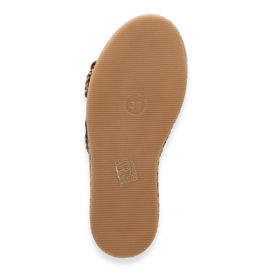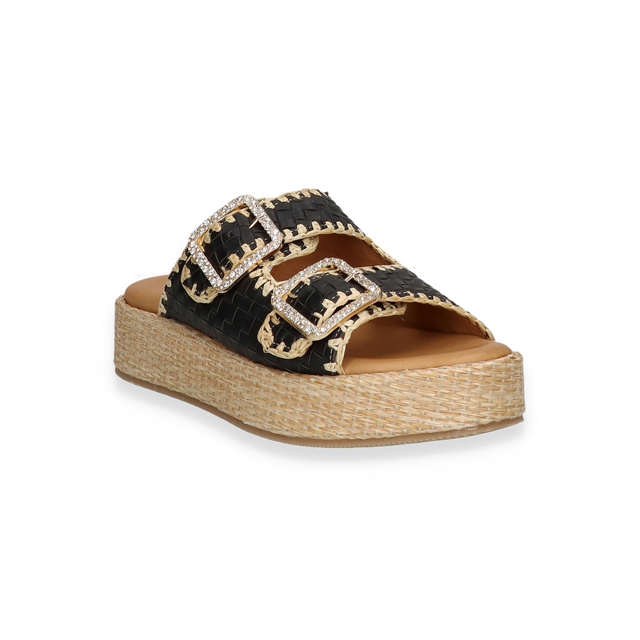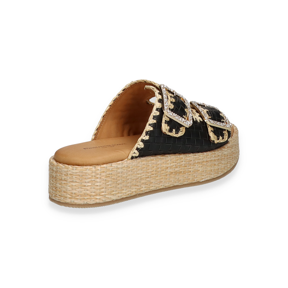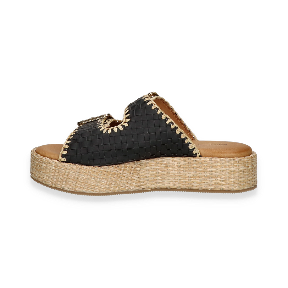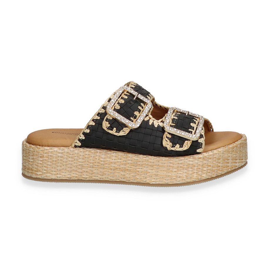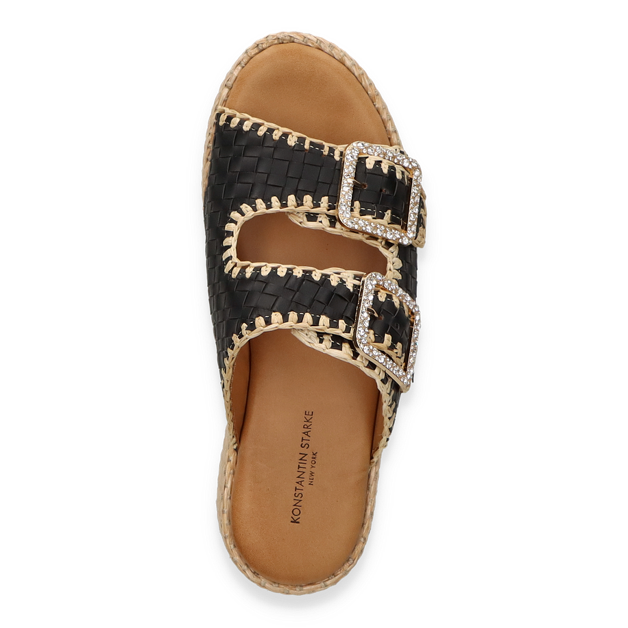 Die Pantoletten von Konstantin Starke präsentieren sich in einem eleganten Schwarz, das durch die kunstvoll geflochtene Lederoberfläche besticht. Die zwei markanten Schnallen mit funkelnden Details verleihen dem Schuh einen Hauch von Glamour und machen ihn zu einem stilvollen Begleiter für Damen. Die Plateau-Sohle in natürlicher Bastoptik sorgt nicht nur für einen modischen Akzent, sondern bietet auch zusätzlichen Komfort und Stabilität.