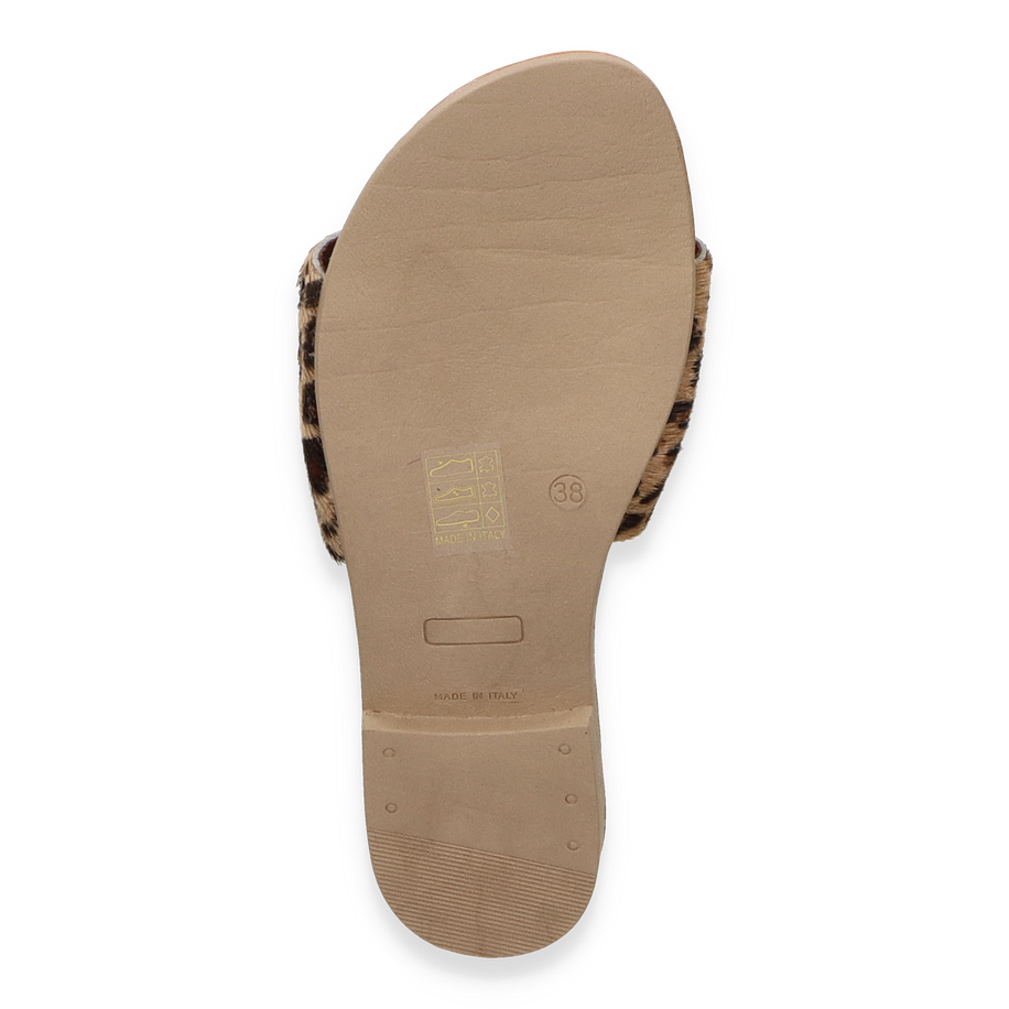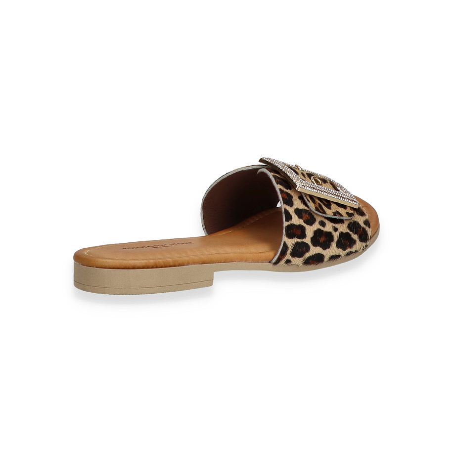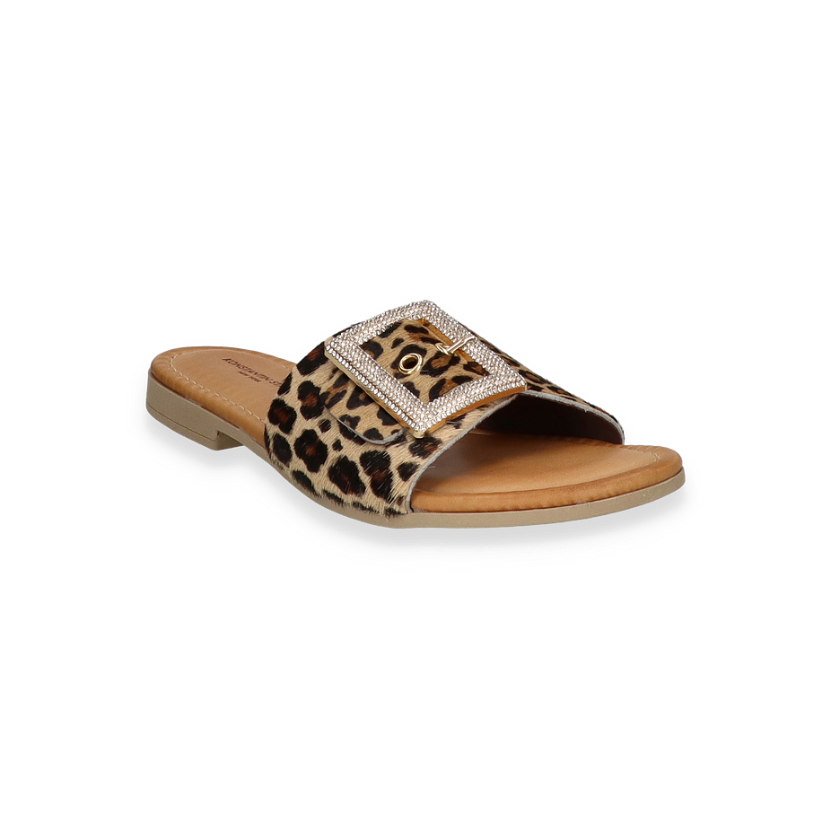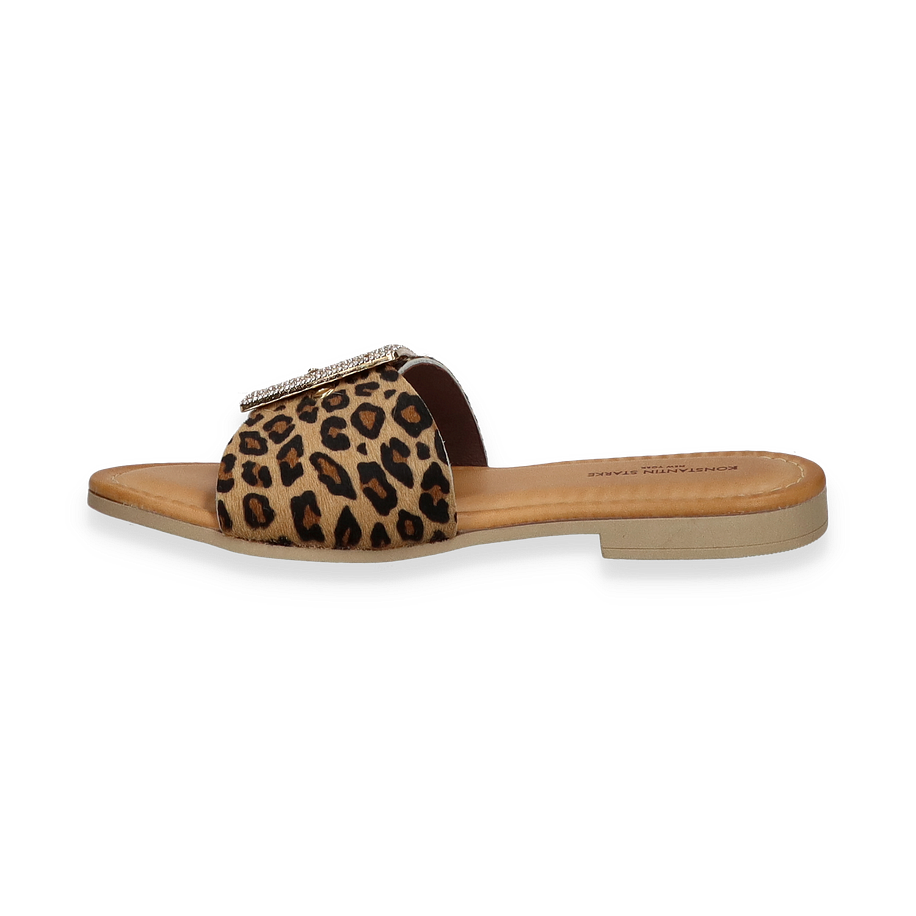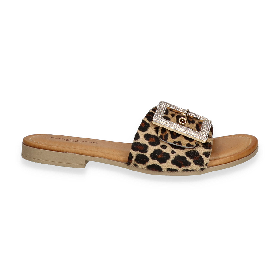 Die Pantoletten von Konstantin Starke für Damen präsentieren sich in einem stilvollen Design, das durch ein auffälliges Leopardenmuster in Beige/Bunt besticht. Der breite Riemen ist mit einer eleganten Schnalle verziert, die mit funkelnden Details versehen ist und dem Schuh einen Hauch von Glamour verleiht. Die flache Sohle und der niedrige Absatz von 1,5 cm sorgen für angenehmen Tragekomfort, ideal für den Alltag oder besondere Anlässe.