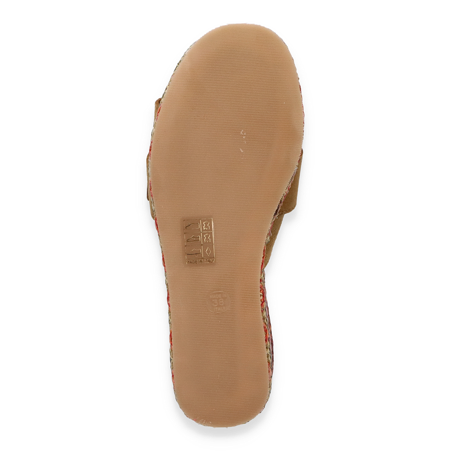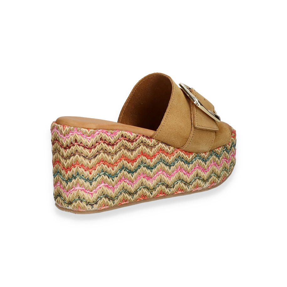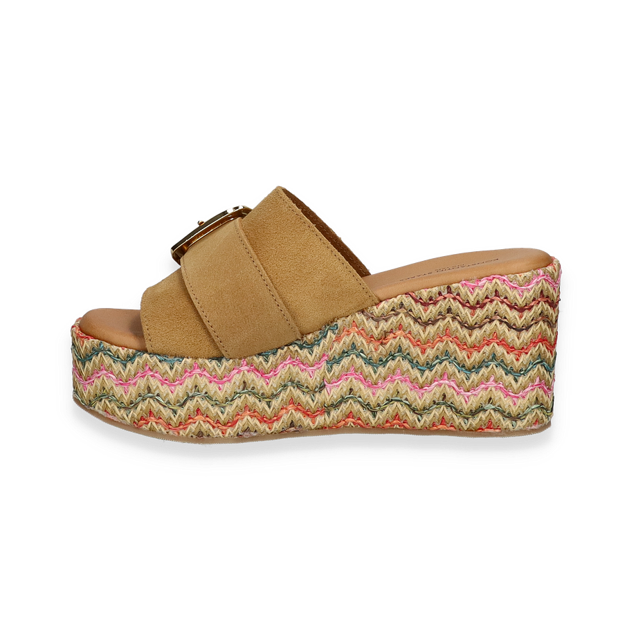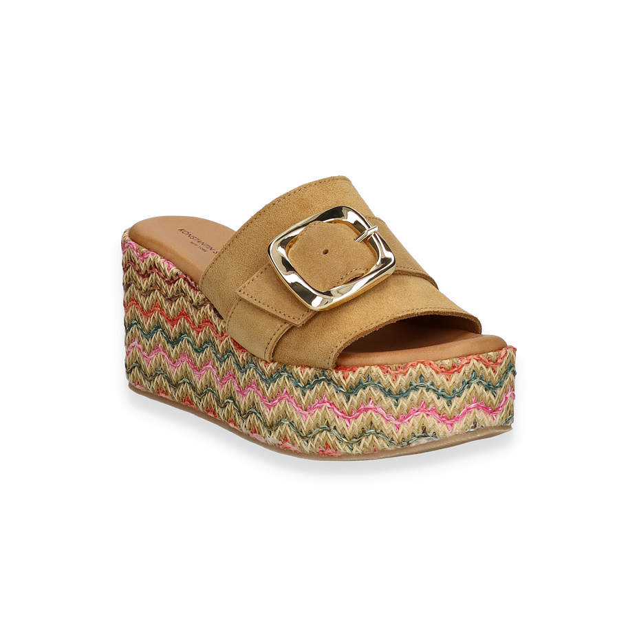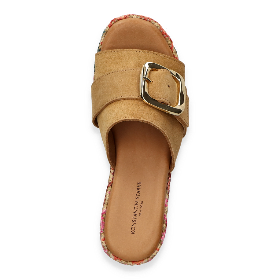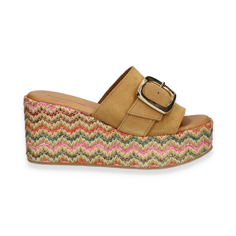Die Pantoletten von Konstantin Starke für Damen präsentieren sich in einem stilvollen Mittelbraun mit einem auffälligen, bunten Keilabsatz. Der breite Riemen aus hochwertigem Leder wird durch eine markante goldfarbene Schnalle akzentuiert, die dem Schuh eine elegante Note verleiht. Der farbenfrohe, gewebte Absatz in Zickzack-Muster verleiht jedem Outfit einen Hauch von Boho-Chic und macht diese Pantoletten zu einem perfekten Begleiter für sommerliche Anlässe.