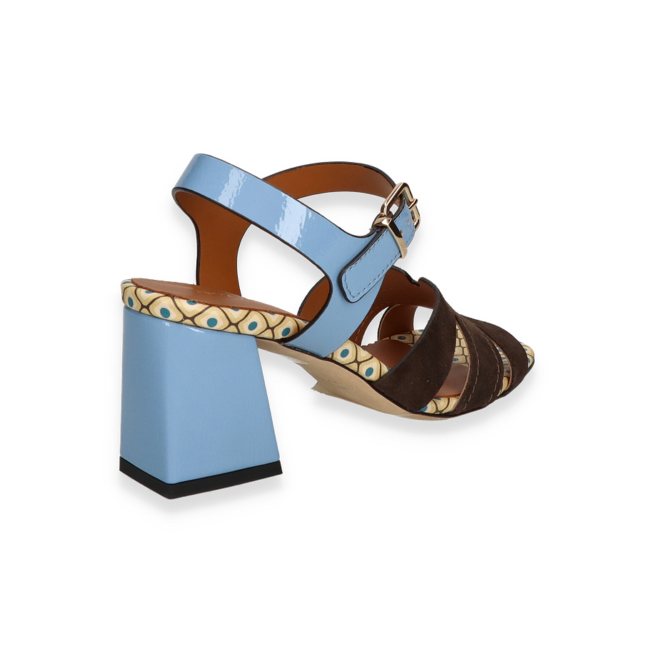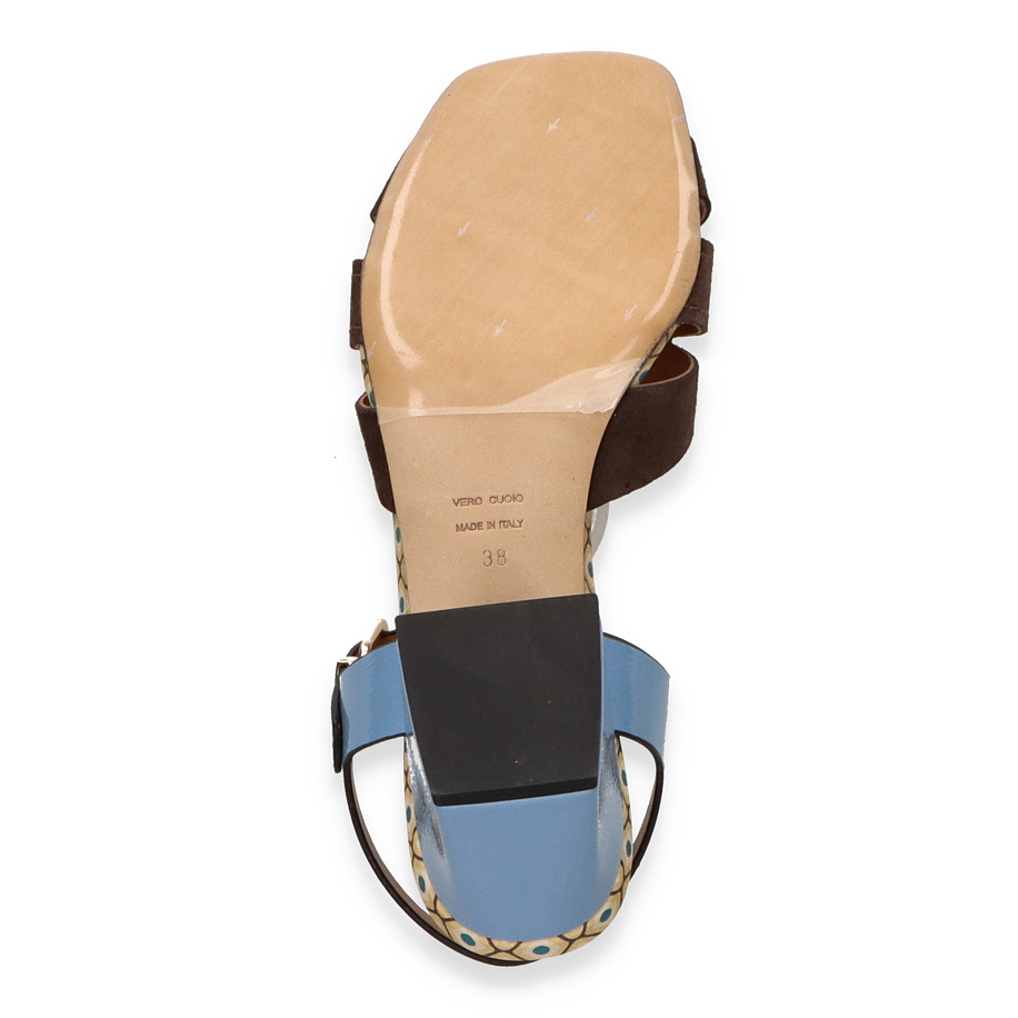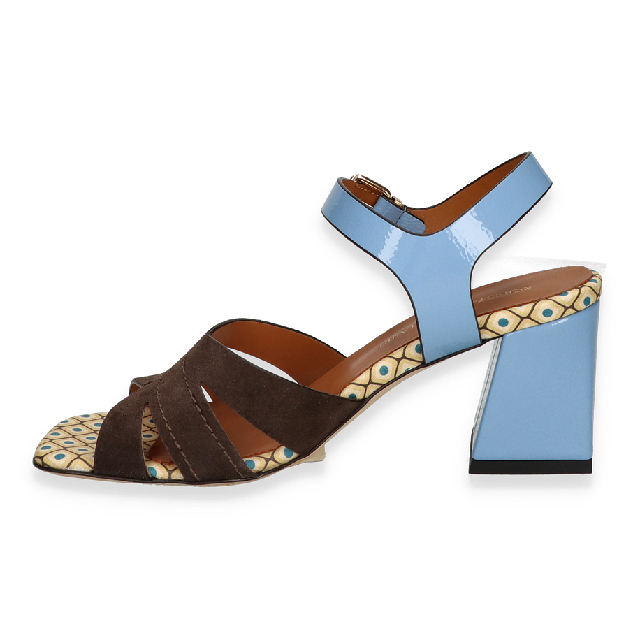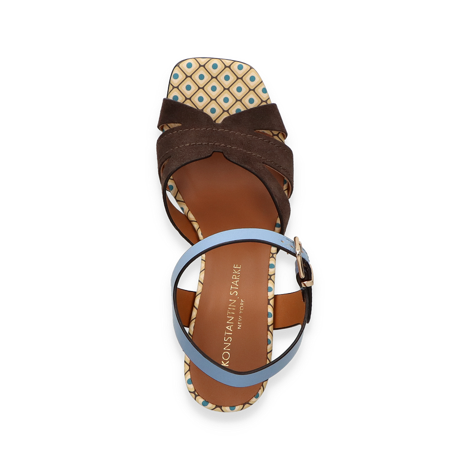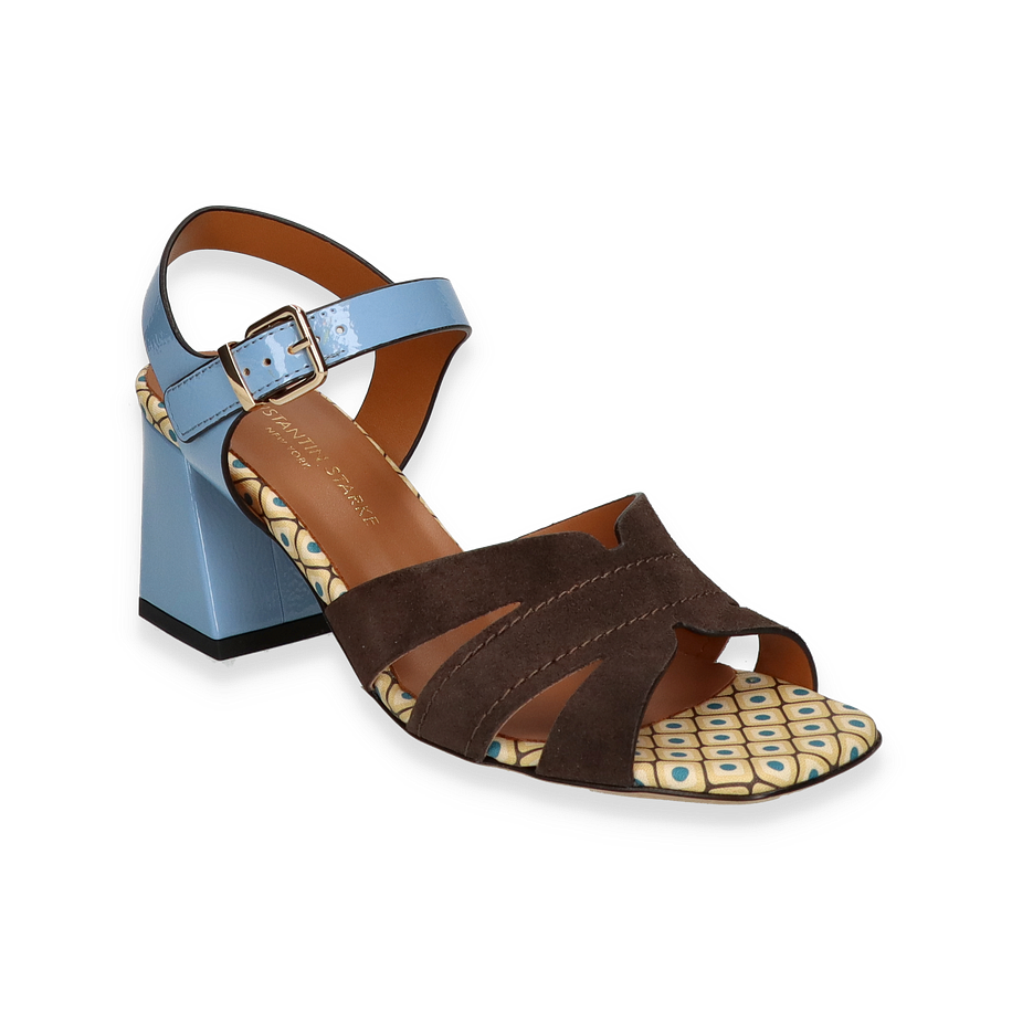 Preis inkl. MwSt.Entdecken Sie die exquisite Sandalette von Konstantin Starke für Damen, die mit ihrem einzigartigen Design in Braun und Bunt begeistert. Der Schuh besticht durch ein elegantes Obermaterial aus Leder, das in Kombination mit dem auffälligen Muster auf der Innensohle einen modernen und stilvollen Look kreiert. Der breite, blaue Riemen mit goldener Schnalle verleiht dem Schuh nicht nur einen Hauch von Farbe, sondern sorgt auch für sicheren Halt. Der 7 cm hohe Blockabsatz in Blau ergänzt das Design perfekt und bietet gleichzeitig Komfort und Stabilität.