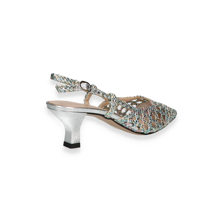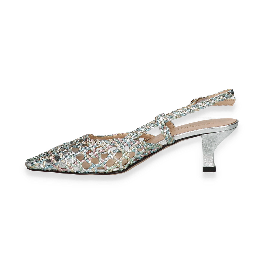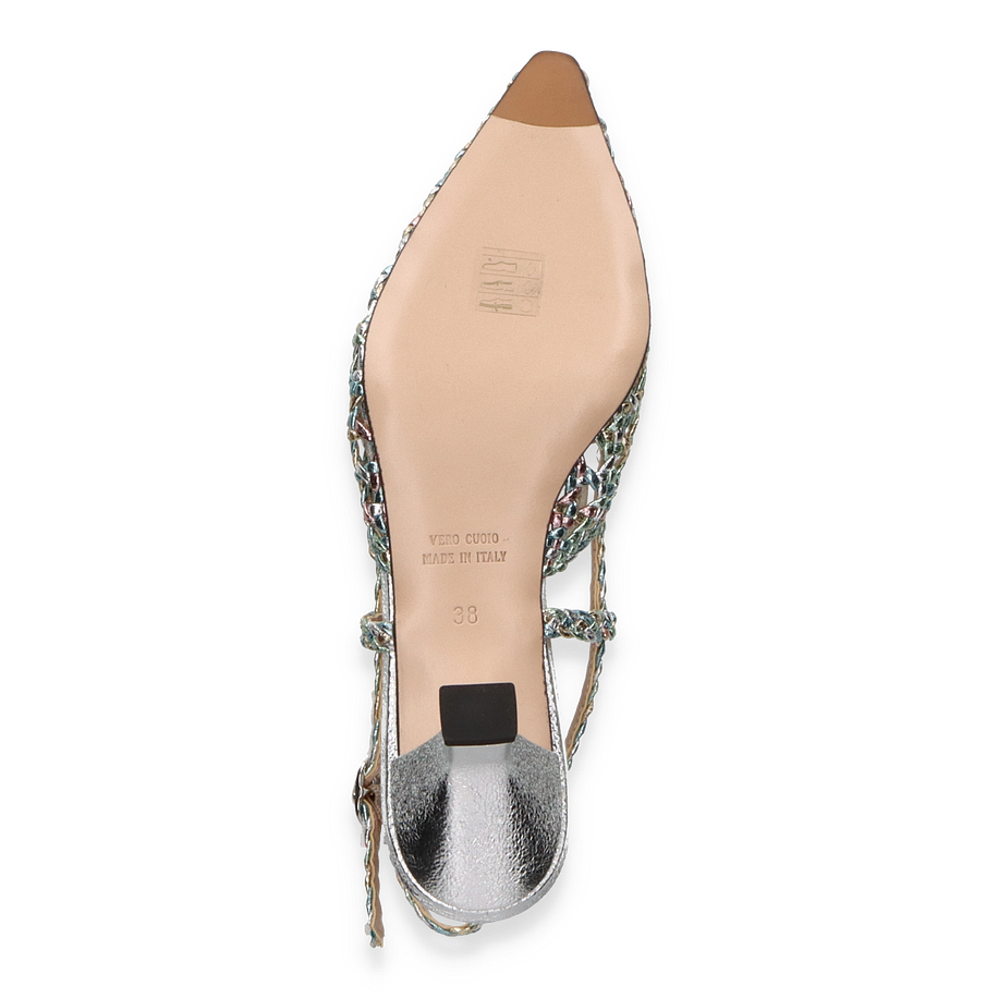 Die Konstantin Starke Slingpumps für Damen präsentieren sich in einem eleganten und auffälligen Design. Die Kombination aus Silber und bunten Tönen verleiht diesen Schuhen einen einzigartigen und stilvollen Look. Das raffinierte Flechtmuster des Obermaterials sorgt für eine luftige Optik, während der 5 cm hohe Absatz eine feminine Silhouette unterstreicht. Diese Slingpumps sind die perfekte Wahl für besondere Anlässe und verleihen jedem Outfit einen Hauch von Glamour.