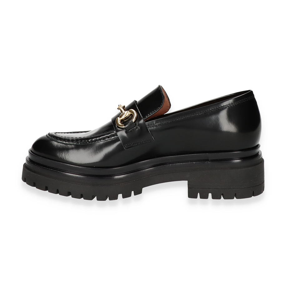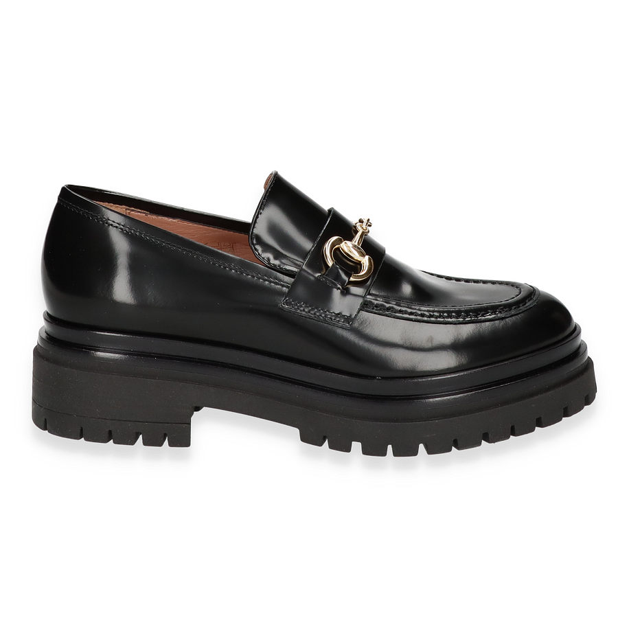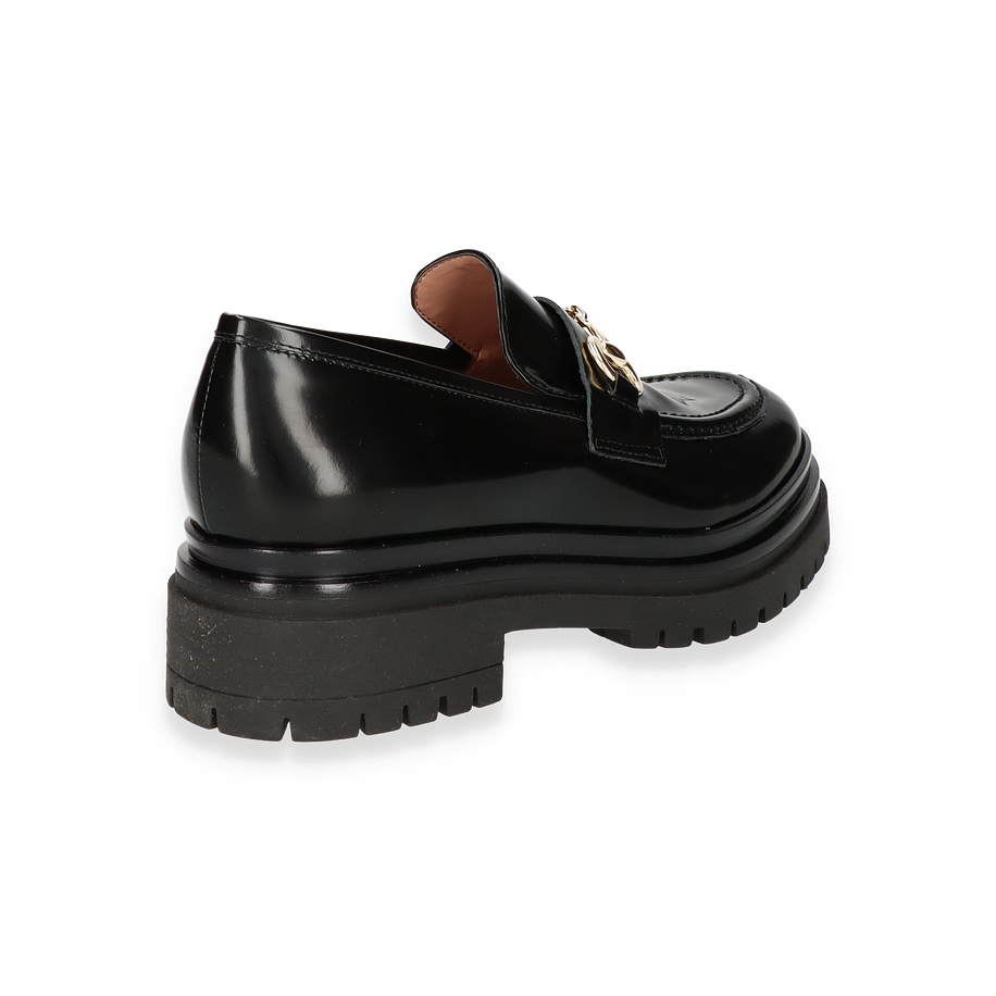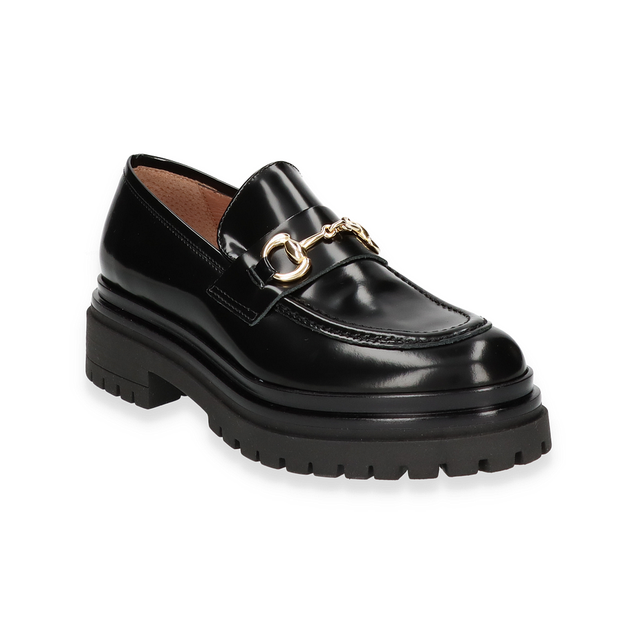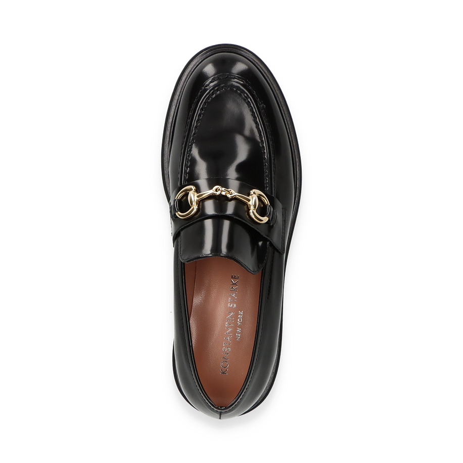 Der Konstantin Starke Slipper für Damen präsentiert sich in elegantem Schwarz und besticht durch sein glänzendes Leder-Obermaterial. Das Design wird durch eine stilvolle goldene Schnalle auf der Oberseite akzentuiert, die dem Schuh einen Hauch von Luxus verleiht. Der robuste Blockabsatz von 4 cm Höhe sorgt für einen modernen Look und bietet gleichzeitig Stabilität und Komfort. Die abgerundete Form und die feinen Nähte unterstreichen die hochwertige Verarbeitung und machen diesen Slipper zu einem idealen Begleiter für anspruchsvolle Anlässe.