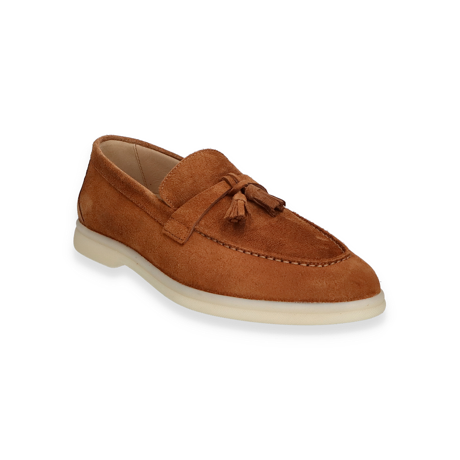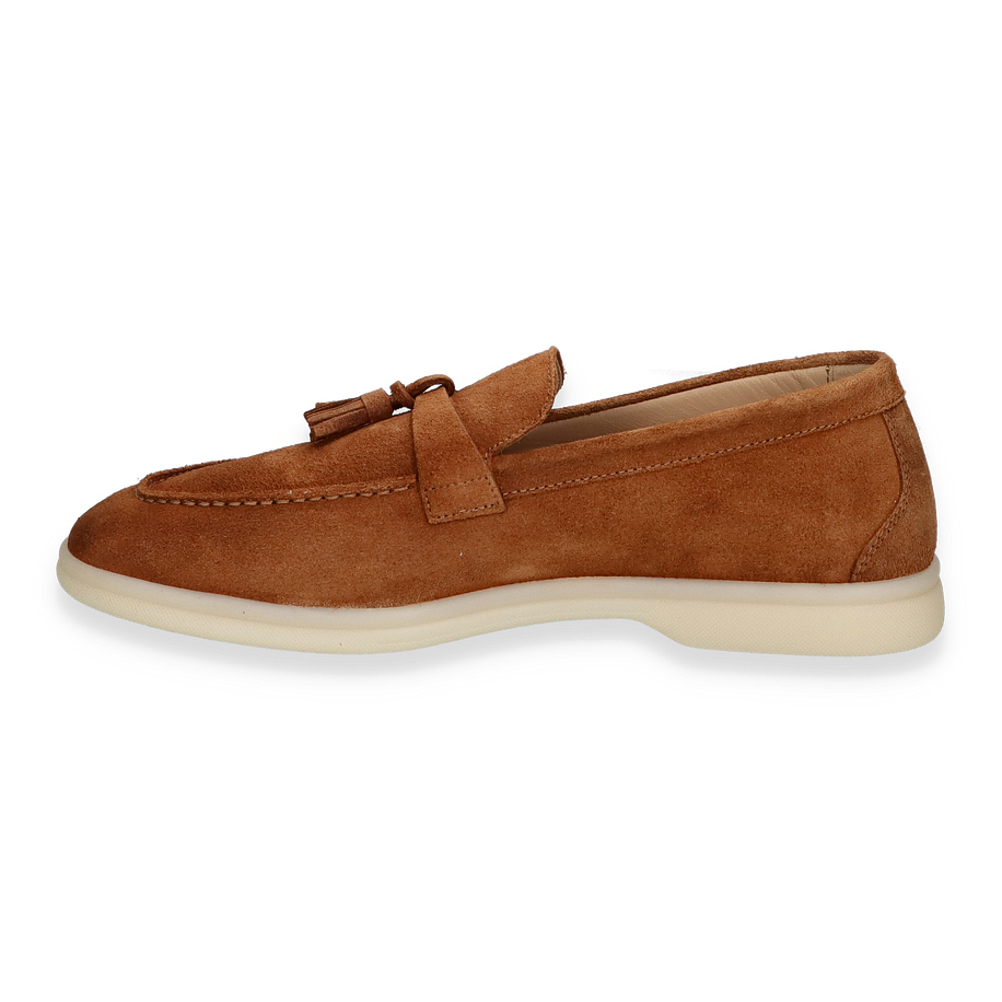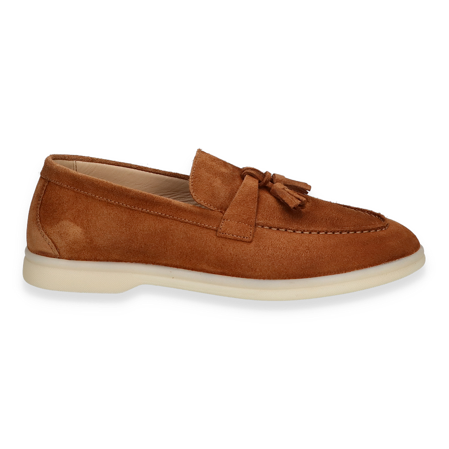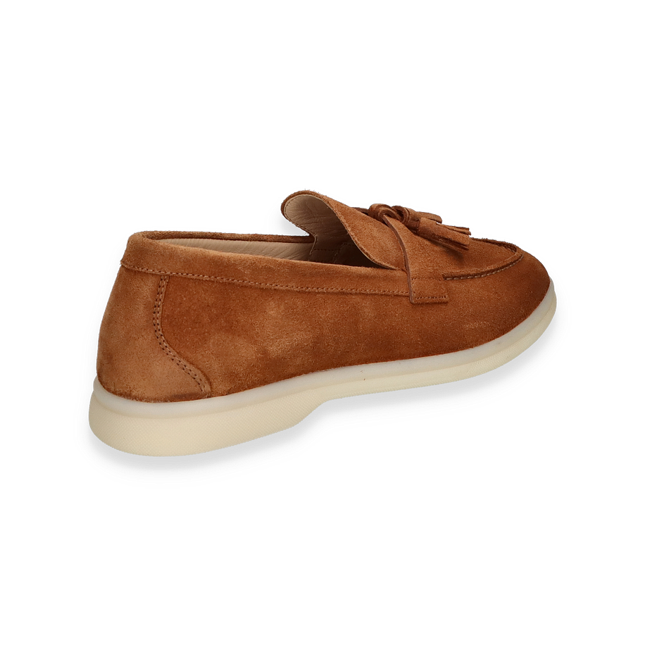 Entdecken Sie den eleganten Slipper für Damen, der durch sein zeitloses Design und die warme, braune Farbe besticht. Das hochwertige Wildleder verleiht diesem Schuh eine luxuriöse Optik und sorgt für ein angenehmes Tragegefühl. Die dekorative Quaste auf dem Spann setzt einen stilvollen Akzent, während die klare Linienführung und die dezente Nahtverarbeitung den klassischen Look unterstreichen. Die helle Sohle bietet einen modernen Kontrast und rundet das Design harmonisch ab.