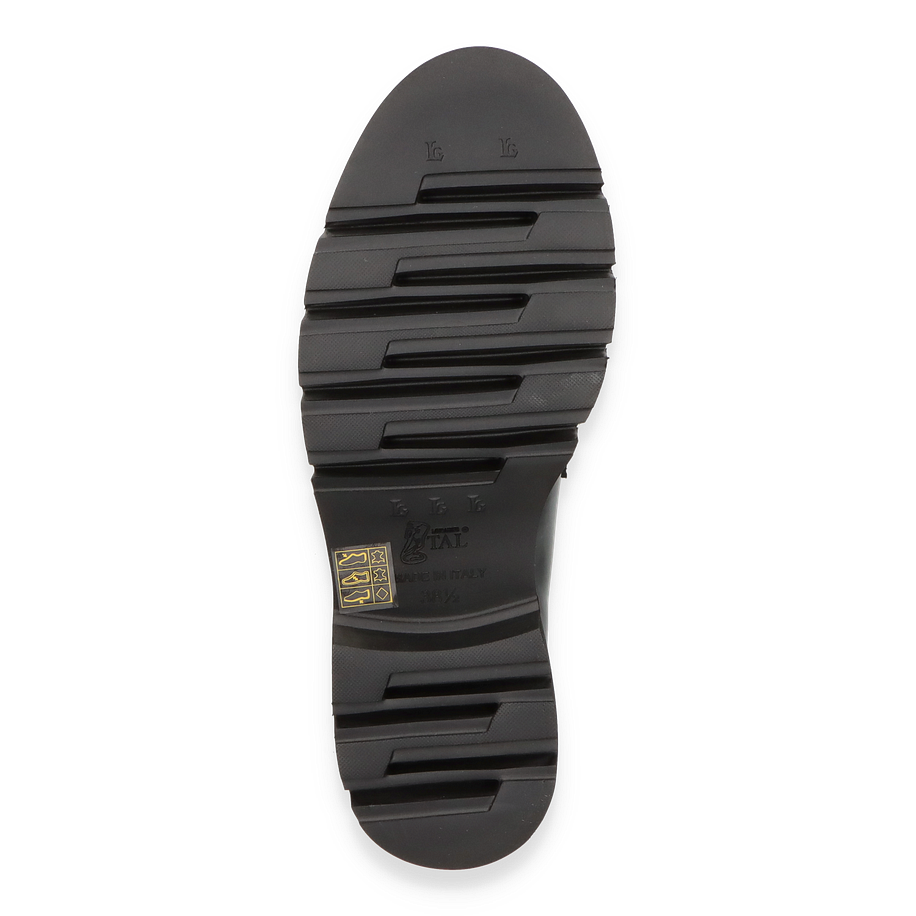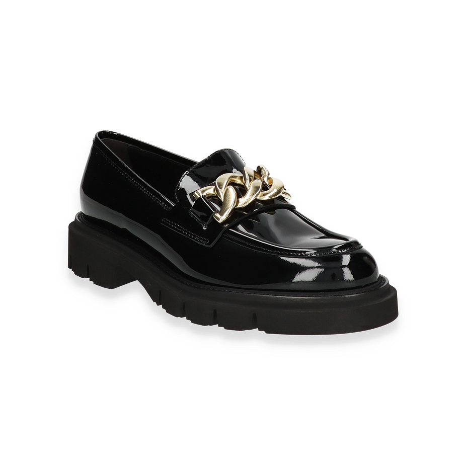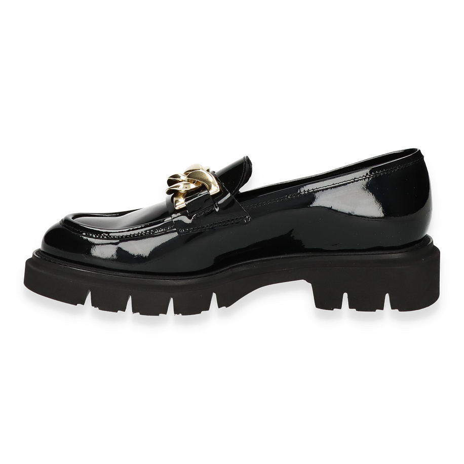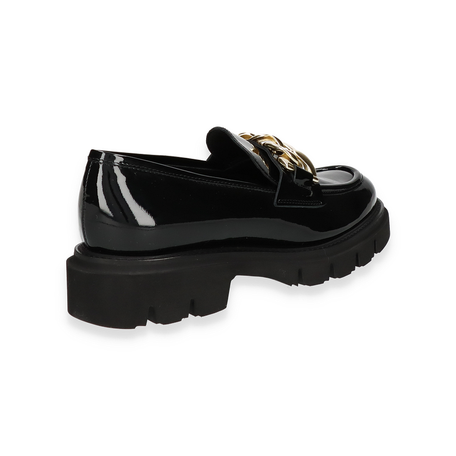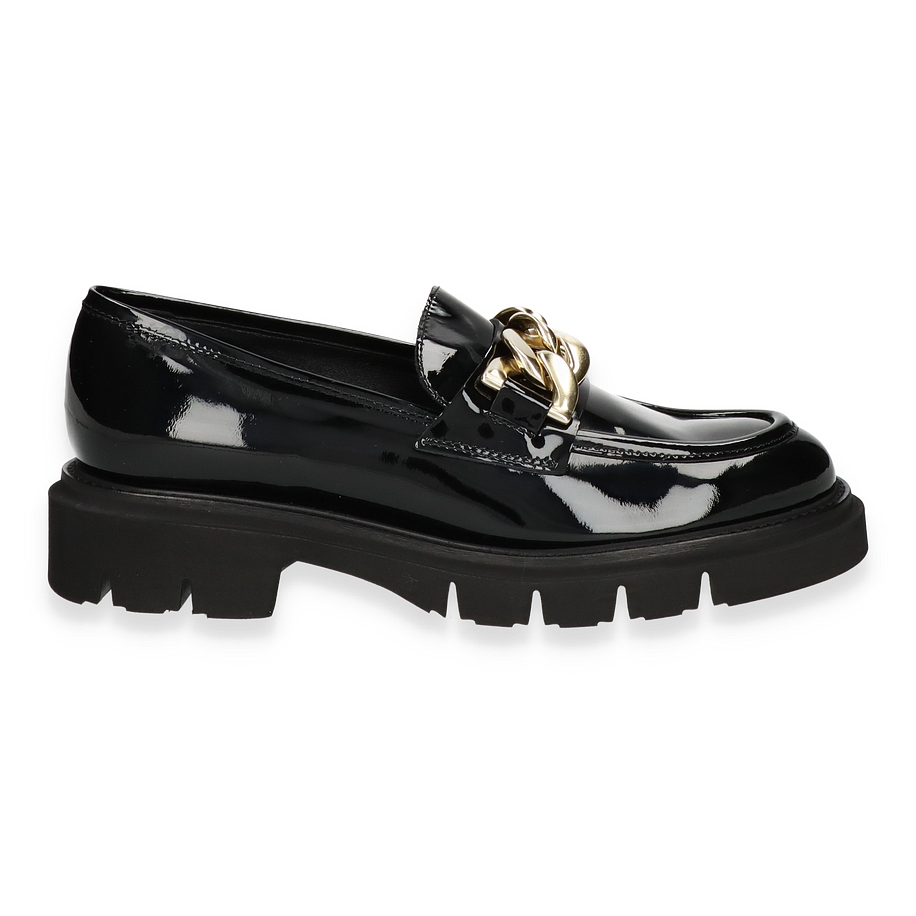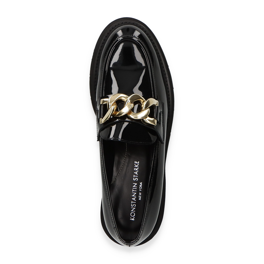 Sie kleiden sich gern modebewusst und ausgefallen und möchten dies auch in Ihren Bürolooks zeigen? Dann sind diese schicken Konstantin Starke Slipper für Damen genau das Richtige für Sie! Das schwarze Leder, aus welchem die modischen Damenschuhe gefertigt sind, verfügt über eine luxuriöse Lackoptik, wodurch die Slipper gleich eine Spur aufregender wirken. Zudem sind die schwarzen Schuhe mit robusten derben Profilsohlen aus schwarzem Gummi ausgestattet, welche nicht nur den coolen Stil betonen, sondern auch einen tollen Komfort versprechen. Die Kirsche auf der Torte bilden die groben goldfarbenen Kettenerzierungen am Spann, die für einen femininen Charme sorgen und als super Hingucker fungieren.