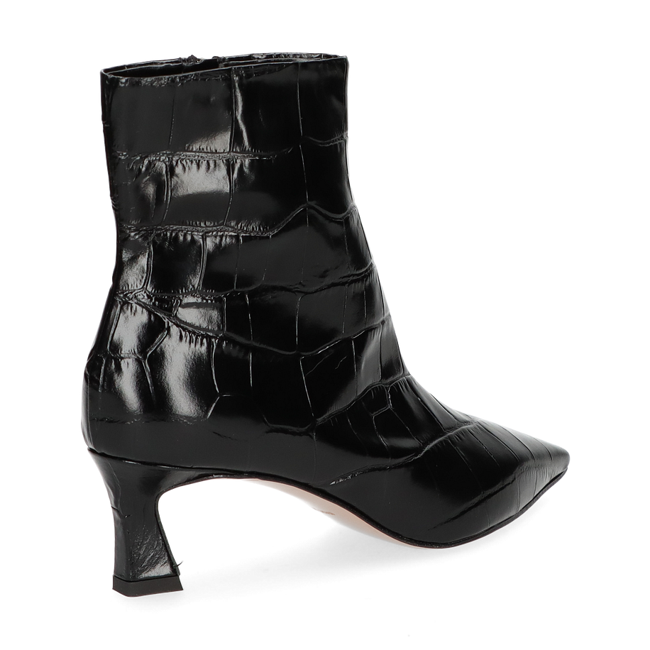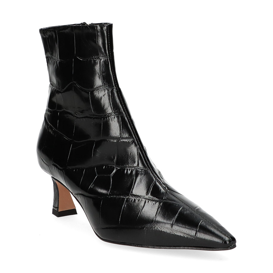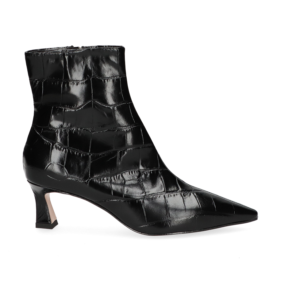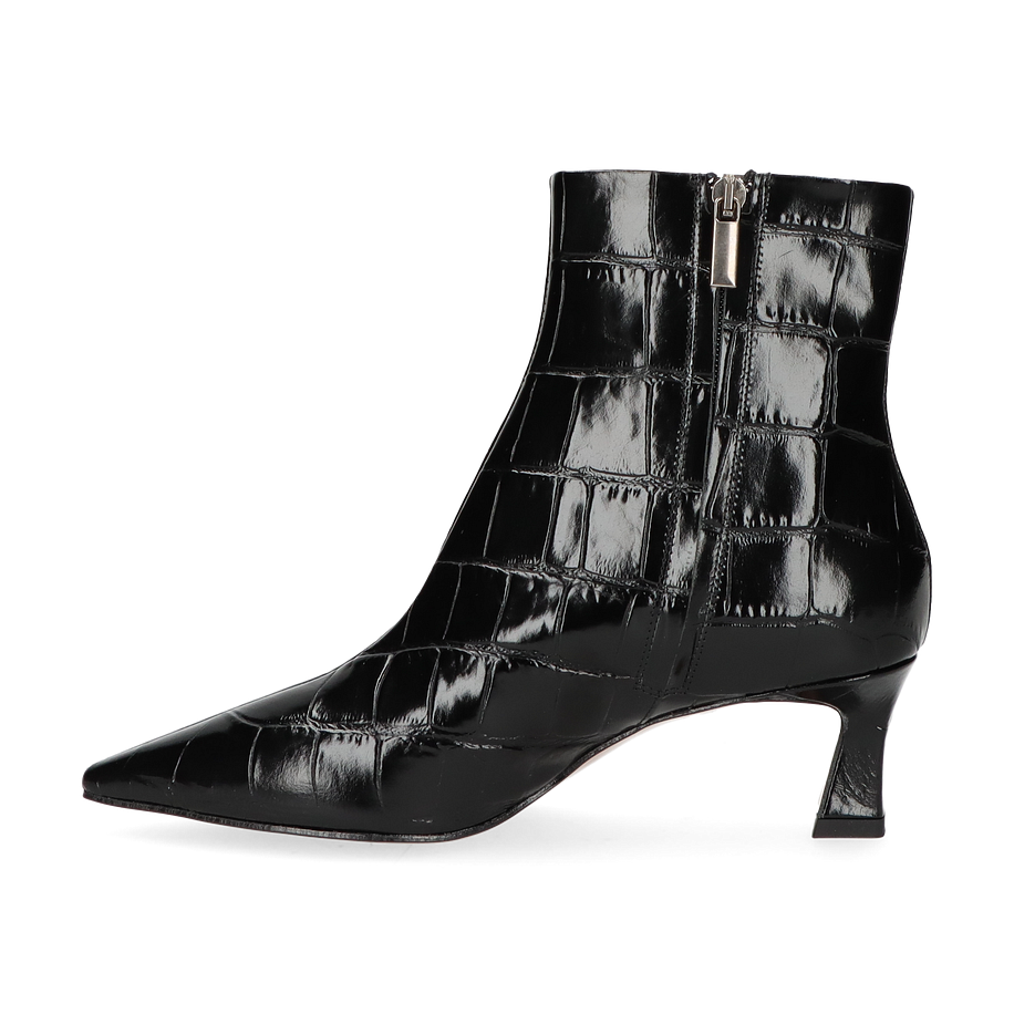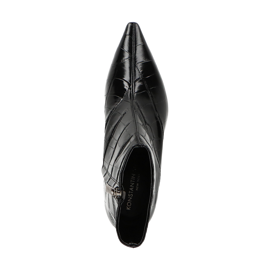 Die Konstantin Starke Klassische Stiefeletten für Damen präsentieren sich in einem eleganten Schwarz, das durch das hochwertige Leder mit Krokodilprägung einen luxuriösen Akzent erhält. Der schmale, spitz zulaufende Schnitt und der 4,5 cm hohe Absatz verleihen dem Schuh eine zeitlose Eleganz, die sowohl im Büro als auch bei besonderen Anlässen überzeugt. Der seitliche Reißverschluss ermöglicht ein einfaches An- und Ausziehen, während die raffinierte Silhouette den Fuß schmeichelhaft umschließt.