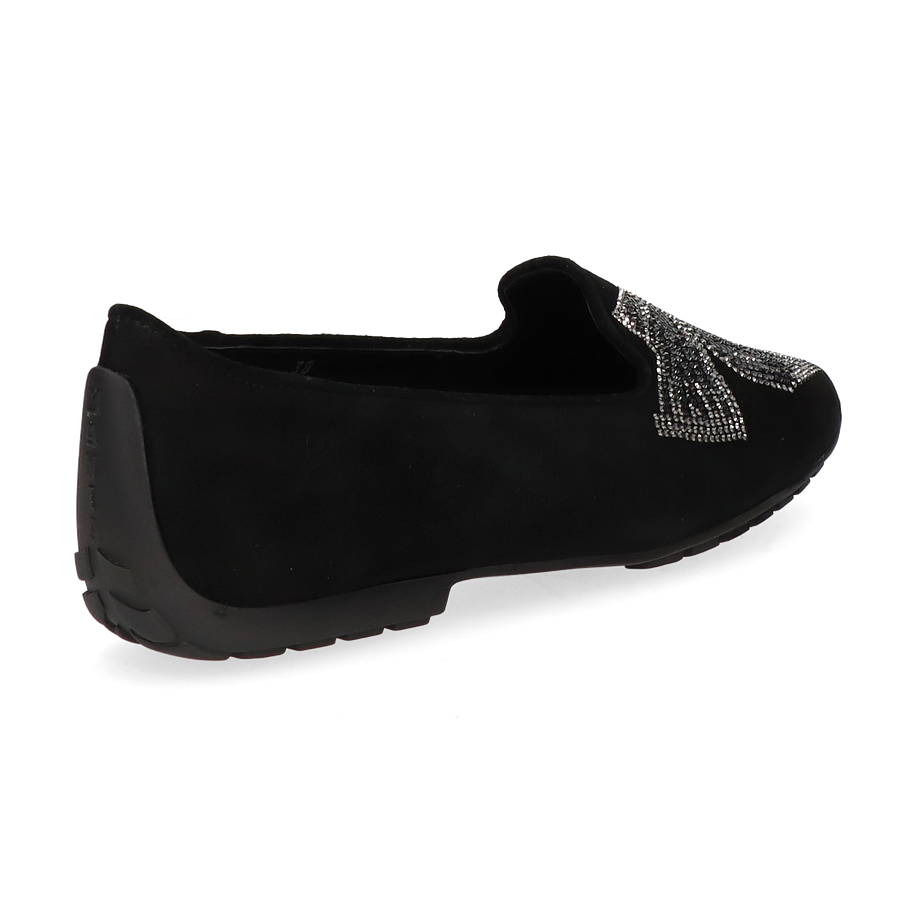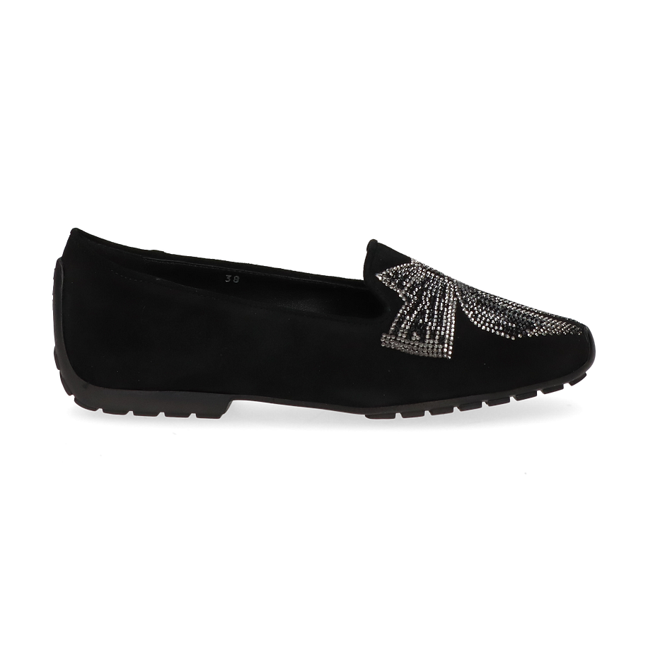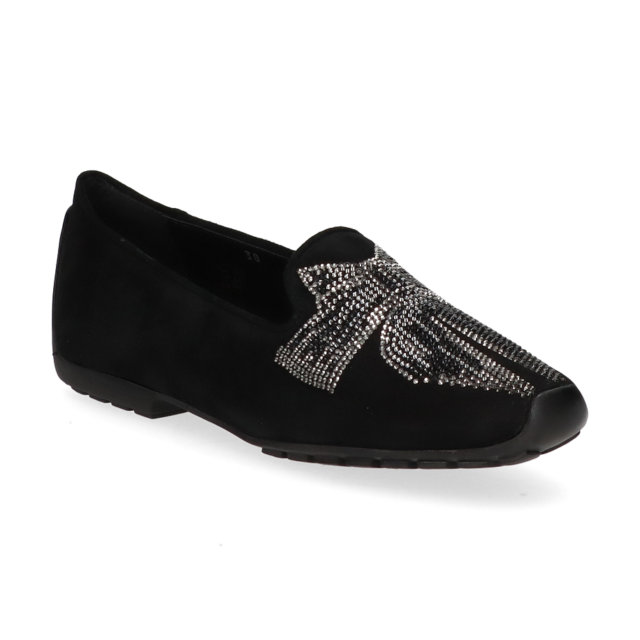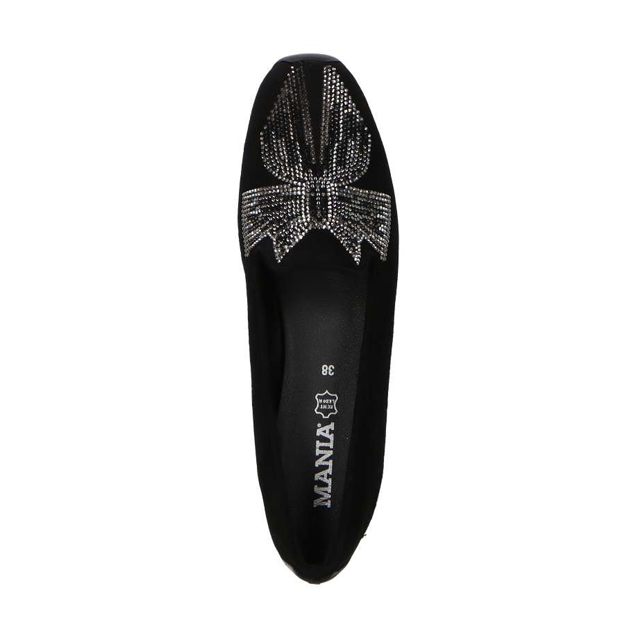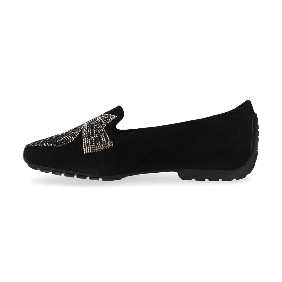 Der elegante Slipper von Mania in klassischem Schwarz besticht durch sein raffiniertes Design und die funkelnden Details auf der Vorderseite. Die glitzernden Applikationen verleihen dem Schuh einen Hauch von Glamour, der sowohl im Alltag als auch bei besonderen Anlässen für Damen überzeugt. Die flache Silhouette und die dezente Absatzhöhe von 1 cm sorgen für einen stilvollen und dennoch bequemen Auftritt.