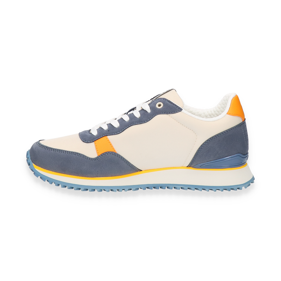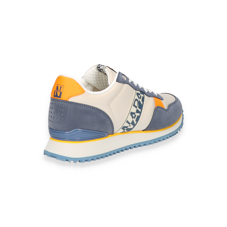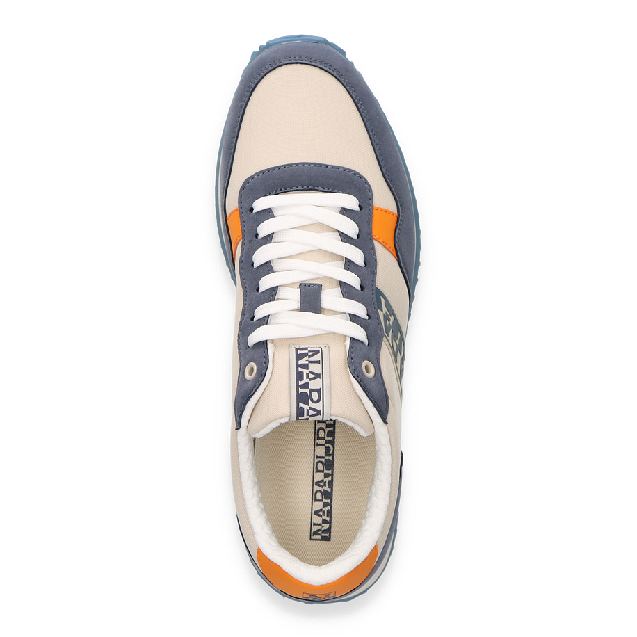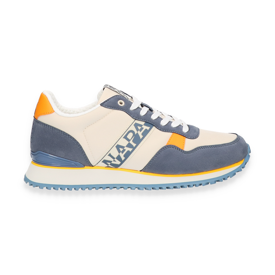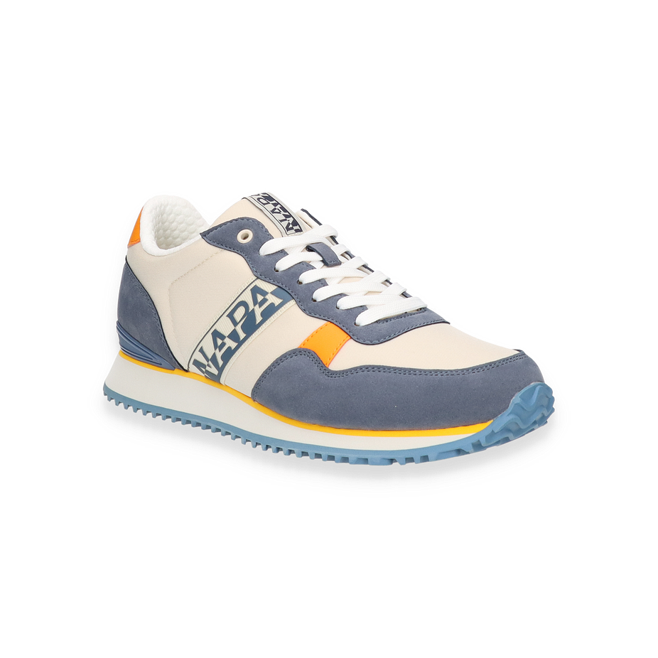 Der Napapijri Sneaker für Herren präsentiert sich in einem stilvollen Beige/Bunt-Design, das durch kontrastierende blaue und orangefarbene Akzente hervorsticht. Die Kombination aus Textil und sonstigem Material im Obermaterial verleiht dem Schuh eine moderne und dynamische Optik. Die sorgfältig gestalteten Details, wie das markante Napapijri-Logo und die harmonische Farbgebung, machen diesen Sneaker zu einem echten Hingucker. Die Gummisohle mit ihrem wellenförmigen Profil sorgt für optimalen Halt und unterstreicht das sportliche Design.
