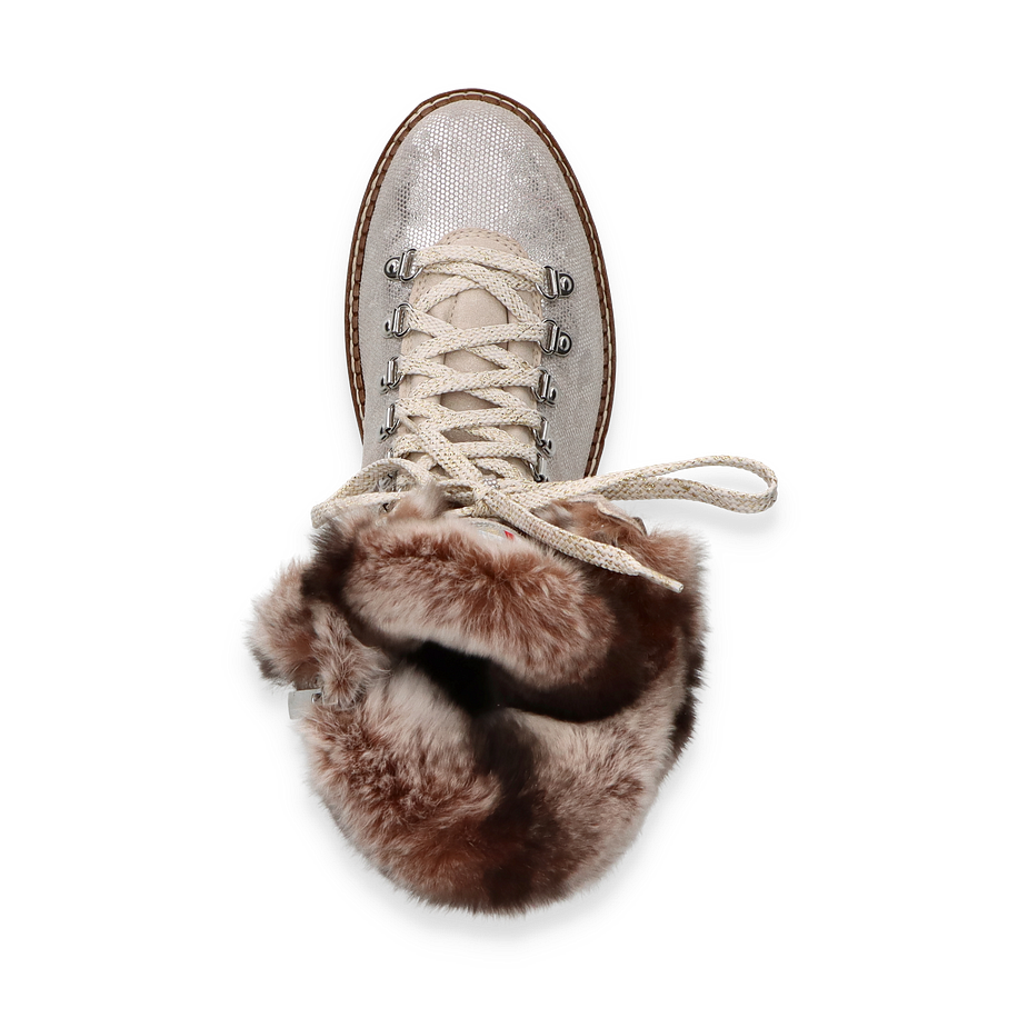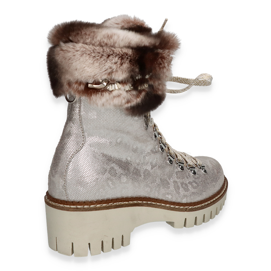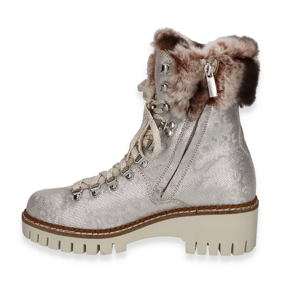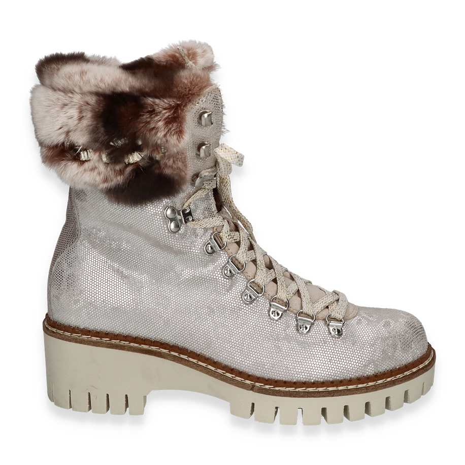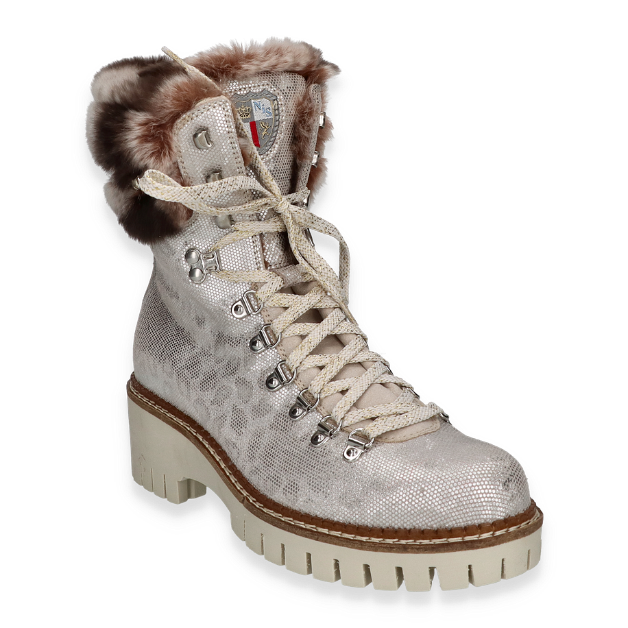 Preis inkl. MwSt.Die NIS New Italia Shoes Winterboots für Damen präsentieren sich in einem eleganten Silberton, der jedem Winteroutfit einen Hauch von Glamour verleiht. Die robuste Konstruktion mit einer Absatzhöhe von 5,5 cm bietet sowohl Stil als auch Stabilität. Der luxuriöse Pelzbesatz am Schaft sorgt nicht nur für zusätzliche Wärme, sondern auch für einen modischen Akzent. Die Schnürung und die metallischen Details unterstreichen das moderne Design und machen diese Stiefel zu einem unverzichtbaren Begleiter in der kalten Jahreszeit.