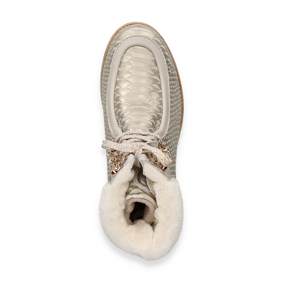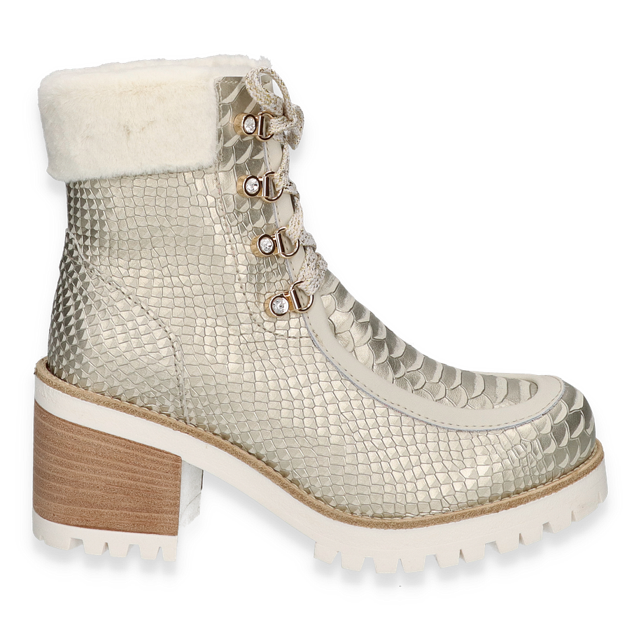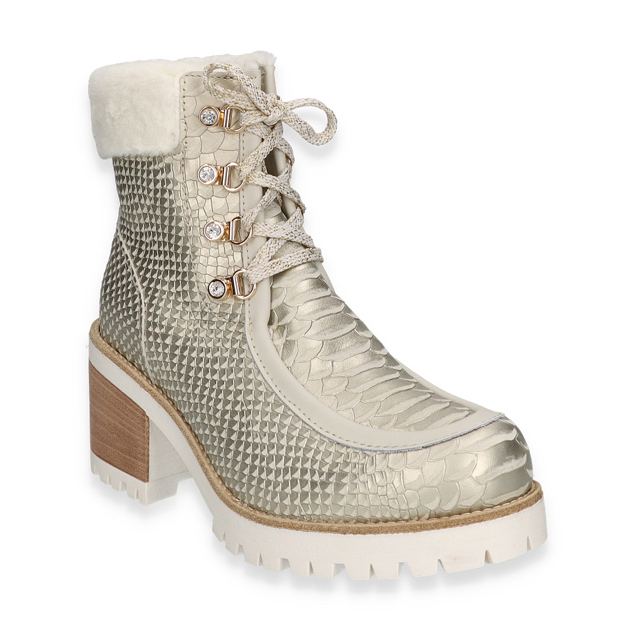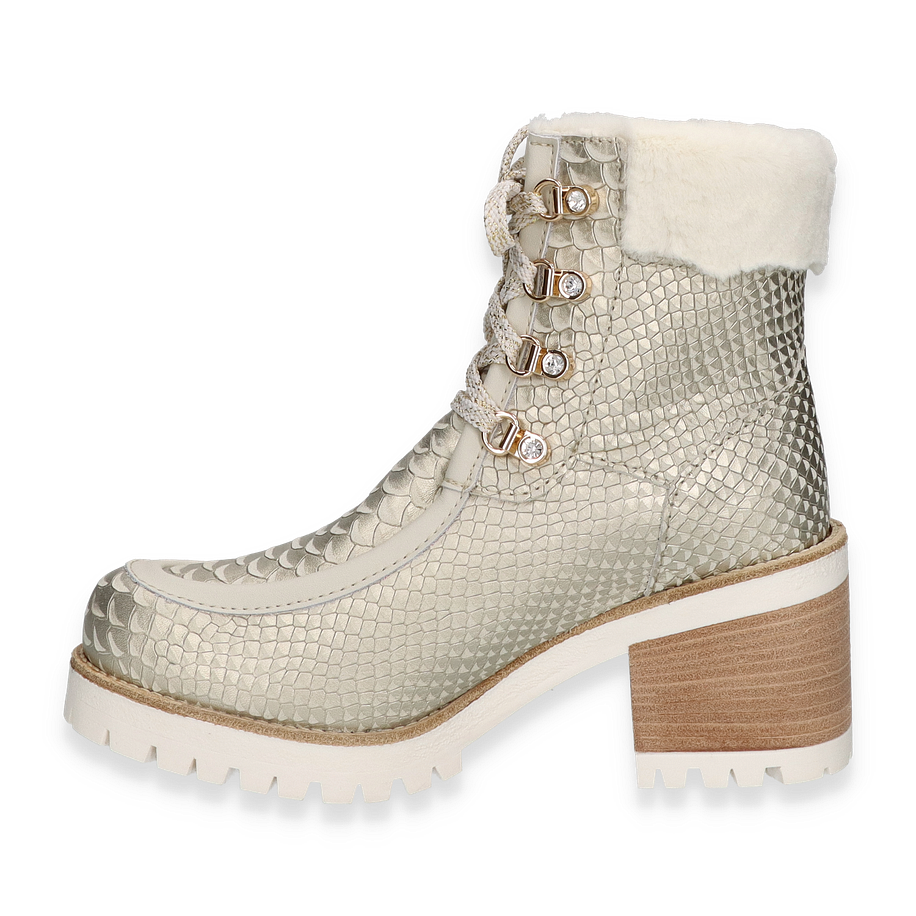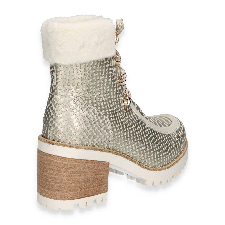 Entdecken Sie die stilvollen Winterboots von New Italian Shoes in elegantem Beige, die für Damen entworfen wurden. Diese Stiefel beeindrucken durch ihr einzigartiges Design mit einer strukturierten Leder/Textil-Oberfläche, die einen luxuriösen und modernen Look verleiht. Der 7,5 cm hohe Absatz sorgt für eine feminine Silhouette, während die robuste Gummisohle optimalen Halt auf winterlichen Untergründen bietet. Die warm gefütterte Innenseite garantiert Komfort und Wärme an kalten Tagen.