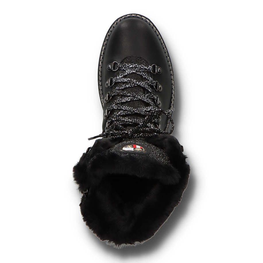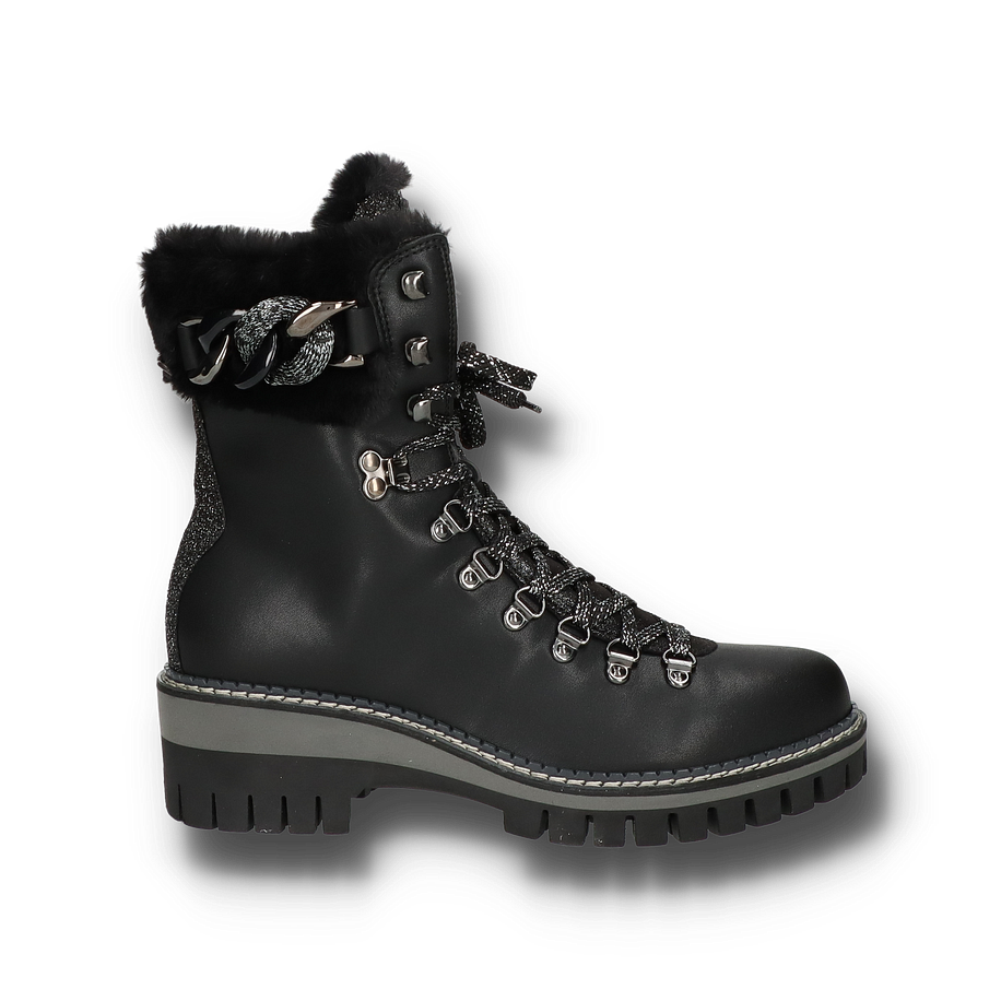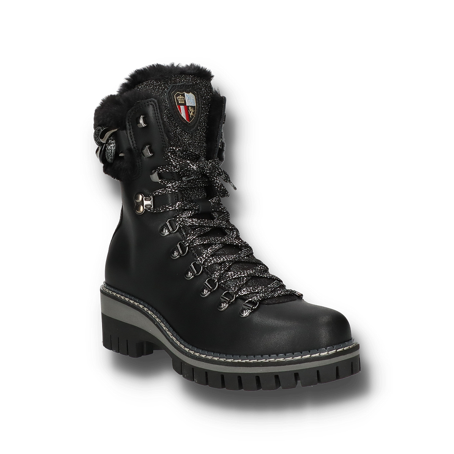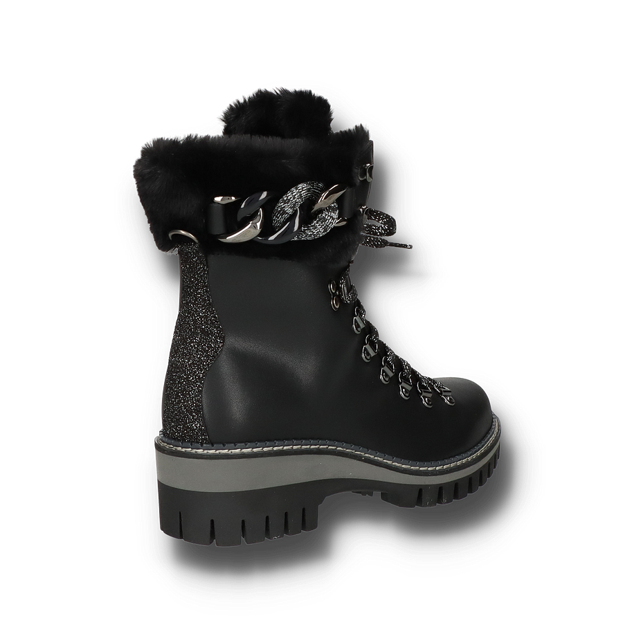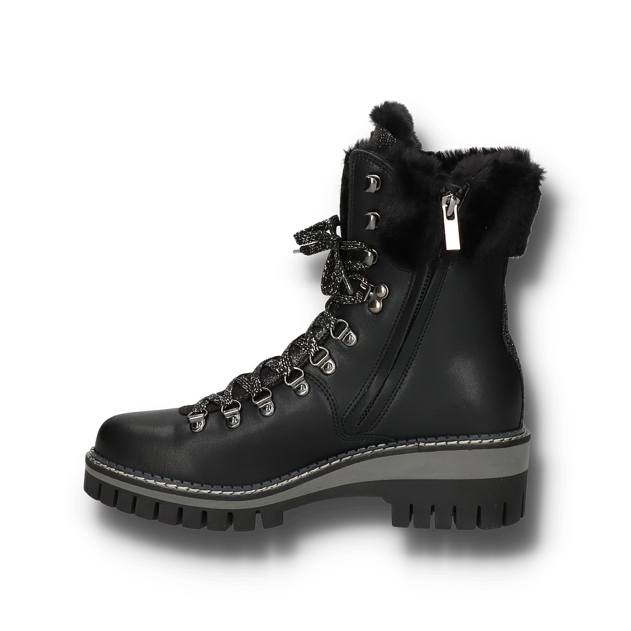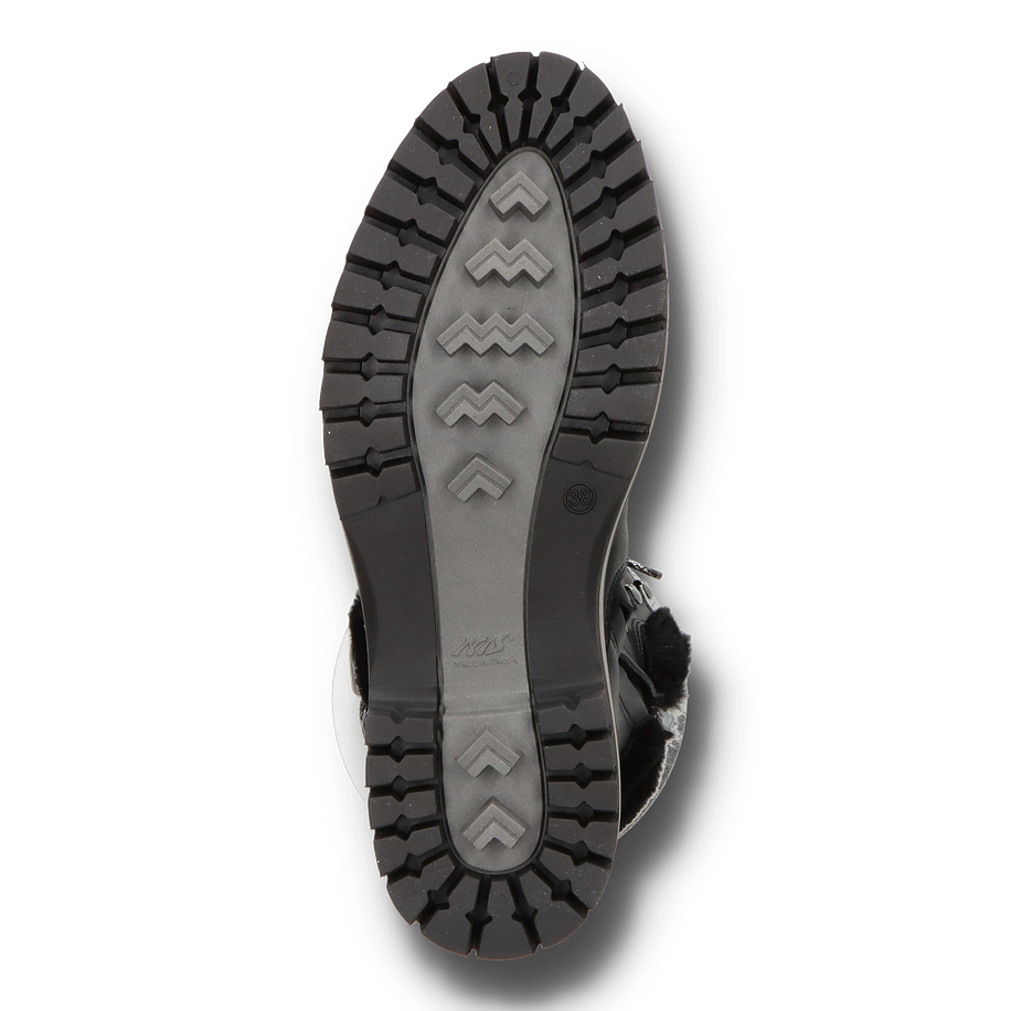 Die NIS Winterstiefel für Damen in elegantem Schwarz vereinen Stil und Funktionalität auf perfekte Weise. Das Obermaterial aus Leder und Textil sorgt für eine robuste und gleichzeitig modische Optik. Die Glitzer-Details und die dekorativen Schnürsenkel verleihen den Stiefeln einen Hauch von Glamour, während das Warmfutter für kuschelige Wärme an kalten Wintertagen sorgt. Der 5,5 cm hohe Absatz und die profilierte Gummisohle bieten optimalen Halt und Komfort auf rutschigen Oberflächen. Diese Winterstiefel sind mit einem Innenmaterial aus Textil ausgestattet, das für zusätzlichen Tragekomfort sorgt. Die Textil-Innensohle unterstützt die natürliche Fußform und bietet ein angenehmes Tragegefühl. Die robuste Gummisohle gewährleistet Langlebigkeit und hervorragende Traktion. Diese Stiefel sind die perfekte Wahl für stilbewusste Damen, die auch in der kalten Jahreszeit nicht auf modische Akzente verzichten möchten.