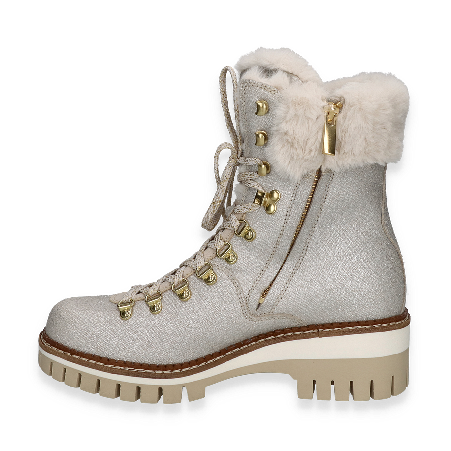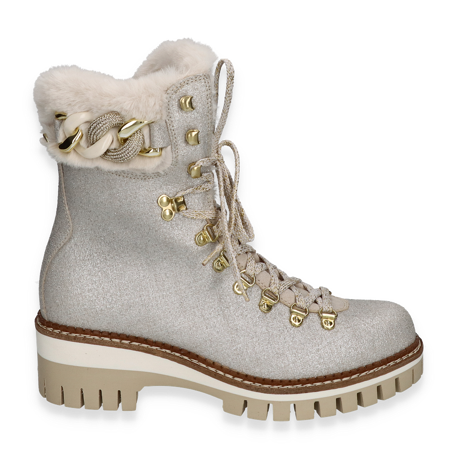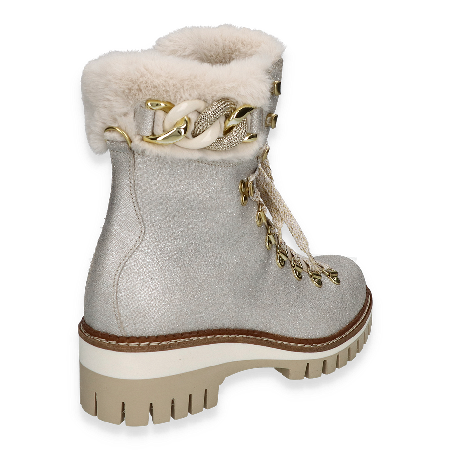 Die NIS Winterstiefel für Damen in elegantem Silber vereinen Stil und Funktionalität. Das Obermaterial aus Leder/Textil und die Glitzer-Optik verleihen diesen Stiefeln einen Hauch von Glamour, während das warme Futter für wohlige Wärme an kalten Wintertagen sorgt. Die robuste Sohle und der 5,5 cm hohe Absatz bieten optimalen Halt und Komfort. Die goldfarbenen Details und die Schnürung runden das stilvolle Design ab und machen diese Stiefel zu einem echten Hingucker. Diese Winterstiefel von NIS sind mit einem Innenmaterial aus Textil ausgestattet, das für zusätzlichen Tragekomfort sorgt. Die Textil-Innensohle und die Gummisohle bieten eine hervorragende Dämpfung und Rutschfestigkeit. Die Kombination aus hochwertigen Materialien und durchdachtem Design macht diese Stiefel zur perfekten Wahl für die kalte Jahreszeit.