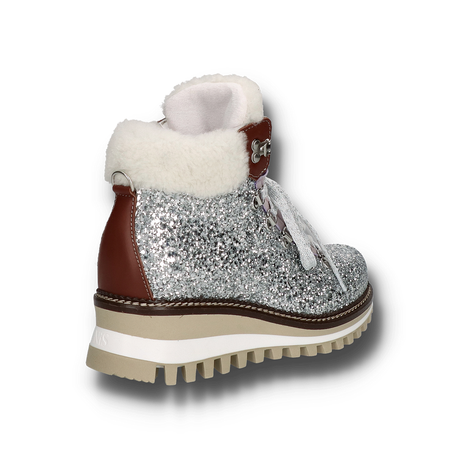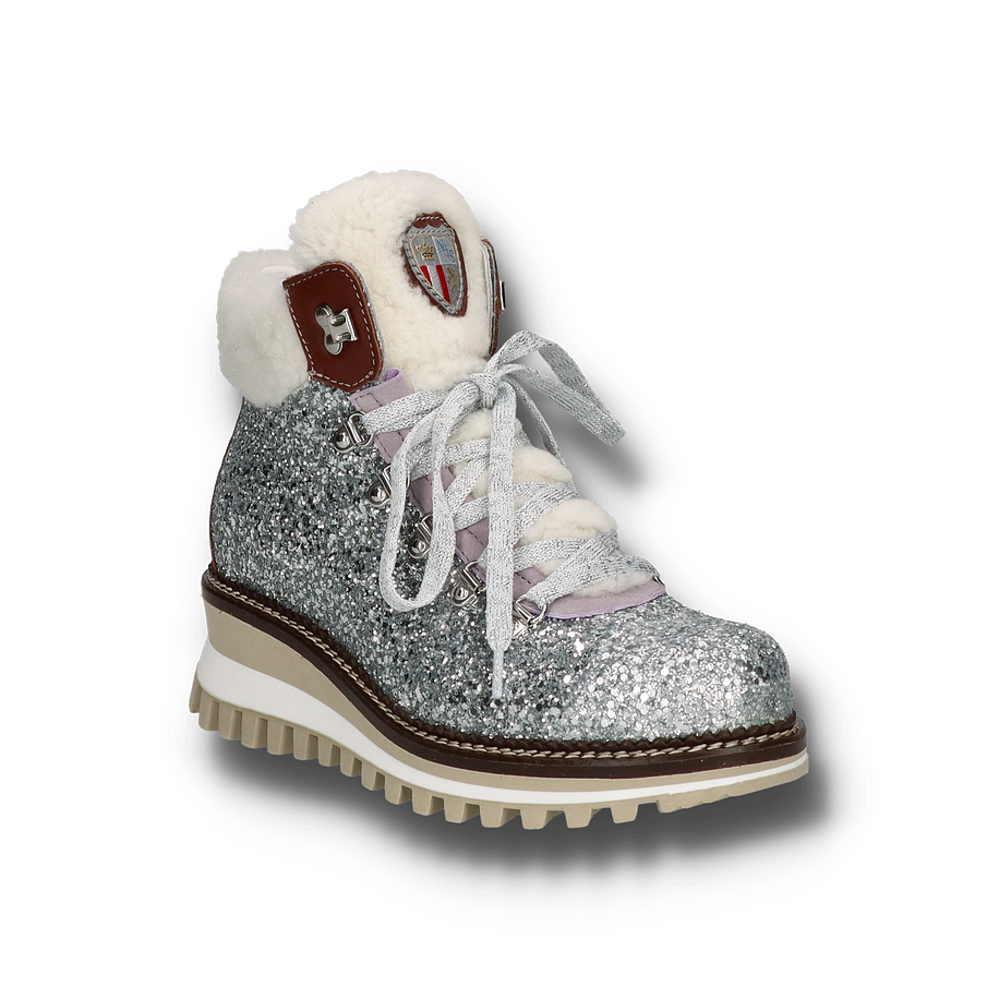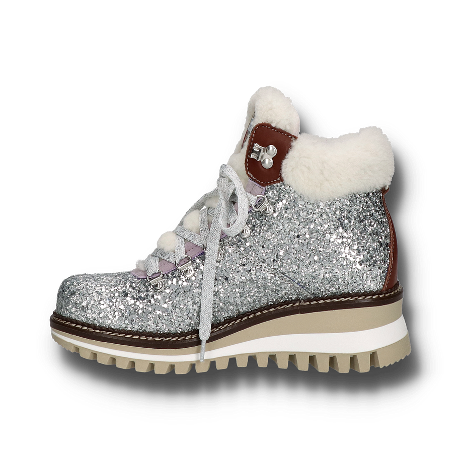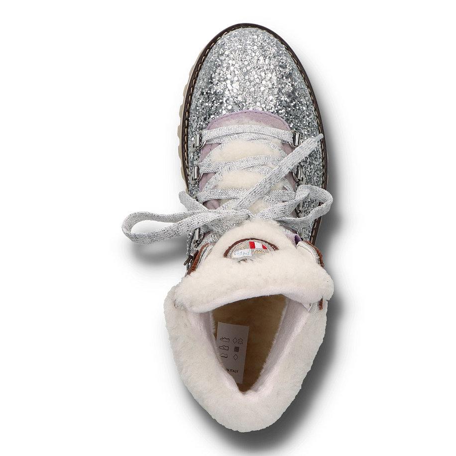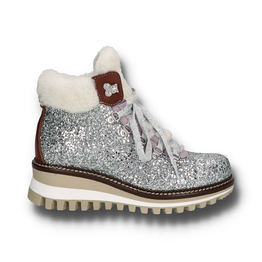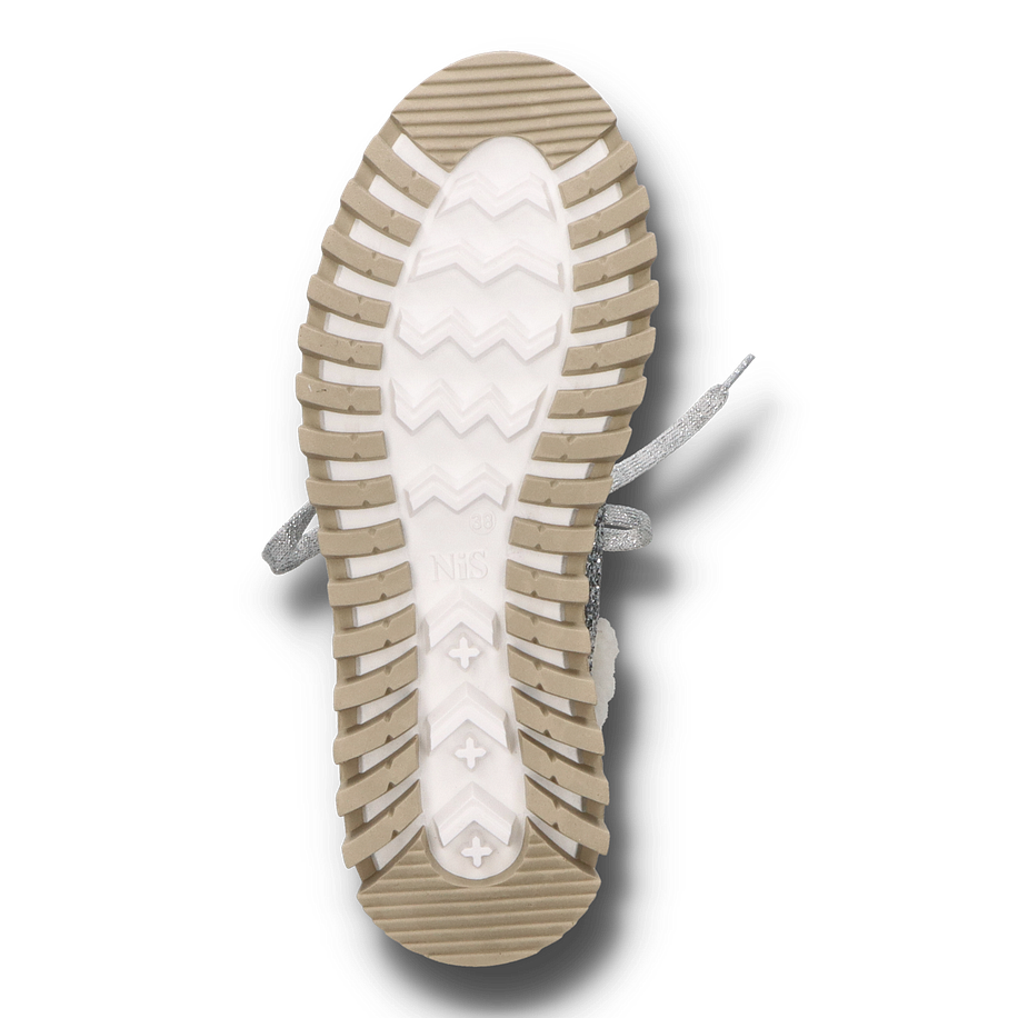 Die Winterstiefel von NIS für Damen vereinen Stil und Funktionalität in einem auffälligen Design. Das silberne Glitzer-Optik Obermaterial zieht alle Blicke auf sich und wird durch braune Akzente an der Ferse und den Schnürsenkeln ergänzt. Die robuste Sohle mit tiefem Profil sorgt für optimalen Halt auf winterlichen Untergründen, während das Warmfutter im Inneren des Stiefels für angenehme Wärme und Komfort sorgt. Die Schnürung und die dekorativen Metallösen verleihen dem Schuh einen sportlichen Look, der perfekt zu winterlichen Outfits passt. Diese Winterstiefel bieten zahlreiche hochwertige Merkmale, die sie zu einer ausgezeichneten Wahl für kalte Tage machen. Das Obermaterial besteht aus einer Kombination von sonstigem Material und Leder, während das Innenmaterial sowie die Innensohle aus weichem Textil gefertigt sind, um maximalen Tragekomfort zu gewährleisten. Die 5 cm hohe Ferse bietet eine angenehme Erhöhung, ohne auf Stabilität zu verzichten. Die Gummisohle sorgt für Langlebigkeit und hervorragende Traktion, ideal für winterliche Bedingungen.