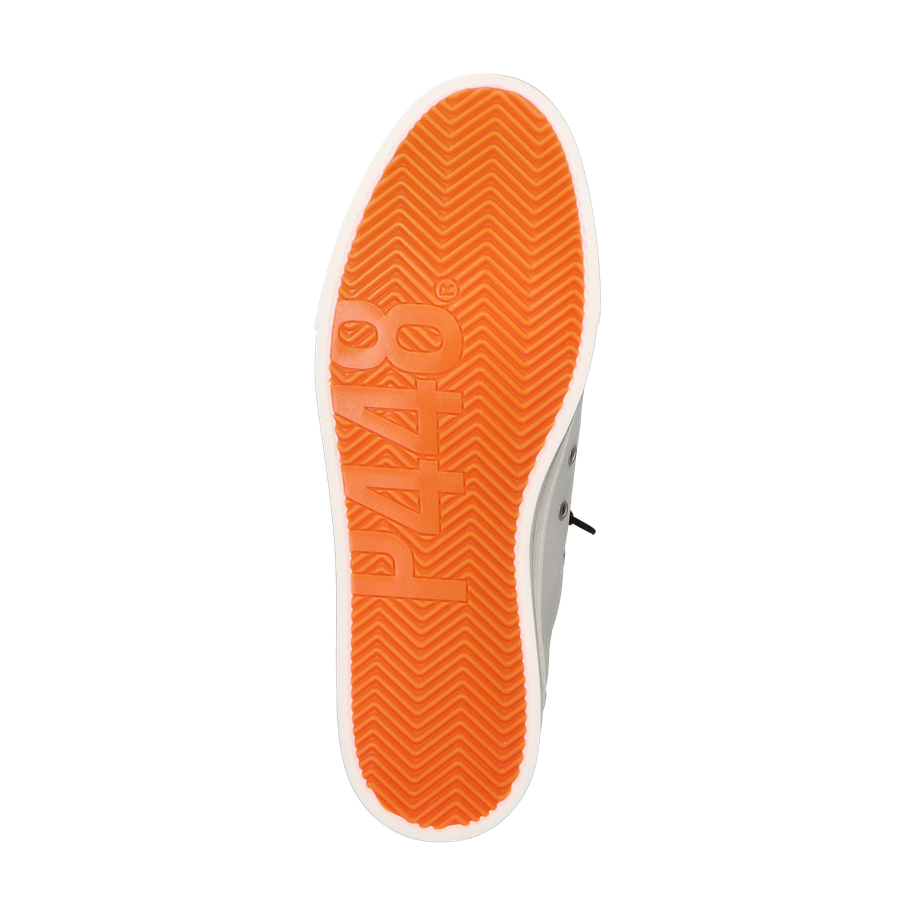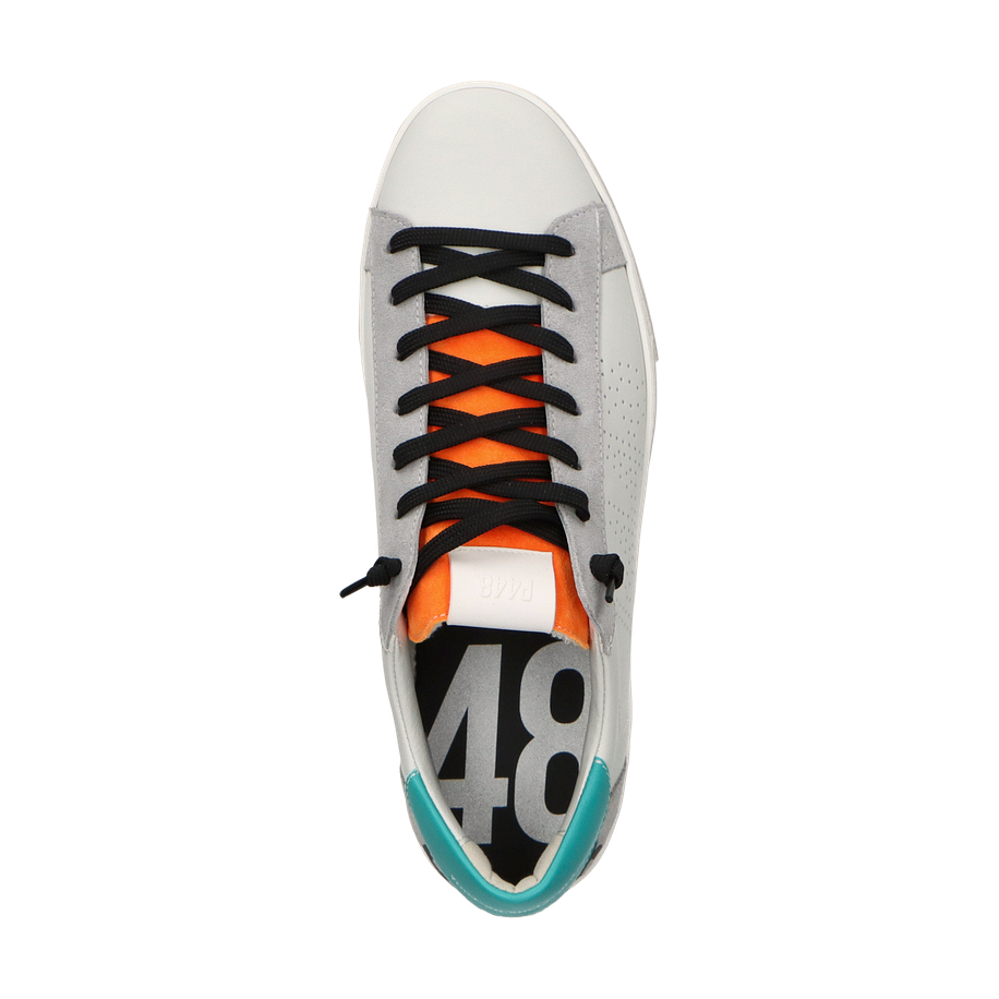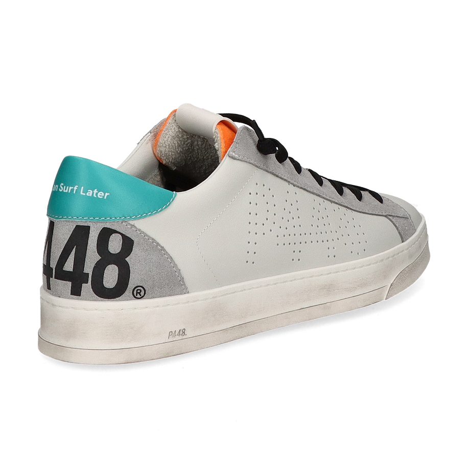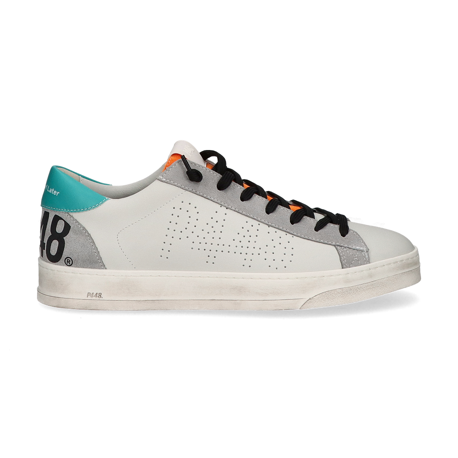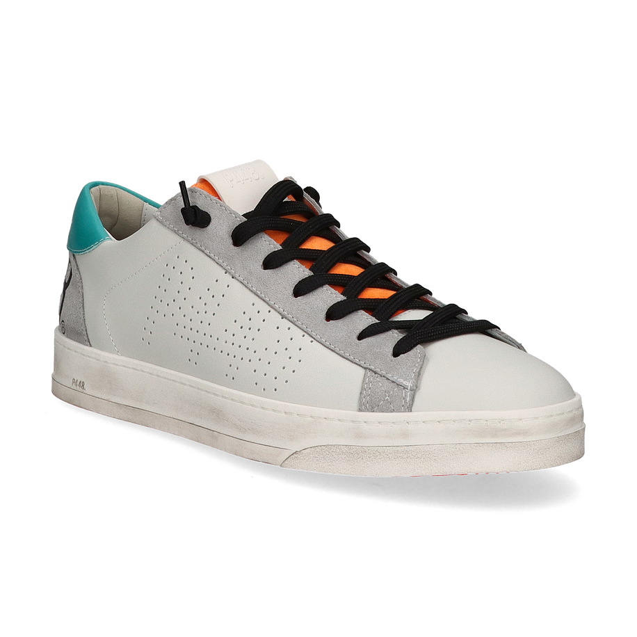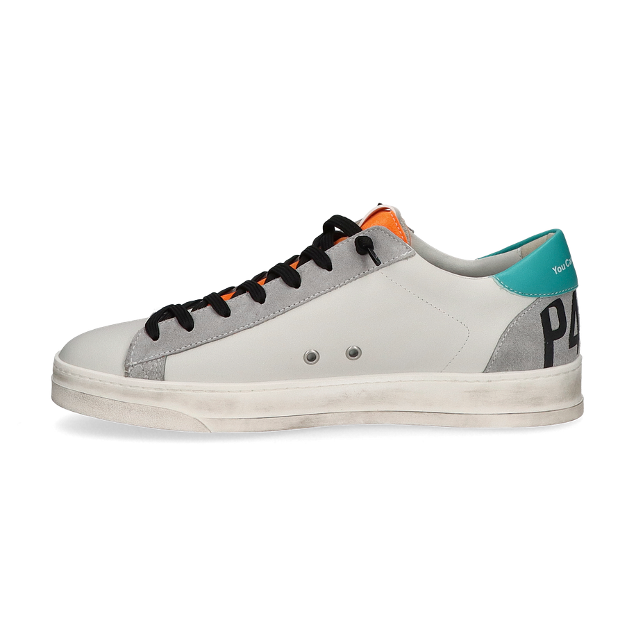 Preis inkl. MwSt.Der P448 Sneaker "JACK" für Herren präsentiert sich in einem stilvollen Design, das durch seine weiße Lederoberfläche und subtile graue Akzente besticht. Die perforierten Details verleihen dem Schuh eine moderne Note, während die kontrastierenden schwarzen Schnürsenkel und der auffällige orangefarbene Akzent an der Zunge für einen Hauch von Farbe sorgen. Der türkisfarbene Fersenbereich setzt einen frischen Akzent und rundet das Gesamtbild ab. Dieser Sneaker vereint urbanen Chic mit sportlicher Eleganz und ist ein echter Hingucker für modebewusste Herren.