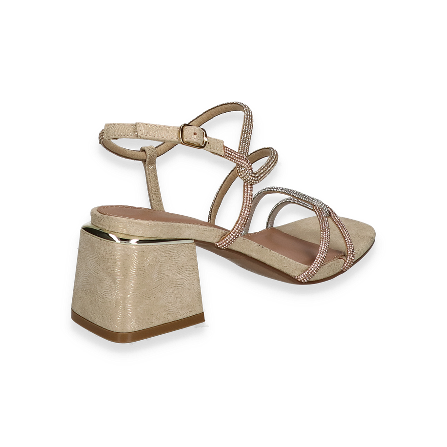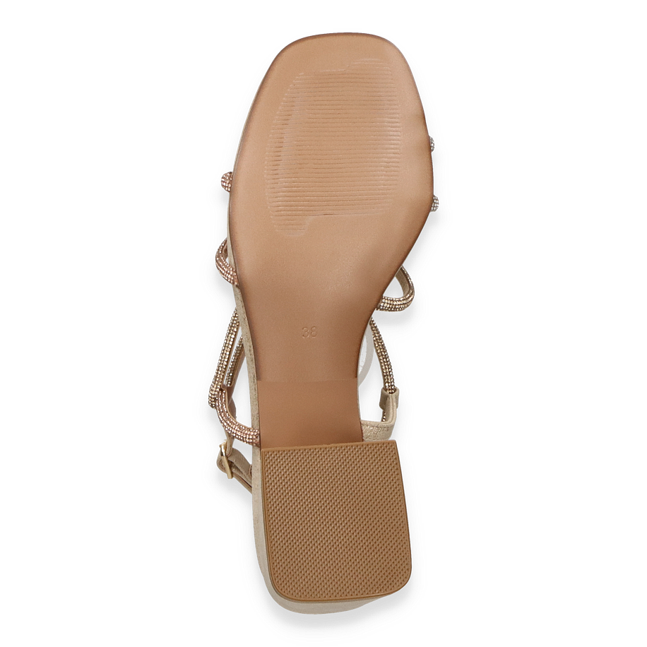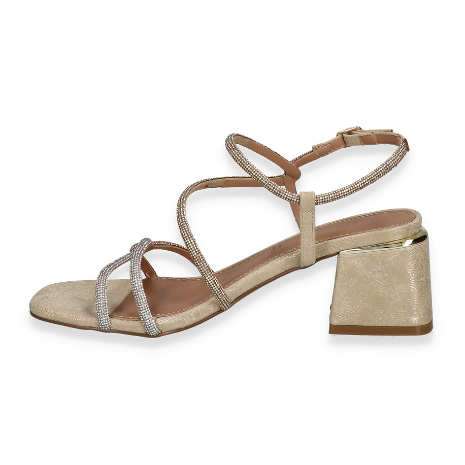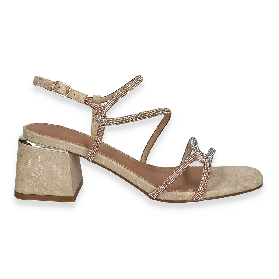 Preis inkl. MwSt.Die Paul Barritt Sandalette CARMEN in elegantem Goldton ist ein stilvolles Highlight für Damen. Die zarten Riemen sind mit funkelnden Details verziert, die jedem Outfit einen Hauch von Glamour verleihen. Der Blockabsatz mit einer Höhe von 6,5 cm sorgt für einen sicheren Stand und betont die feminine Silhouette. Die offene Zehenpartie und die verstellbare Schnalle bieten sowohl Komfort als auch eine perfekte Passform, ideal für besondere Anlässe oder einen eleganten Abend.
